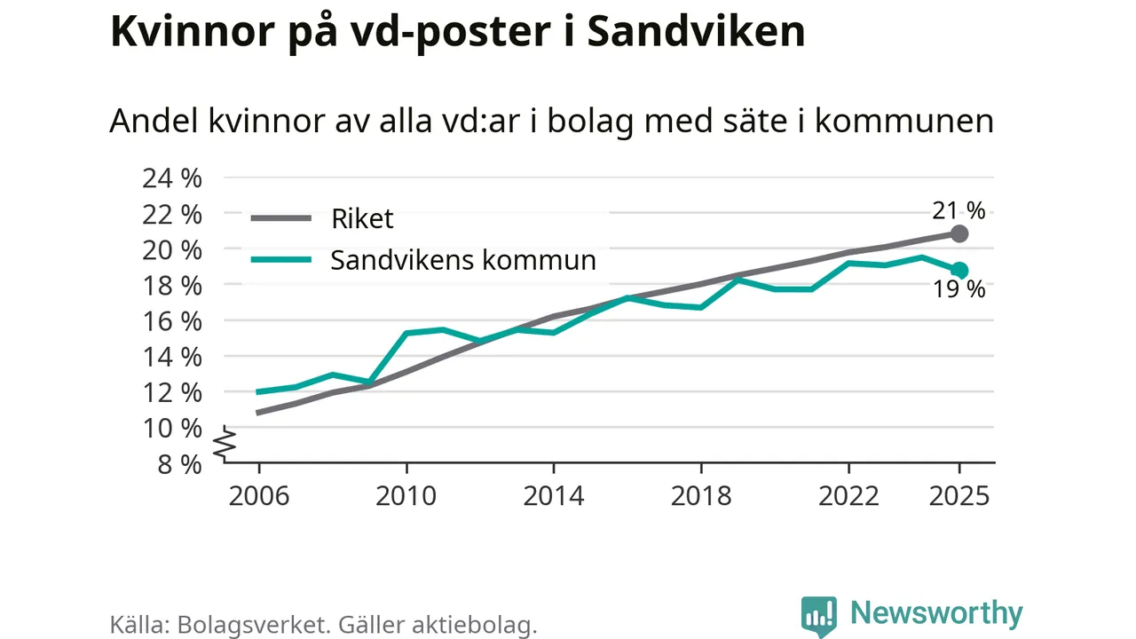 19 procent av aktiebolagen med registrerad vd i Sandviken hade en kvinna på posten vid årsskiftet. Det innebär att på varje kvinnlig vd går fyra män.