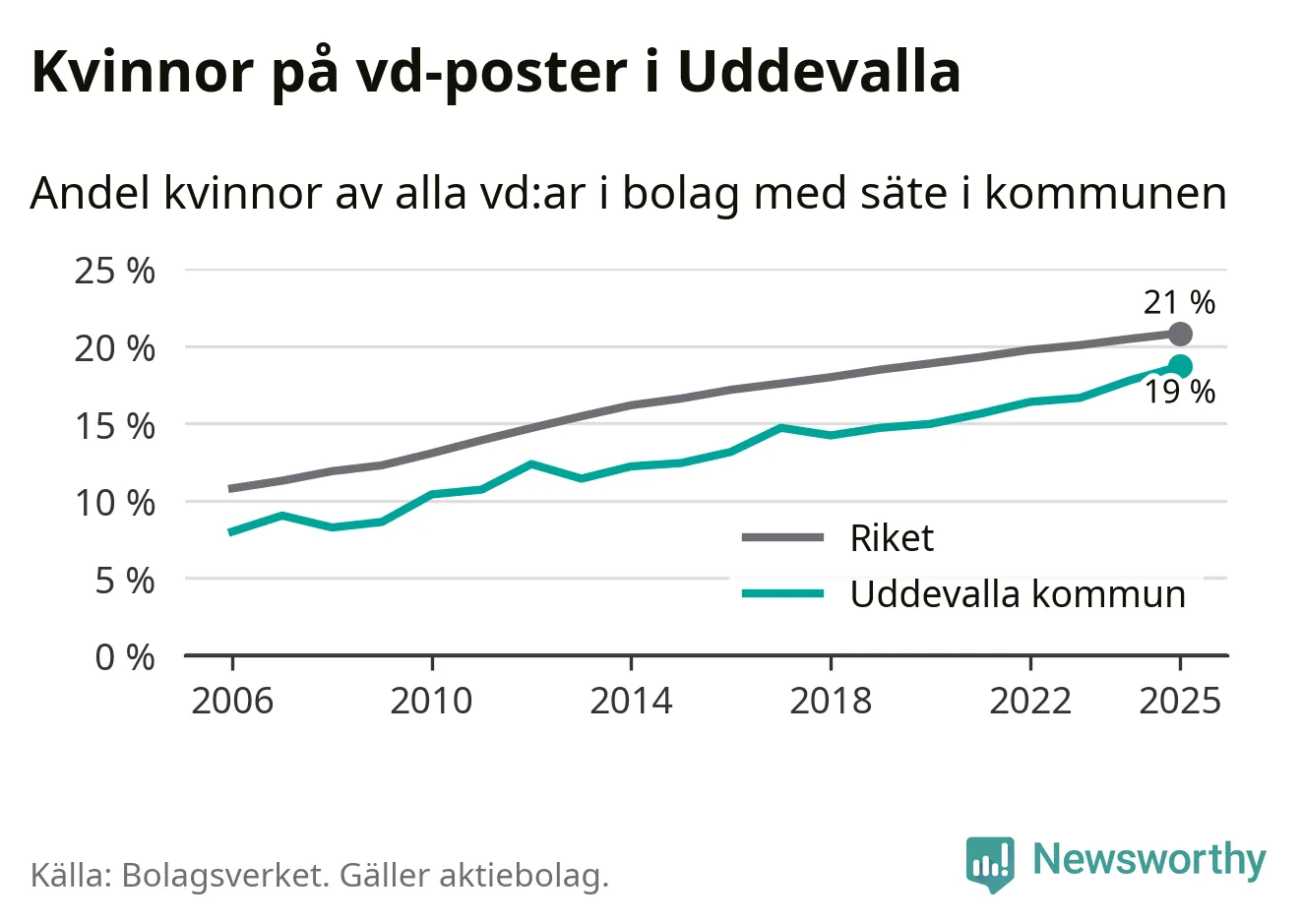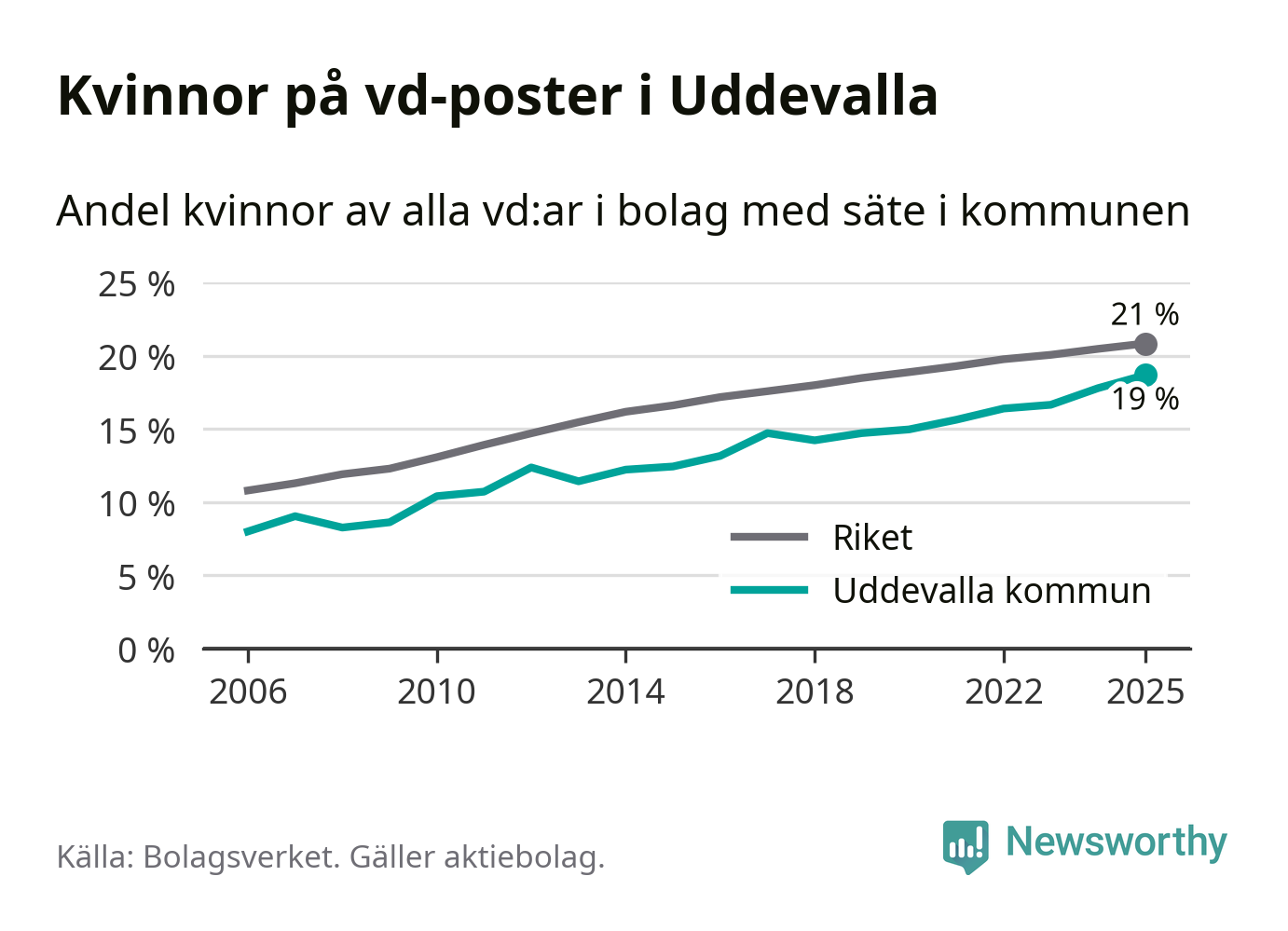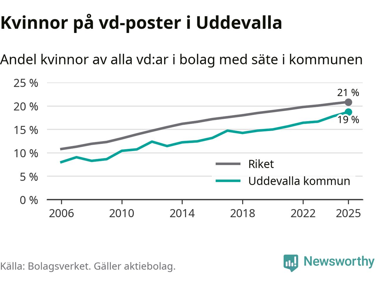 Det är fortfarande män som är vd i nästan fyra av fem bolag i Sverige och i Uddevalla är det alltså en något lägre andel kvinnor på vd-posten. Högst andel kvinnliga vd:ar i Västra Götaland har företagen med säte i Dals-Eds kommun, 31 procent. Där rör det sig dock om relativt få företag – 45 stycken totalt – och även små förändringar får stora utslag i andelen kvinnliga vd:ar. Lägst är andelen bland företagen med säte i Munkedals kommun, 9 procent.