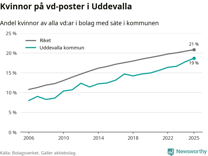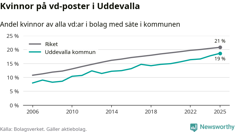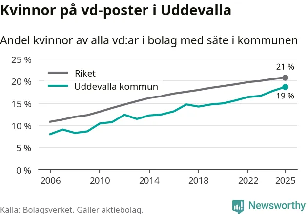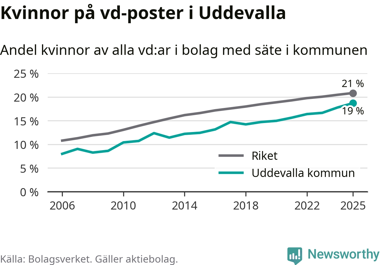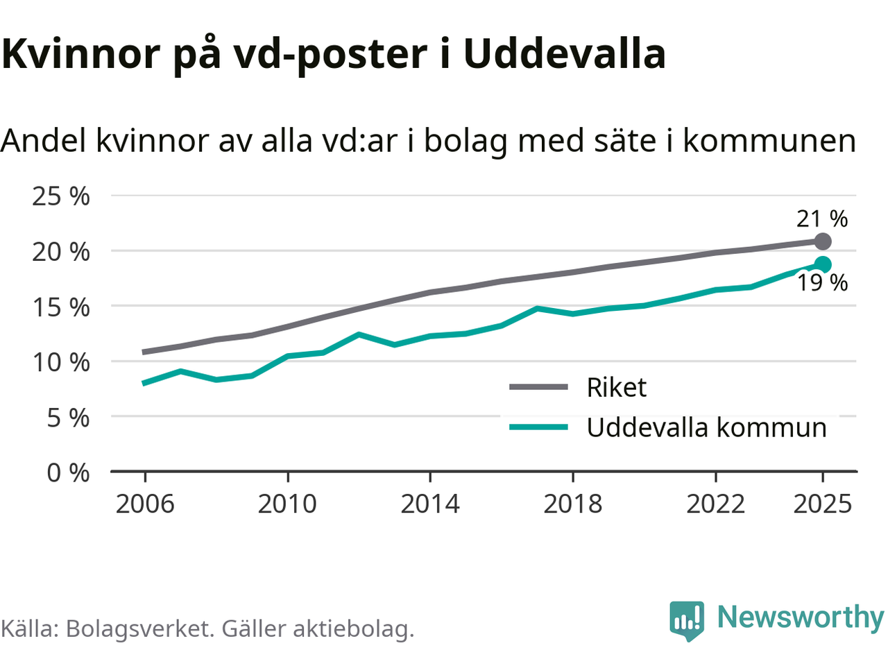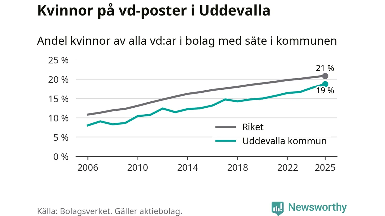 Det är fortfarande män som är vd i nästan fyra av fem bolag i Sverige och i Uddevalla är det alltså en något lägre andel kvinnor på vd-posten. Högst andel kvinnliga vd:ar i Västra Götaland har företagen med säte i Dals-Eds kommun, 31 procent. Där rör det sig dock om relativt få företag – 45 stycken totalt – och även små förändringar får stora utslag i andelen kvinnliga vd:ar. Lägst är andelen bland företagen med säte i Munkedals kommun, 9 procent.