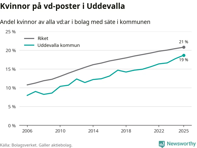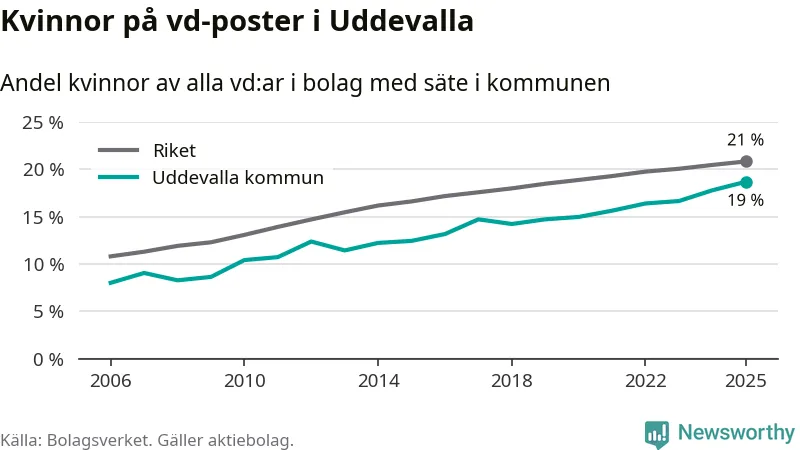 19 procent av aktiebolagen med registrerad vd i Uddevalla hade en kvinna på posten vid årsskiftet. Det innebär att på varje kvinnlig vd går fyra män.