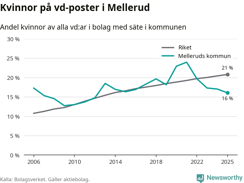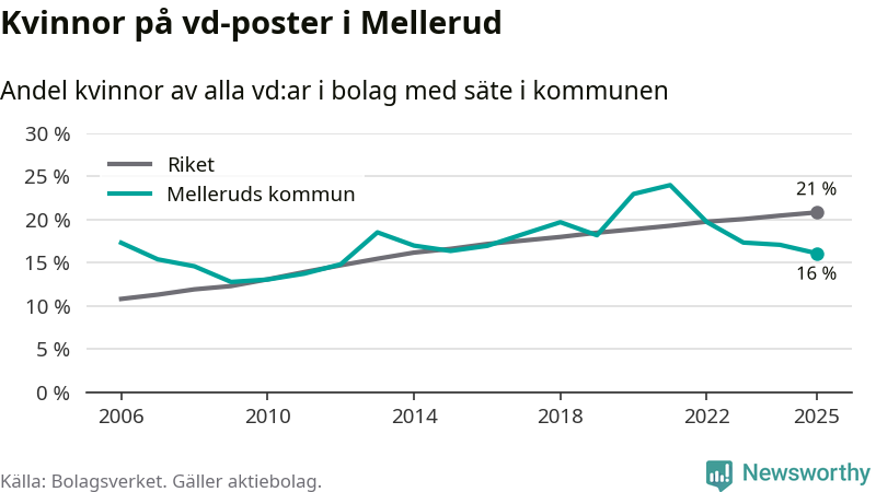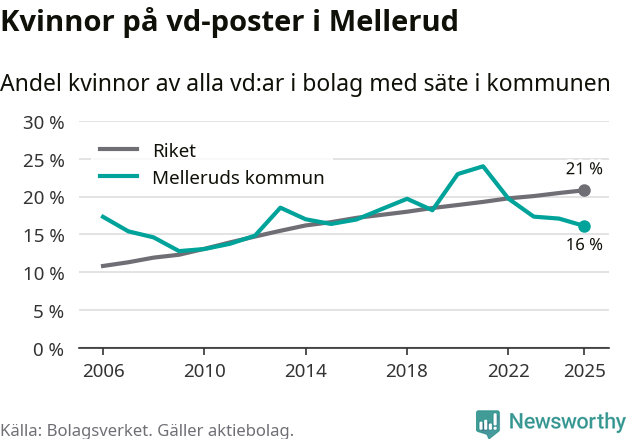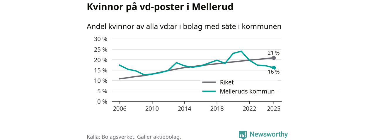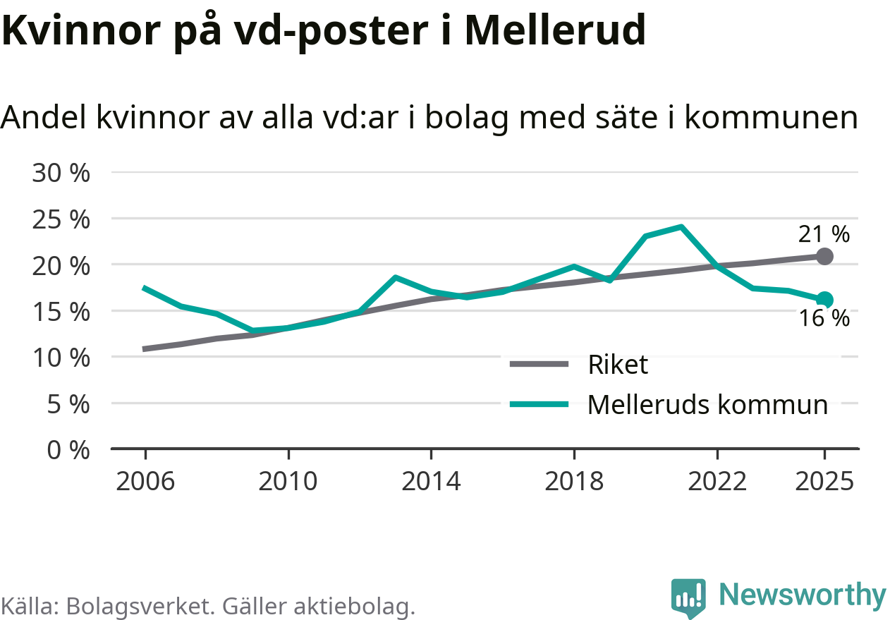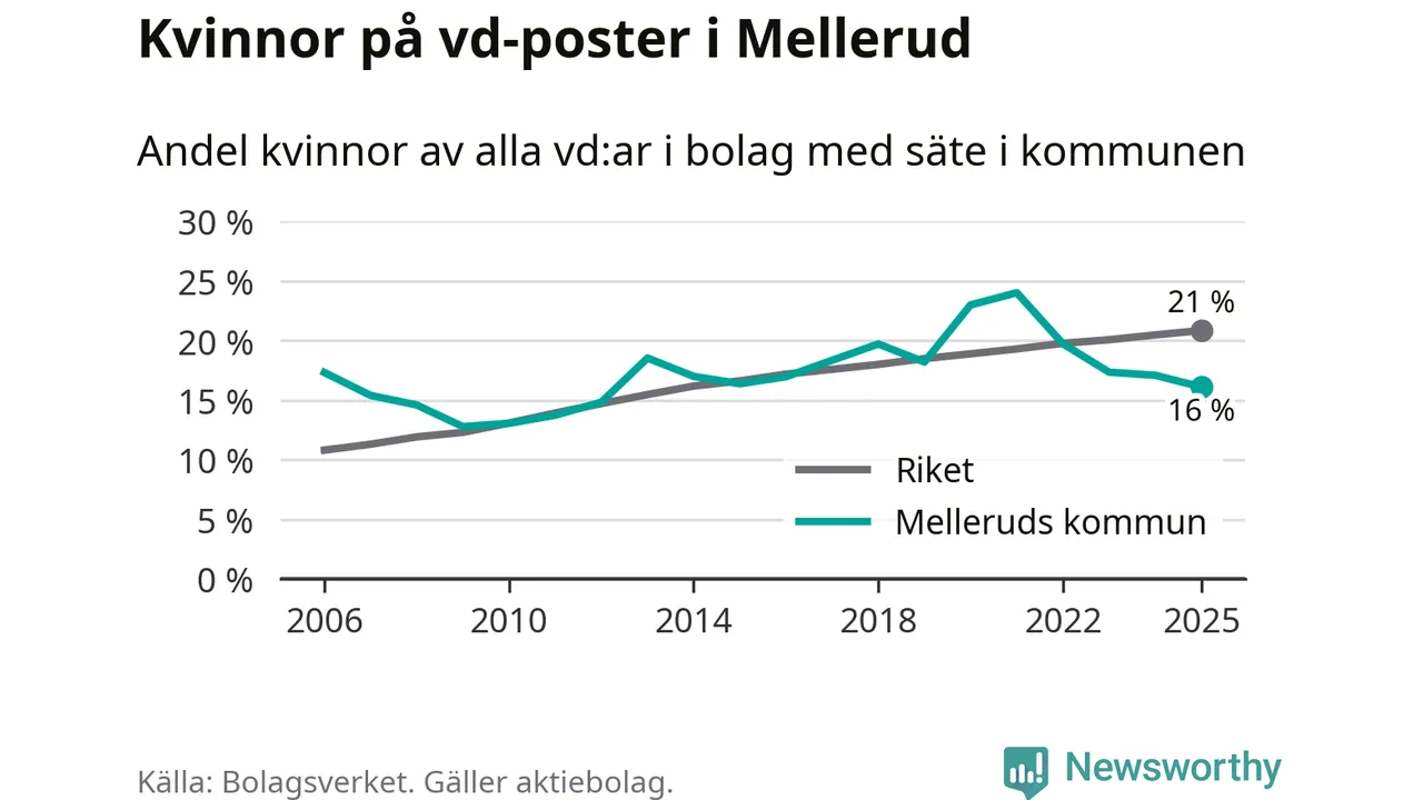 16 procent av aktiebolagen med registrerad vd i Mellerud hade en kvinna på posten vid årsskiftet. Det innebär att på varje kvinnlig vd går fem män.