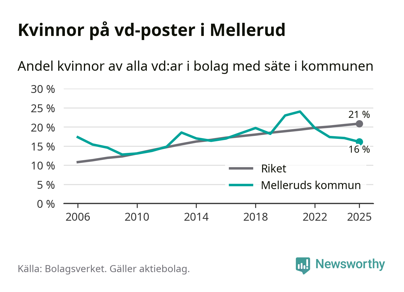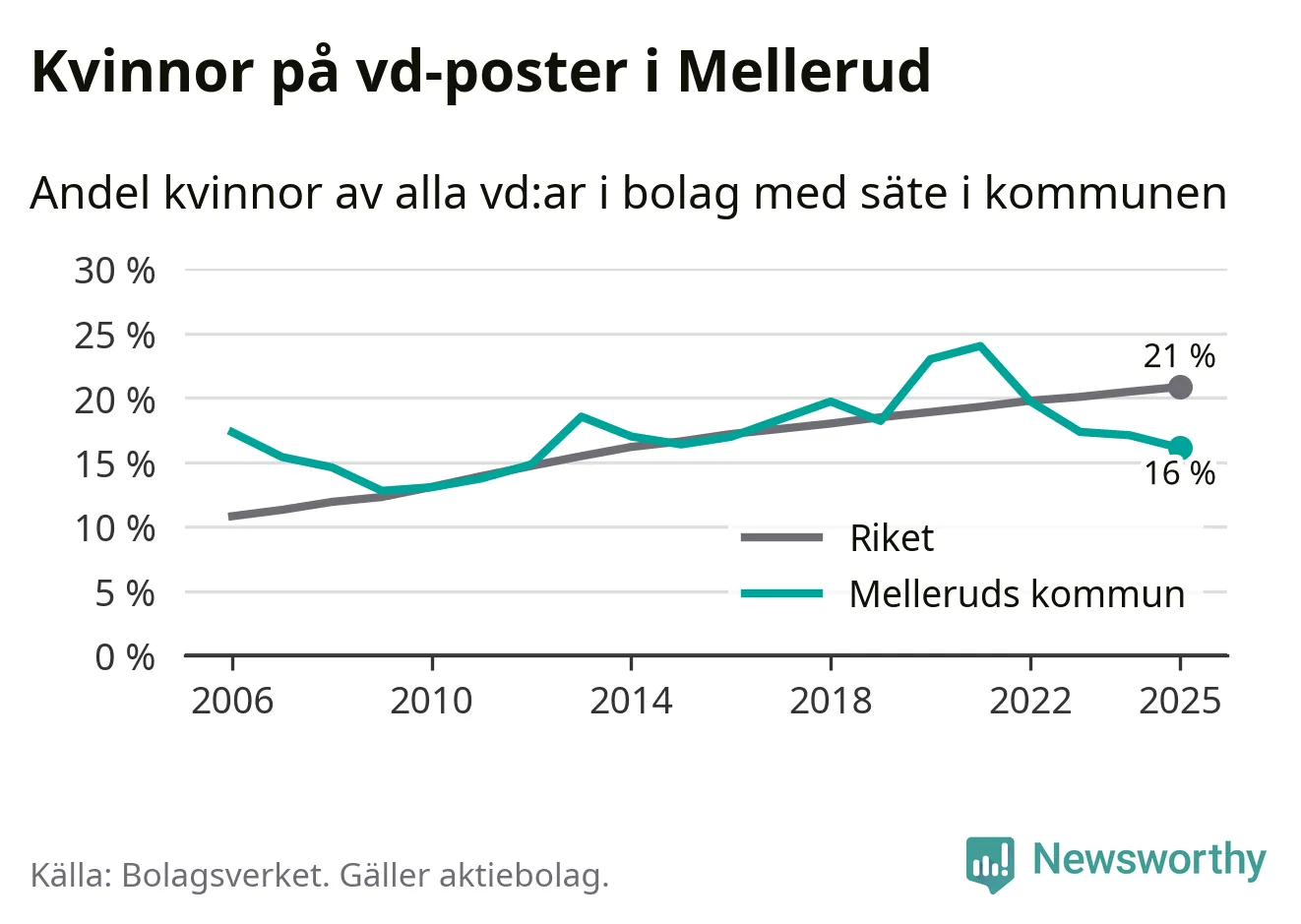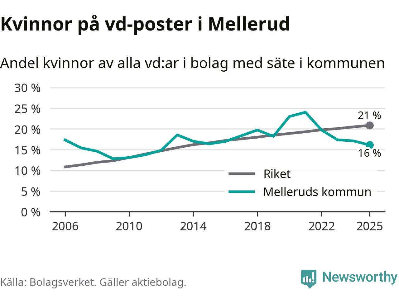 16 procent av aktiebolagen med registrerad vd i Mellerud hade en kvinna på posten vid årsskiftet. Det innebär att på varje kvinnlig vd går fem män.