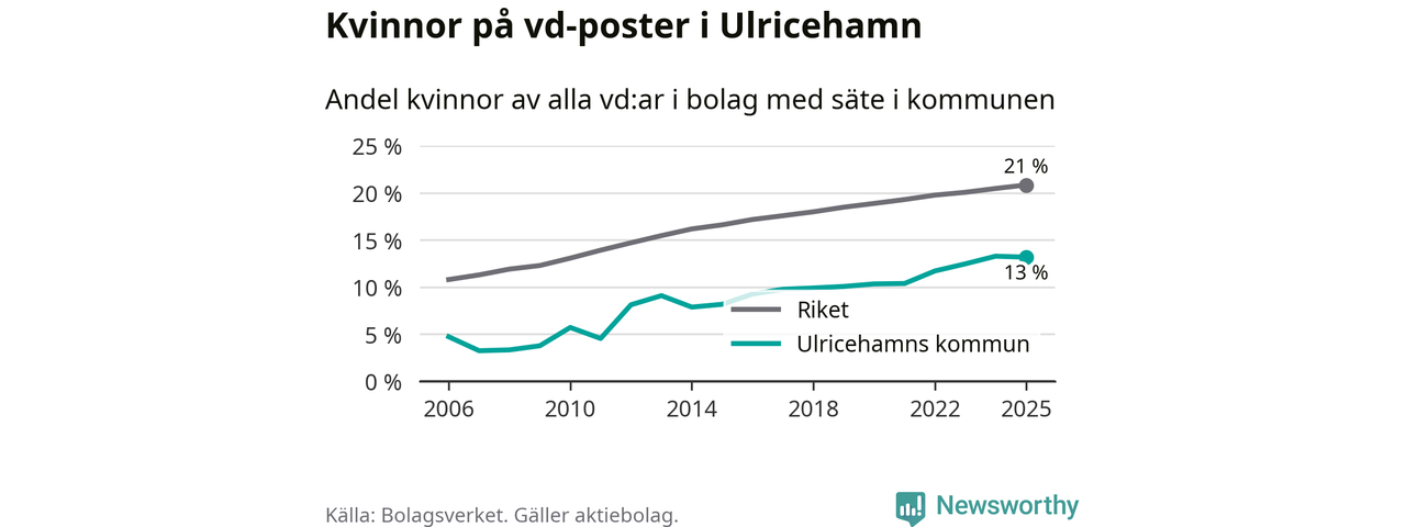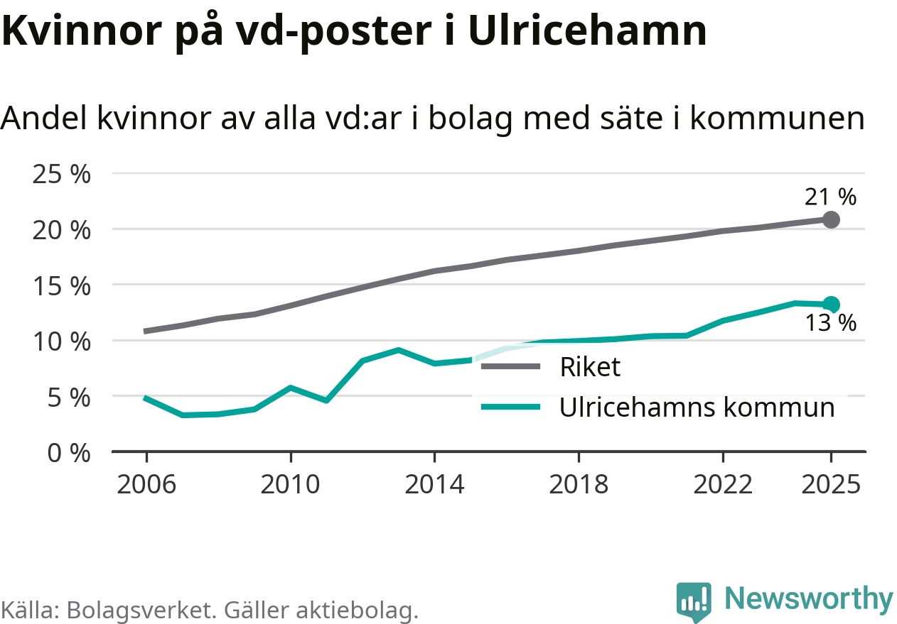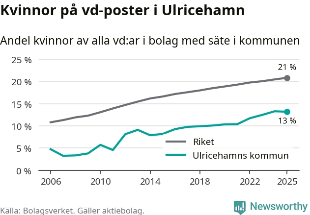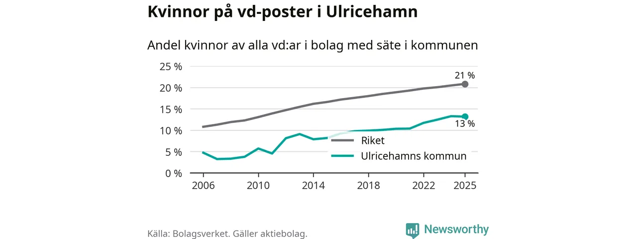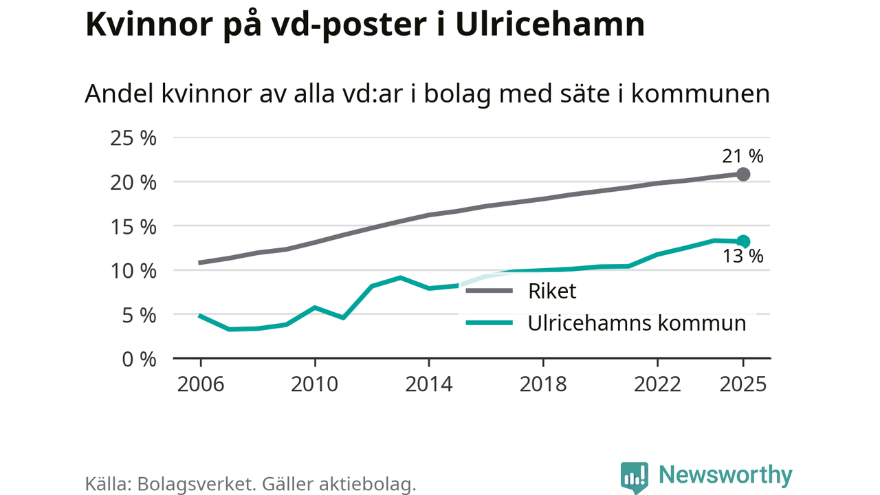 13 procent av aktiebolagen med registrerad vd i Ulricehamn hade en kvinna på posten vid årsskiftet. Det innebär att på varje kvinnlig vd går sex män.