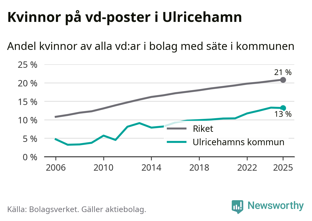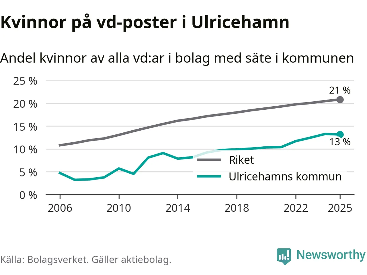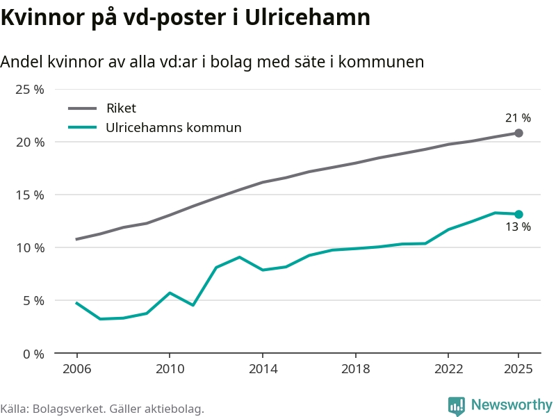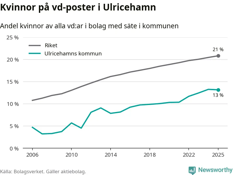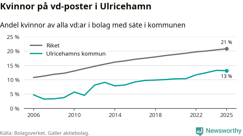 13 procent av aktiebolagen med registrerad vd i Ulricehamn hade en kvinna på posten vid årsskiftet. Det innebär att på varje kvinnlig vd går sex män.