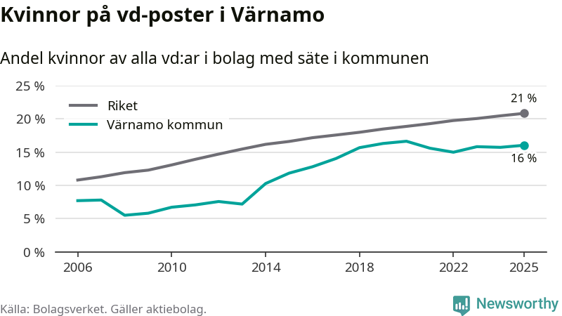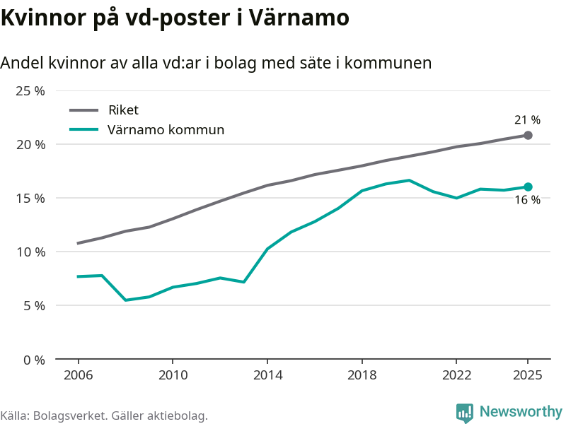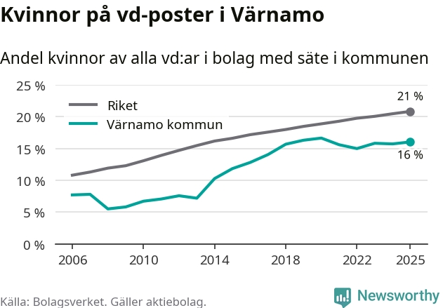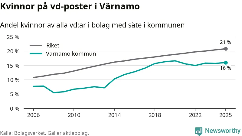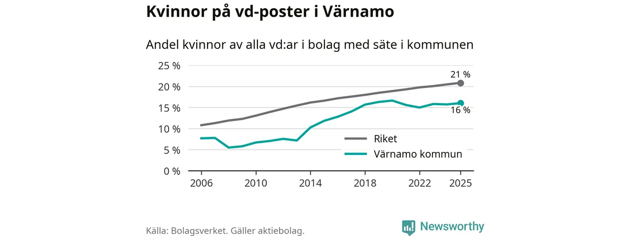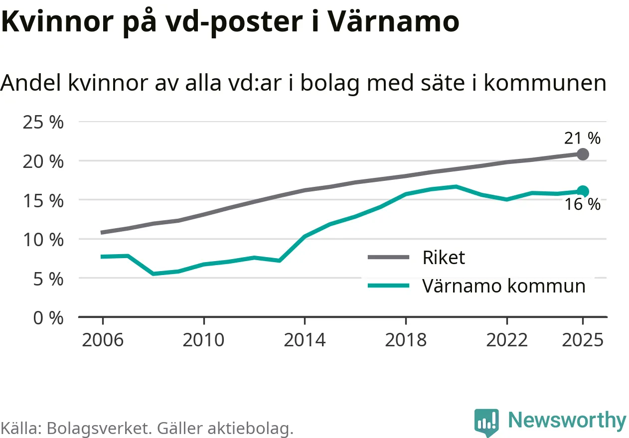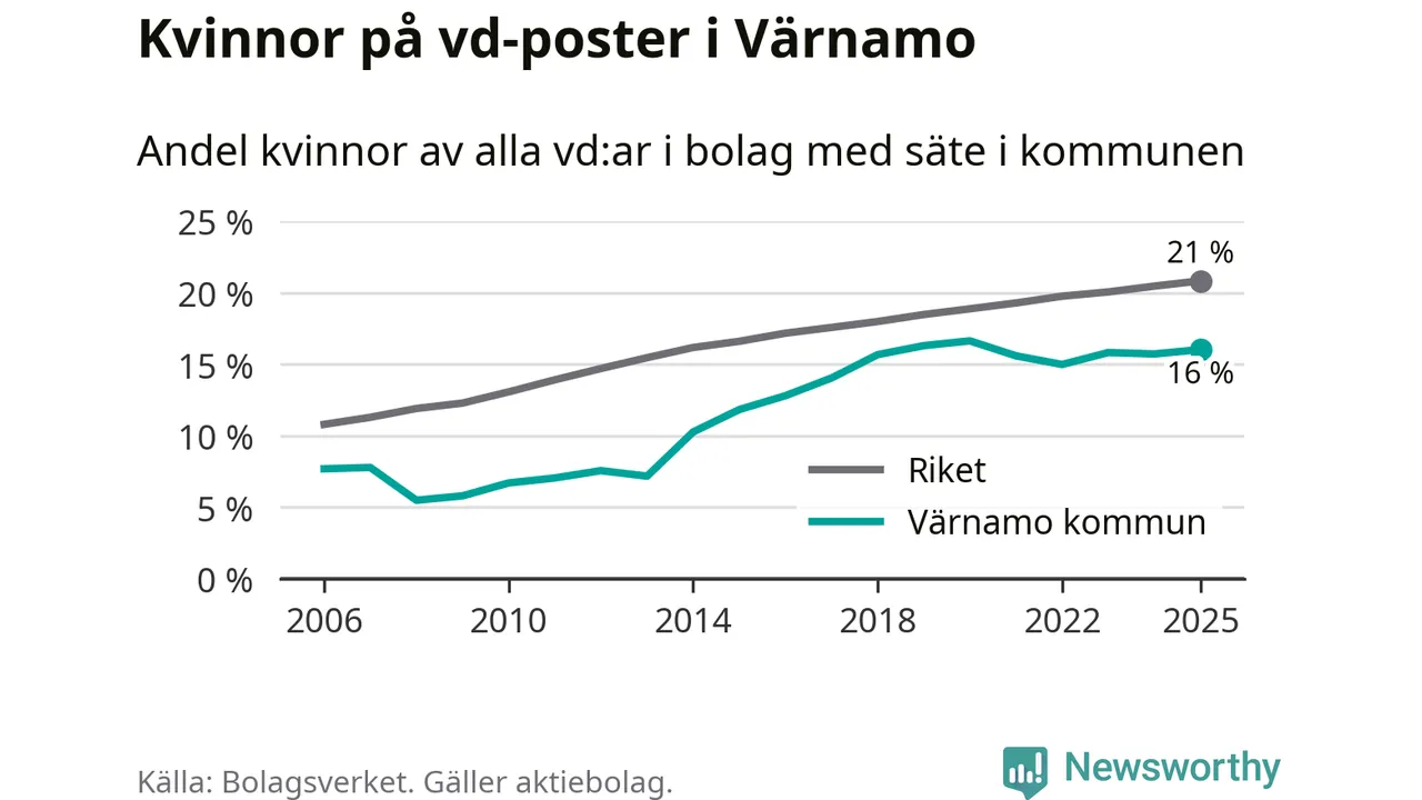 16 procent av aktiebolagen med registrerad vd i Värnamo hade en kvinna på posten vid årsskiftet. Det innebär att på varje kvinnlig vd går fem män.