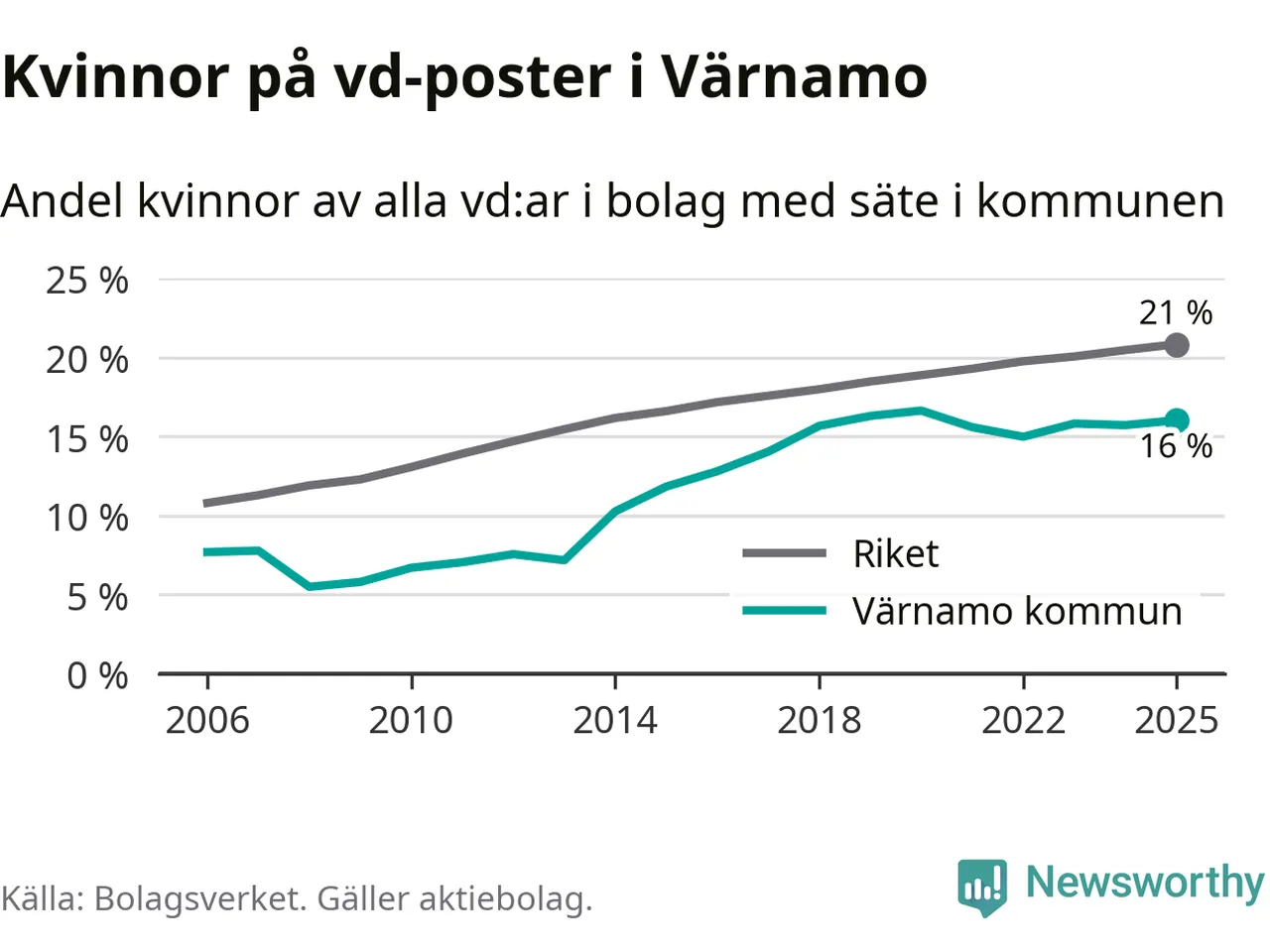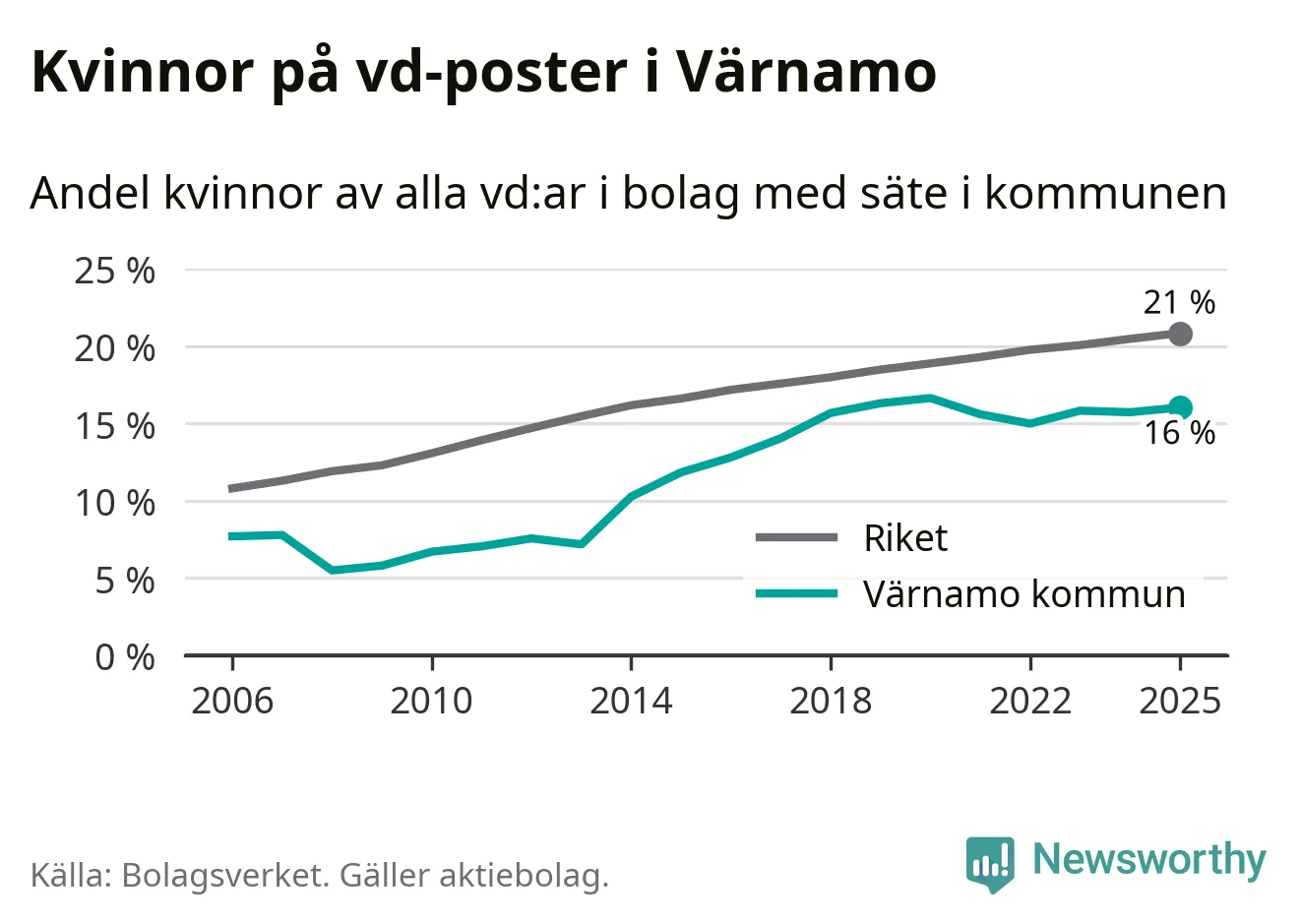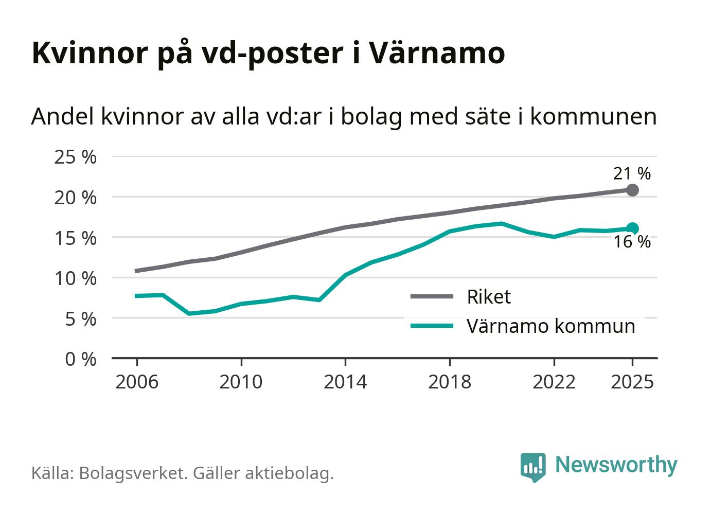Bara var femte svenskt aktiebolag leds av en kvinna. I Värnamo är andelen ännu lägre. Det visar siffror från Bolagsverket.