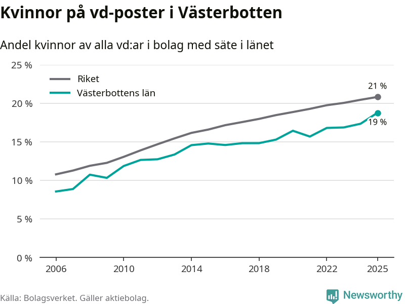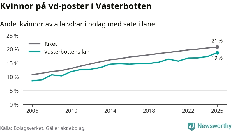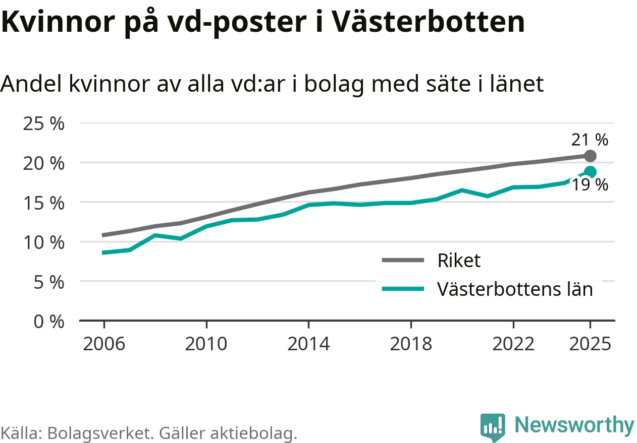 19 procent av aktiebolagen med registrerad vd i Västerbotten hade en kvinna på posten vid årsskiftet. Det innebär att på varje kvinnlig vd går fyra män.