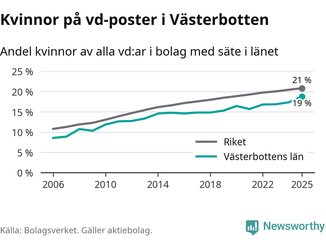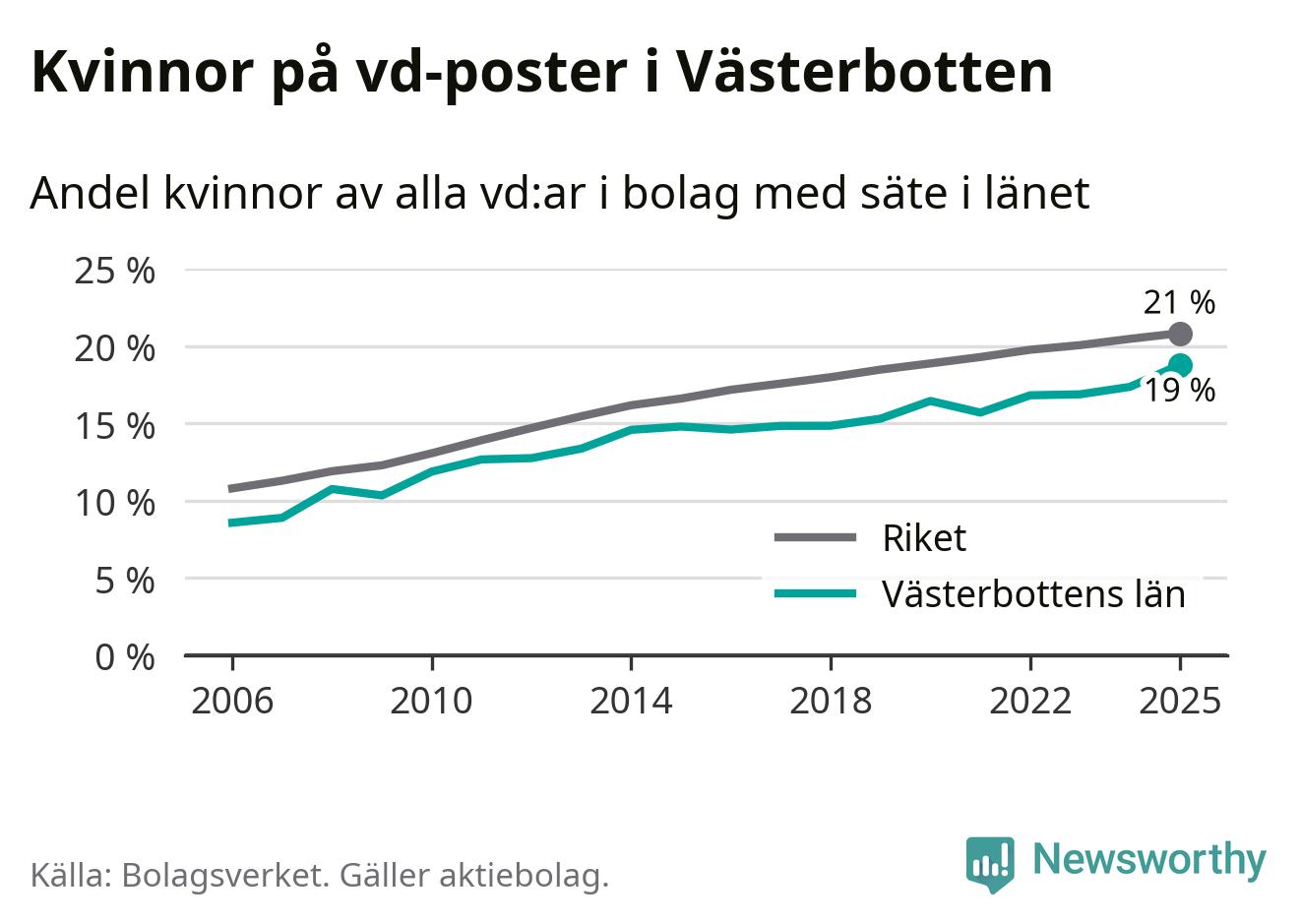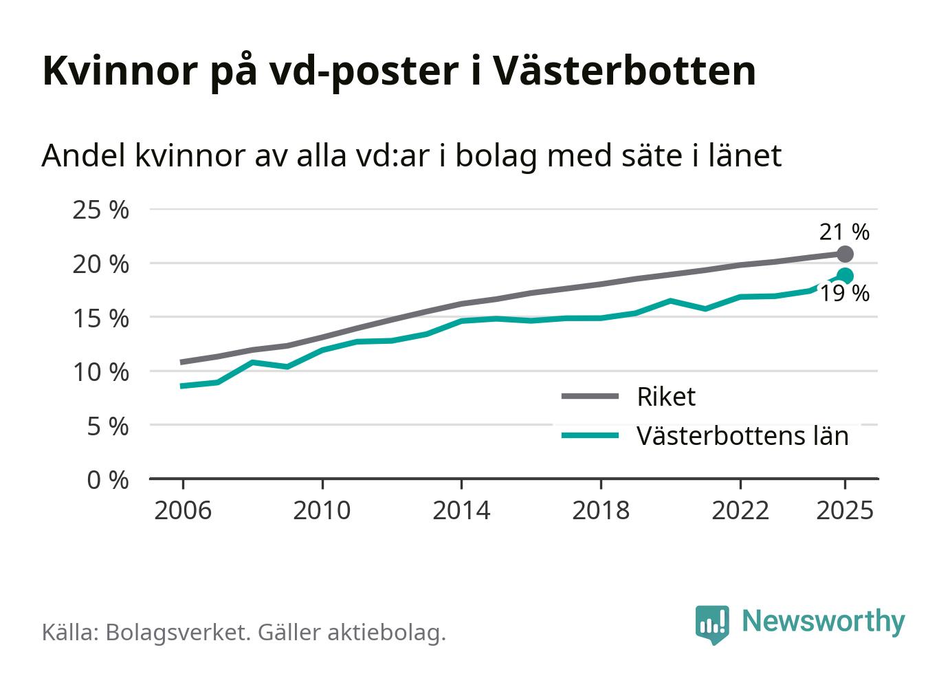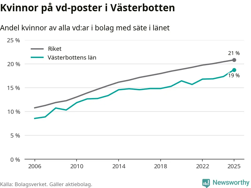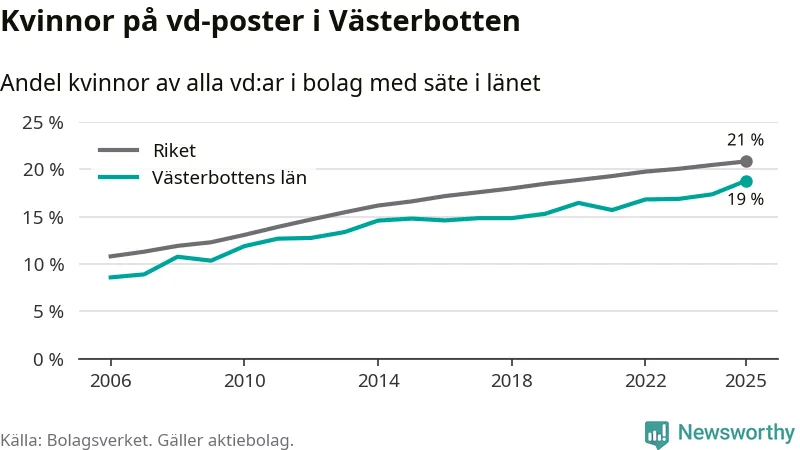 Andelen företag med en kvinna som vd har ökat i Västerbotten, men är lägre än i riket som helhet. Det visar siffror från Bolagsverket.