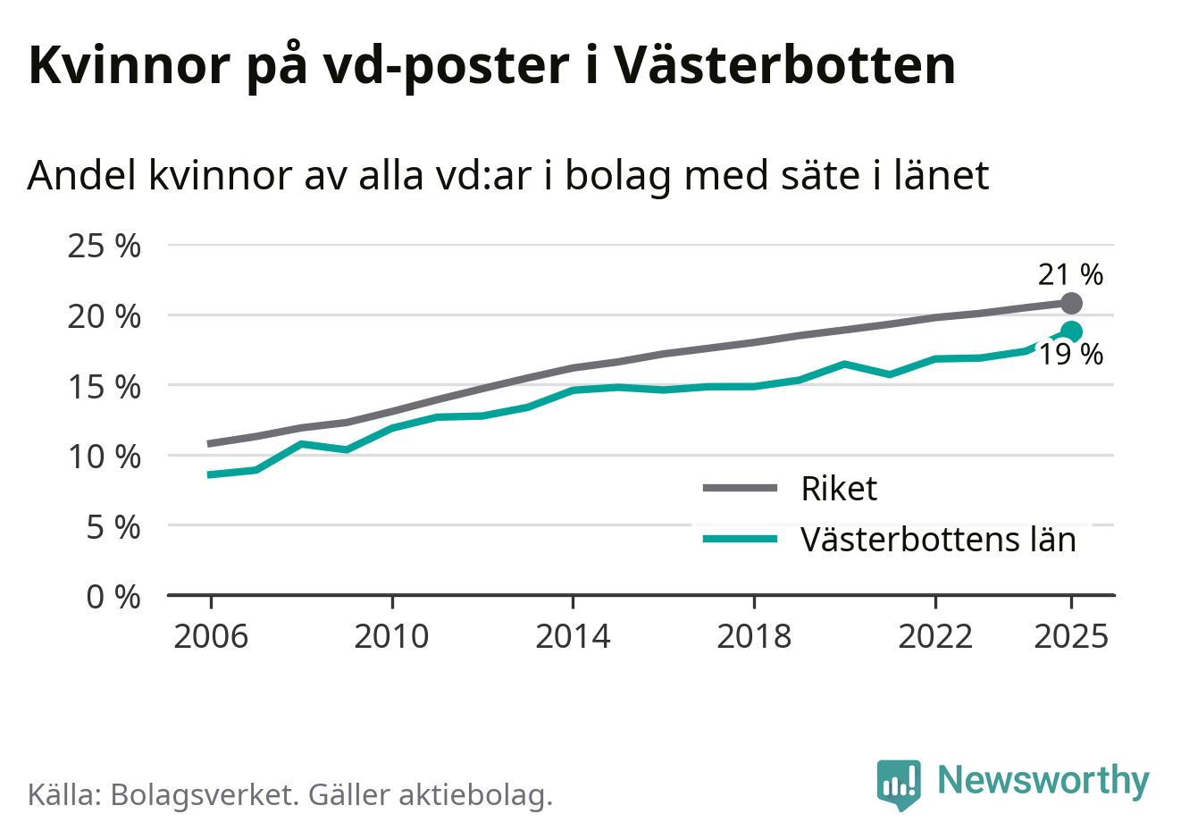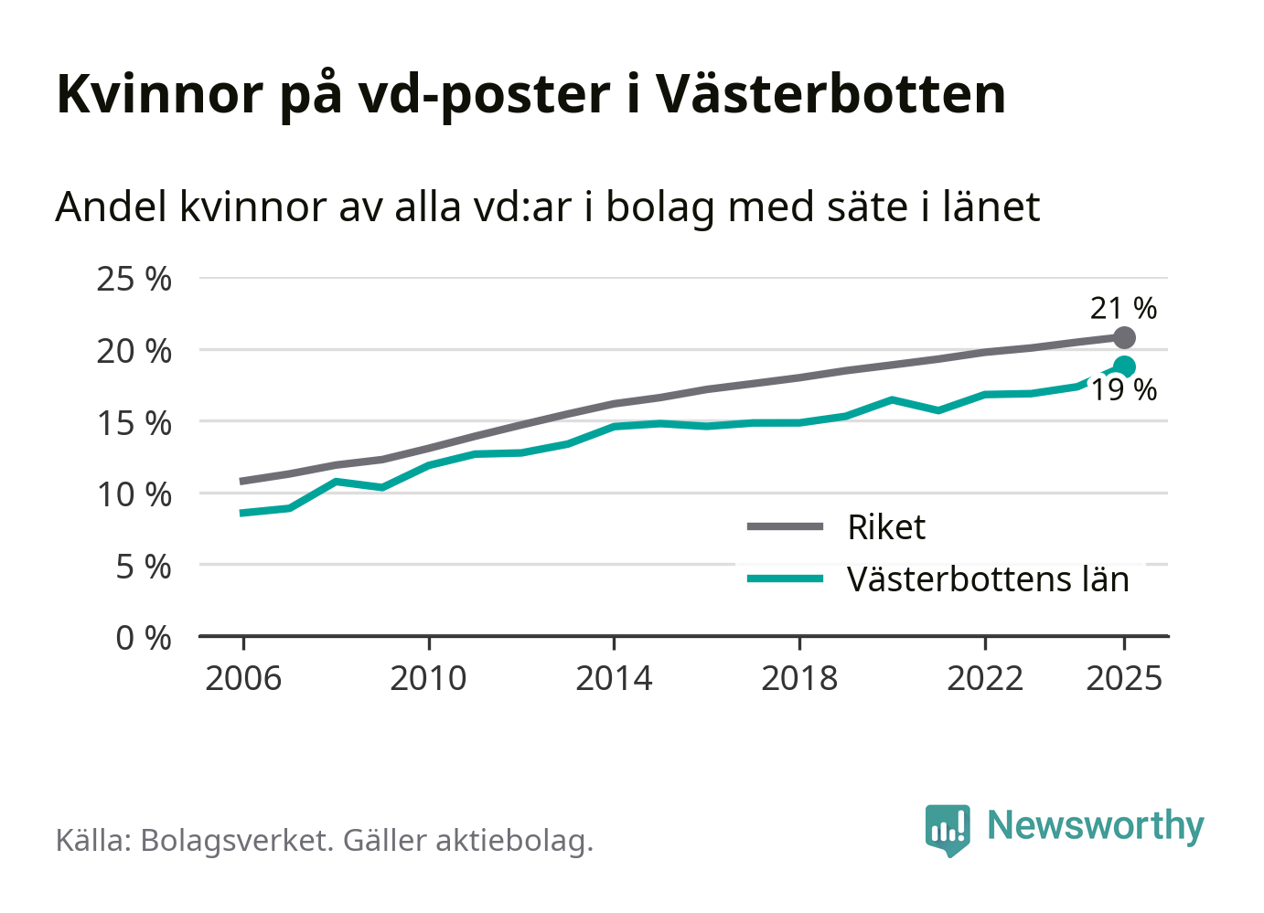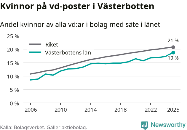 Delar man upp vd:arna i Västerbotten efter ålder är andelen kvinnor högre bland dem under 50 år. Där är 20 procent kvinnor, jämfört med 18 procent i den äldre gruppen. I riket som helhet är 22 procent av vd:arna som är under 50 år kvinnor, medan motsvarande siffra för direktörerna som är äldre är 20 procent.