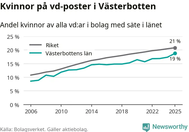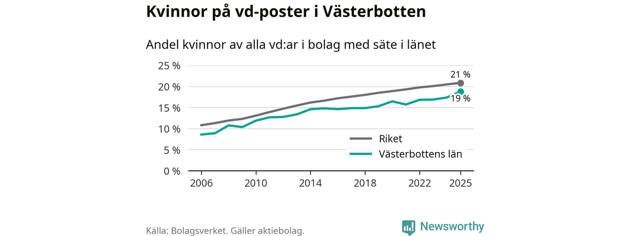 Det är fortfarande män som är vd i nästan fyra av fem bolag i Sverige och i Västerbotten är det alltså en något lägre andel kvinnor på vd-posten. Högst andel kvinnliga vd:ar bland kommunerna i Västerbotten har företagen med säte i Storuman, 29 procent. Lägst är andelen bland företagen med säte i Dorotea, 12 procent. I Dorotea rör det sig om 43 företag totalt och även små förändringar får stora utslag i andelen kvinnliga vd:ar.