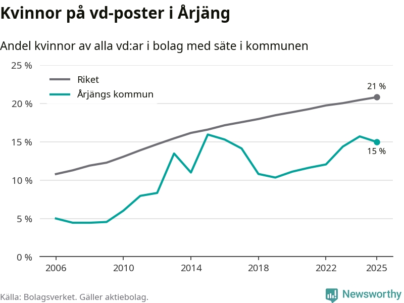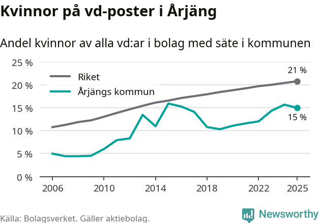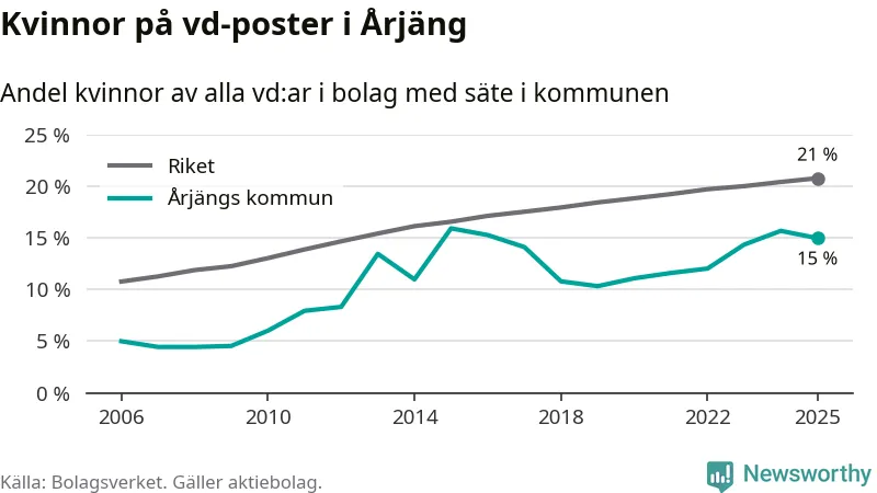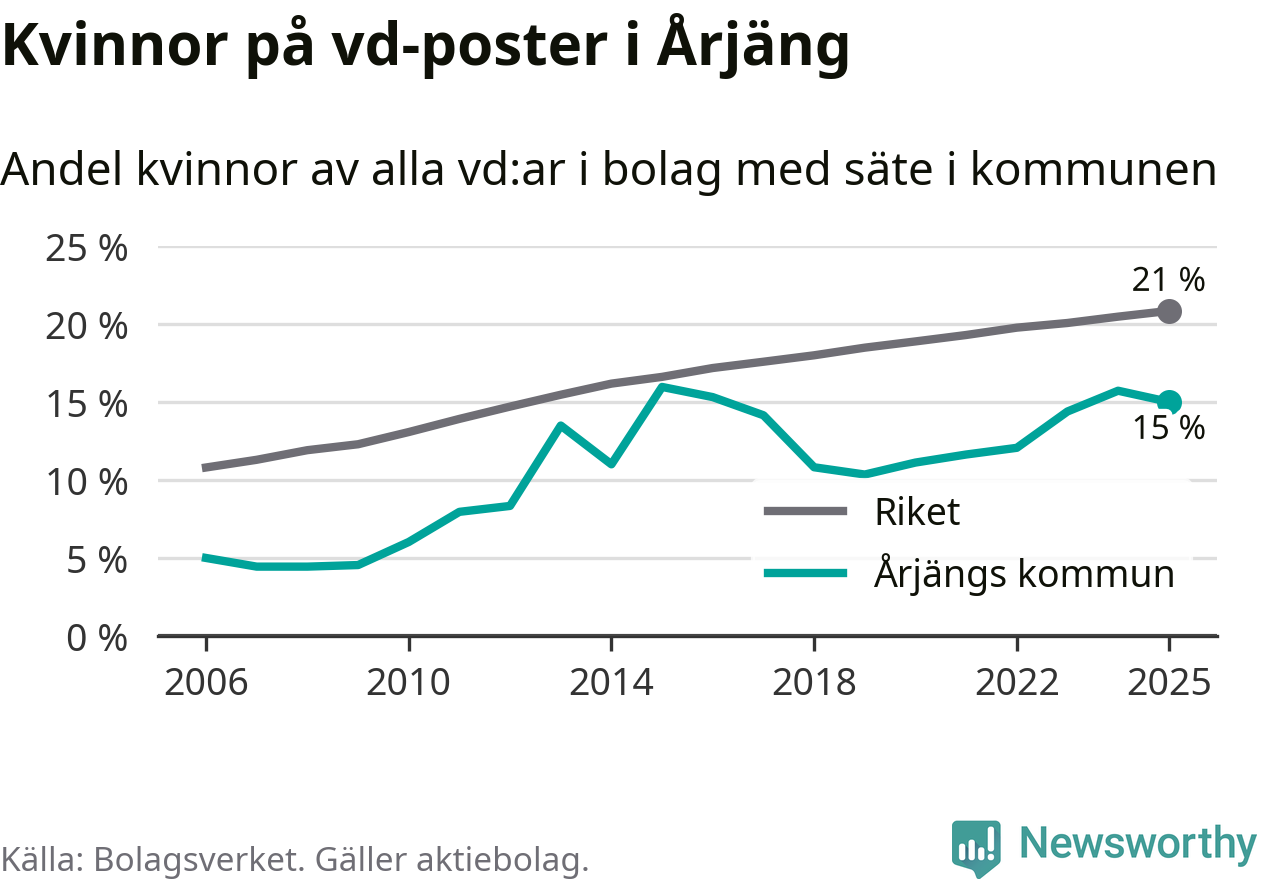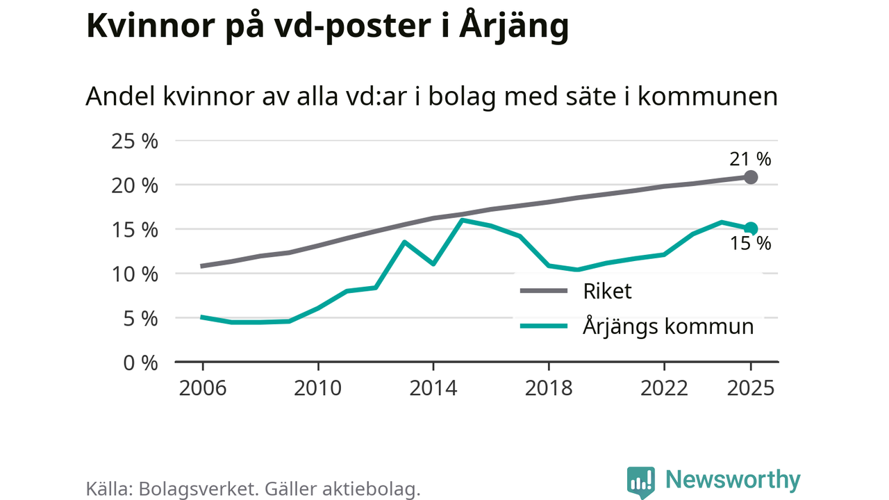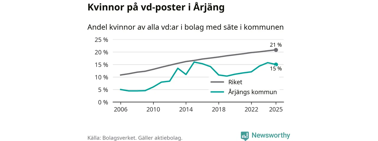 15 procent av aktiebolagen med registrerad vd i Årjäng hade en kvinna på posten vid årsskiftet. Det innebär att på varje kvinnlig vd går fem män.