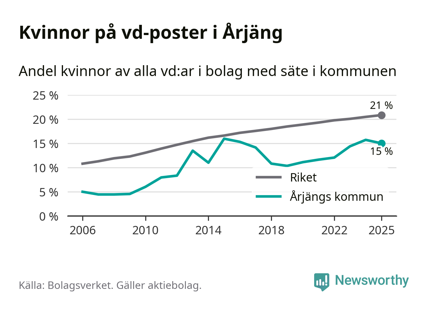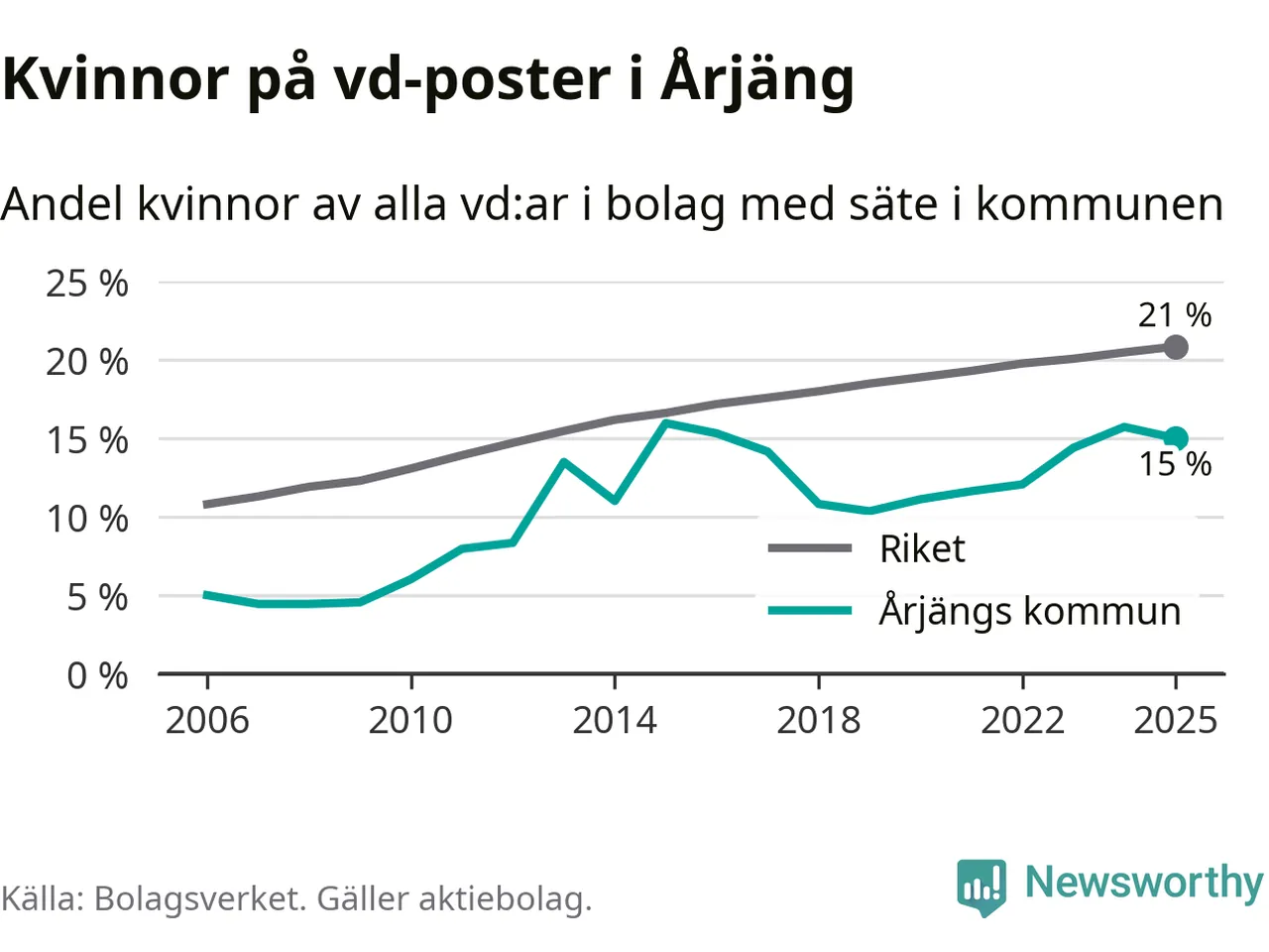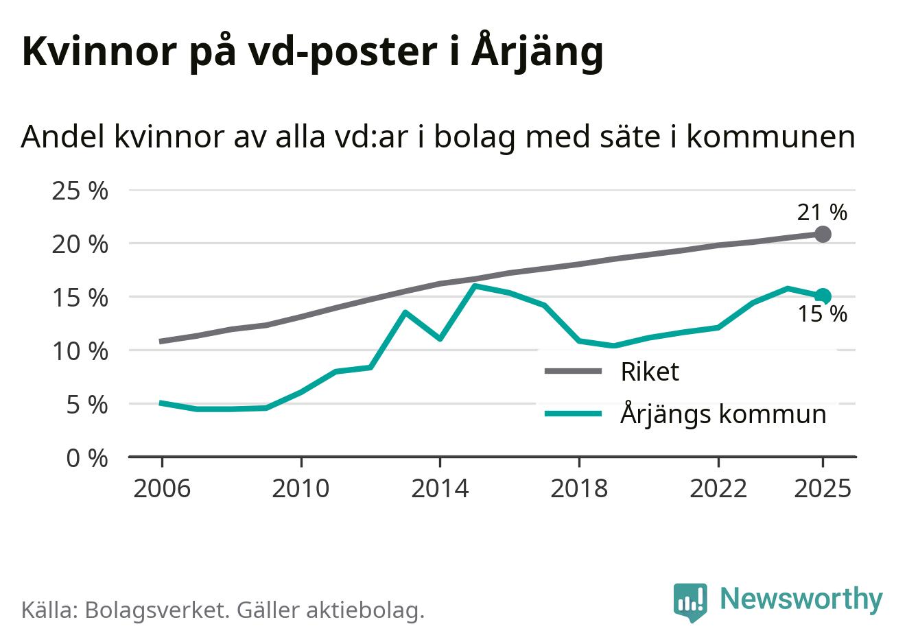 15 procent av aktiebolagen med registrerad vd i Årjäng hade en kvinna på posten vid årsskiftet. Det innebär att på varje kvinnlig vd går fem män.