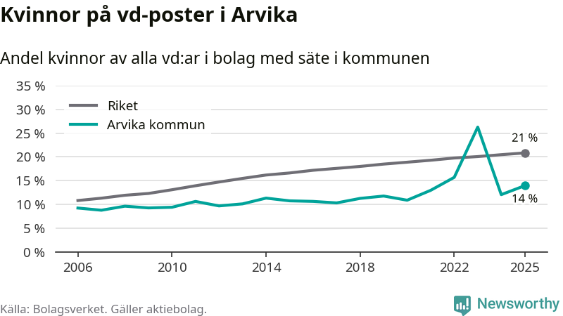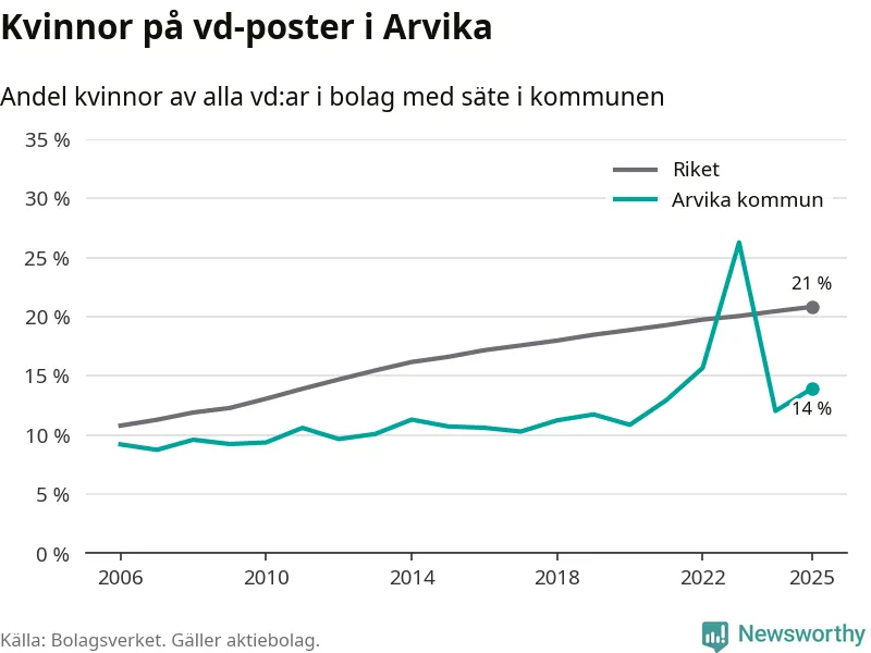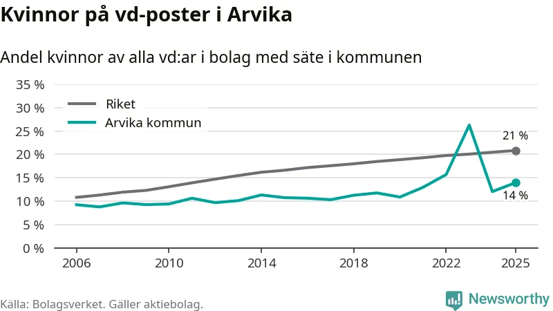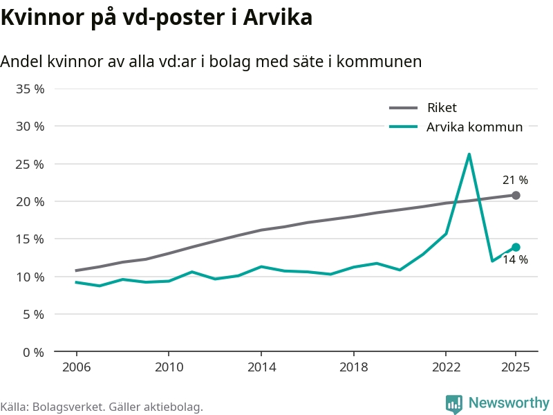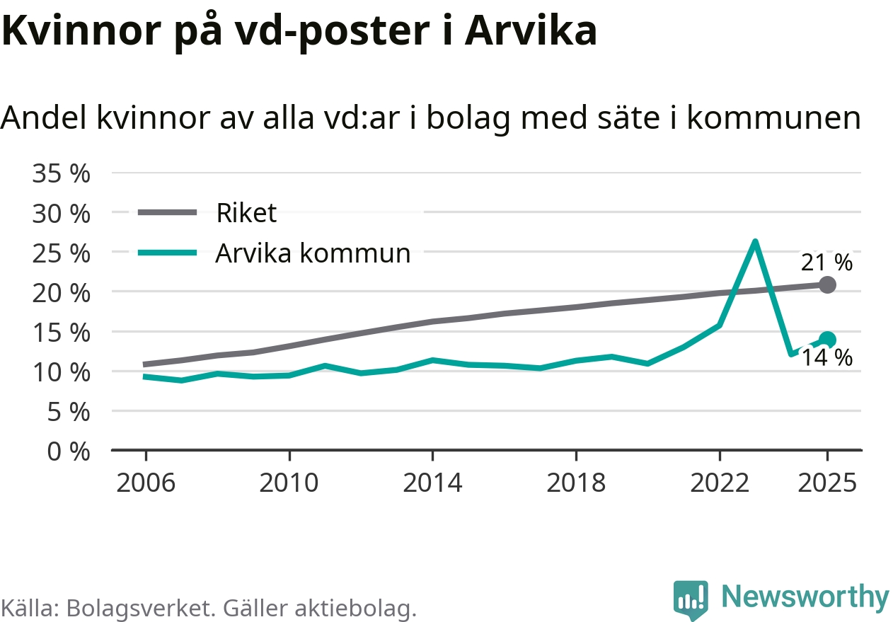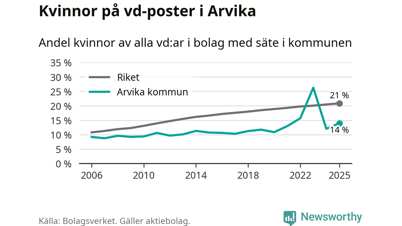 14 procent av aktiebolagen med registrerad vd i Arvika hade en kvinna på posten vid årsskiftet. Det innebär att på varje kvinnlig vd går sex män.