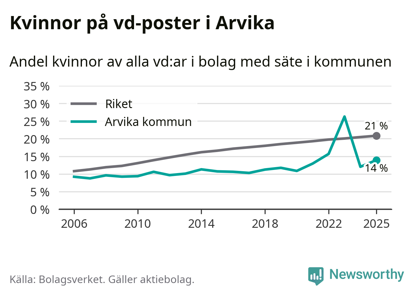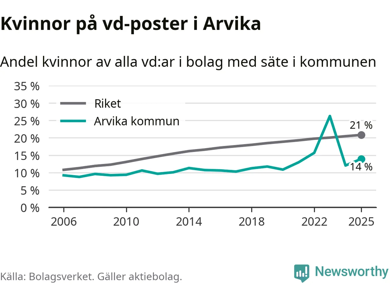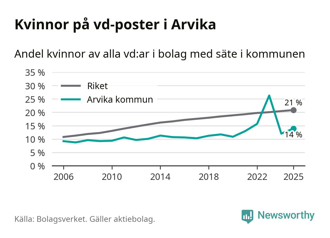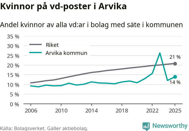 14 procent av aktiebolagen med registrerad vd i Arvika hade en kvinna på posten vid årsskiftet. Det innebär att på varje kvinnlig vd går sex män.