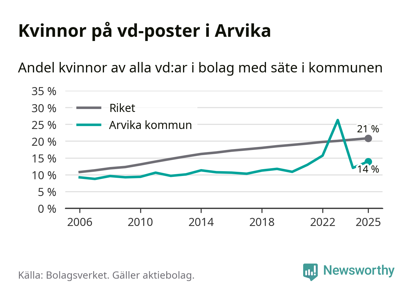 Andelen företag med en kvinna som vd har ökat i Arvika, men är lägre än i riket som helhet. Det visar siffror från Bolagsverket.
