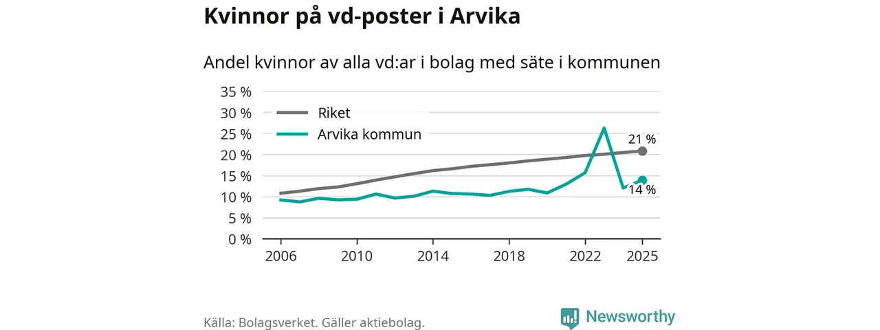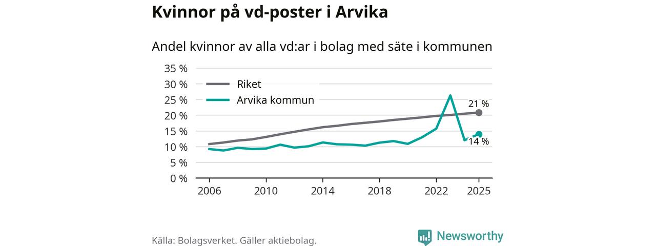 Det är fortfarande män som är vd i nästan fyra av fem bolag i Sverige och i Arvika är det alltså en lägre andel kvinnor på vd-posten. Högst andel kvinnliga vd:ar i Värmland har företagen med säte i Munkfors kommun, 28 procent. Lägst är andelen bland företagen med säte i Storfors kommun, 12 procent. I både Munkfors och Storfors rör det sig om relativt få företag totalt och även små förändringar får stora utslag i andelen kvinnliga vd:ar.
