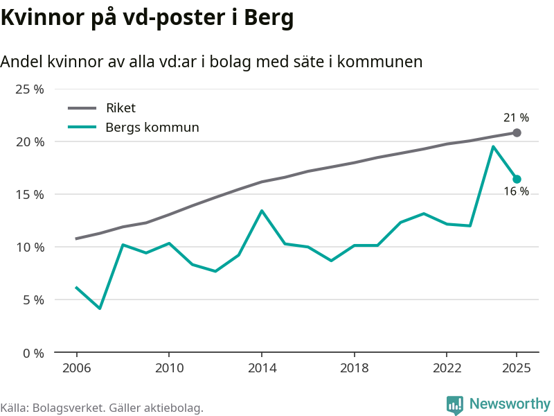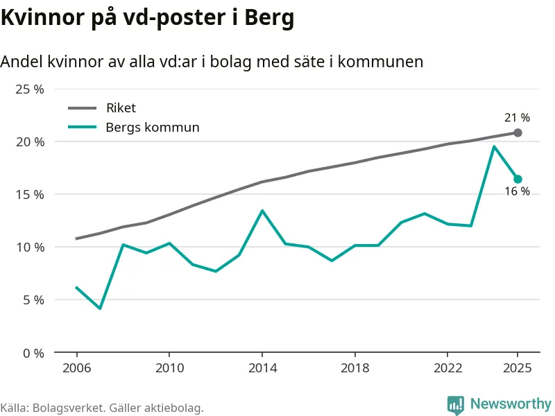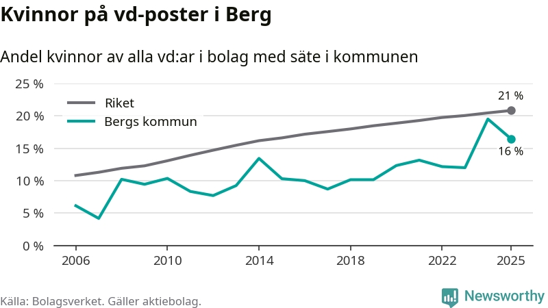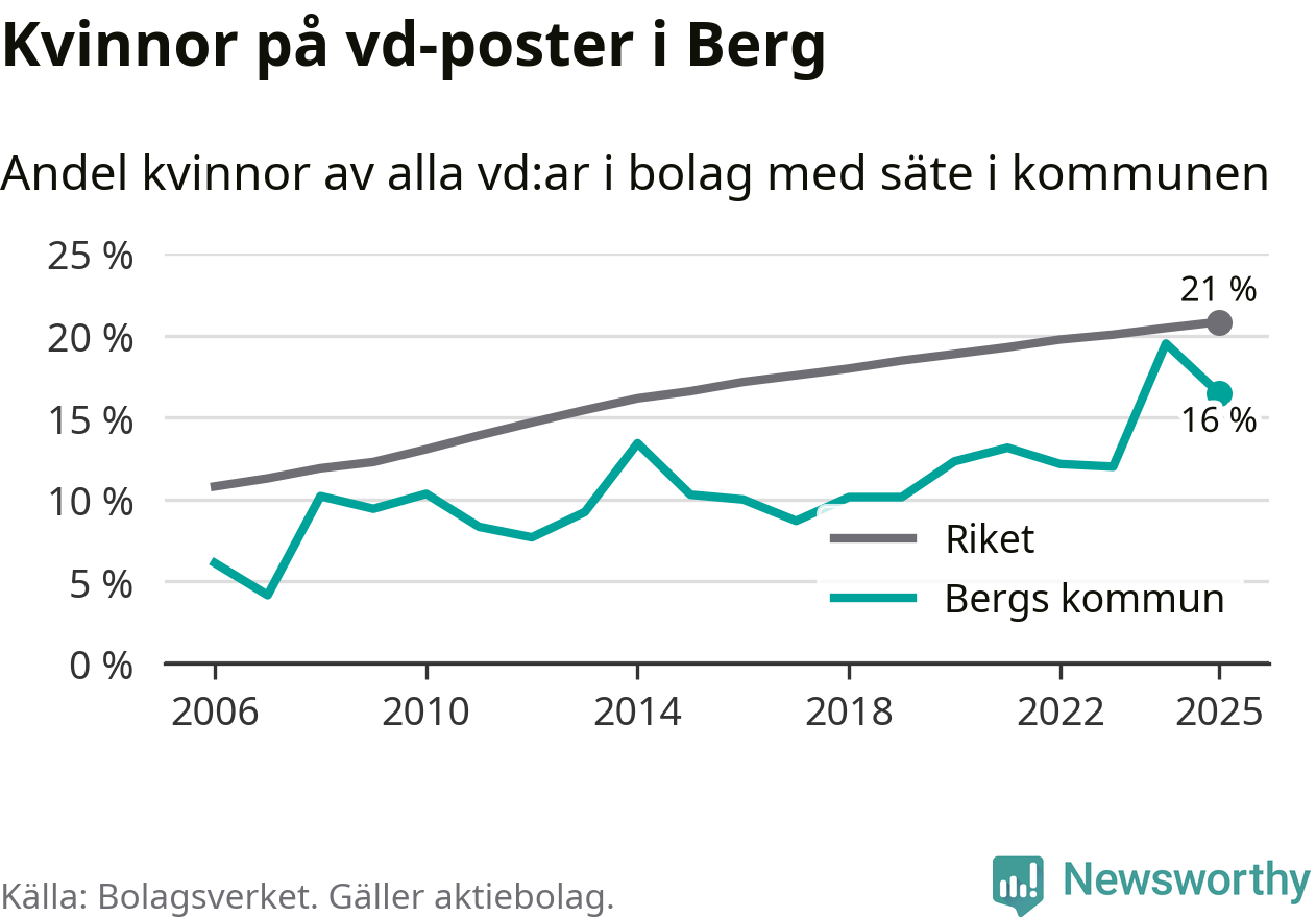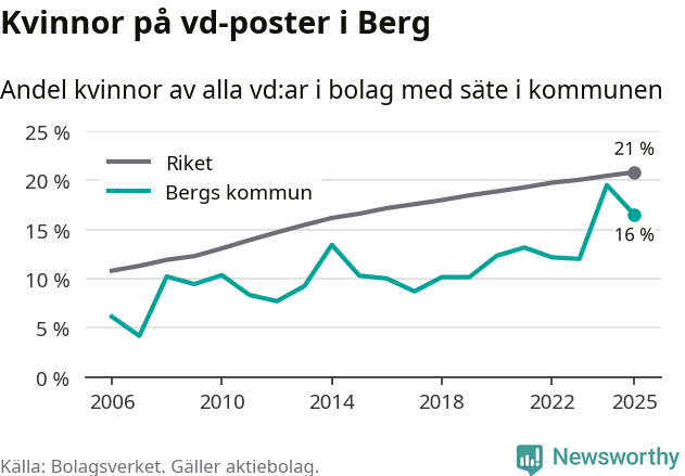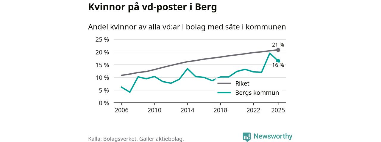 Det är fortfarande män som är vd i nästan fyra av fem bolag i Sverige och i Berg är det alltså en lägre andel kvinnor på vd-posten. 16 procent är den näst lägsta andelen av kommunerna i Jämtland. Högst andel kvinnliga vd:ar i Jämtland har företagen med säte i Ragunda kommun, 26 procent. Lägst är andelen bland företagen med säte i Bräcke kommun, 15 procent. I både Ragunda och Bräcke rör det sig om relativt få företag totalt och även små förändringar får stora utslag i andelen kvinnliga vd:ar.