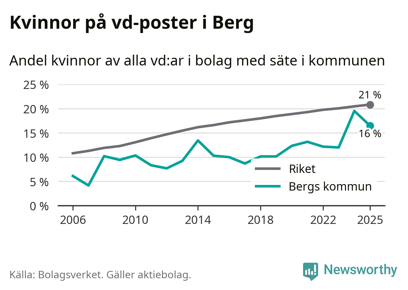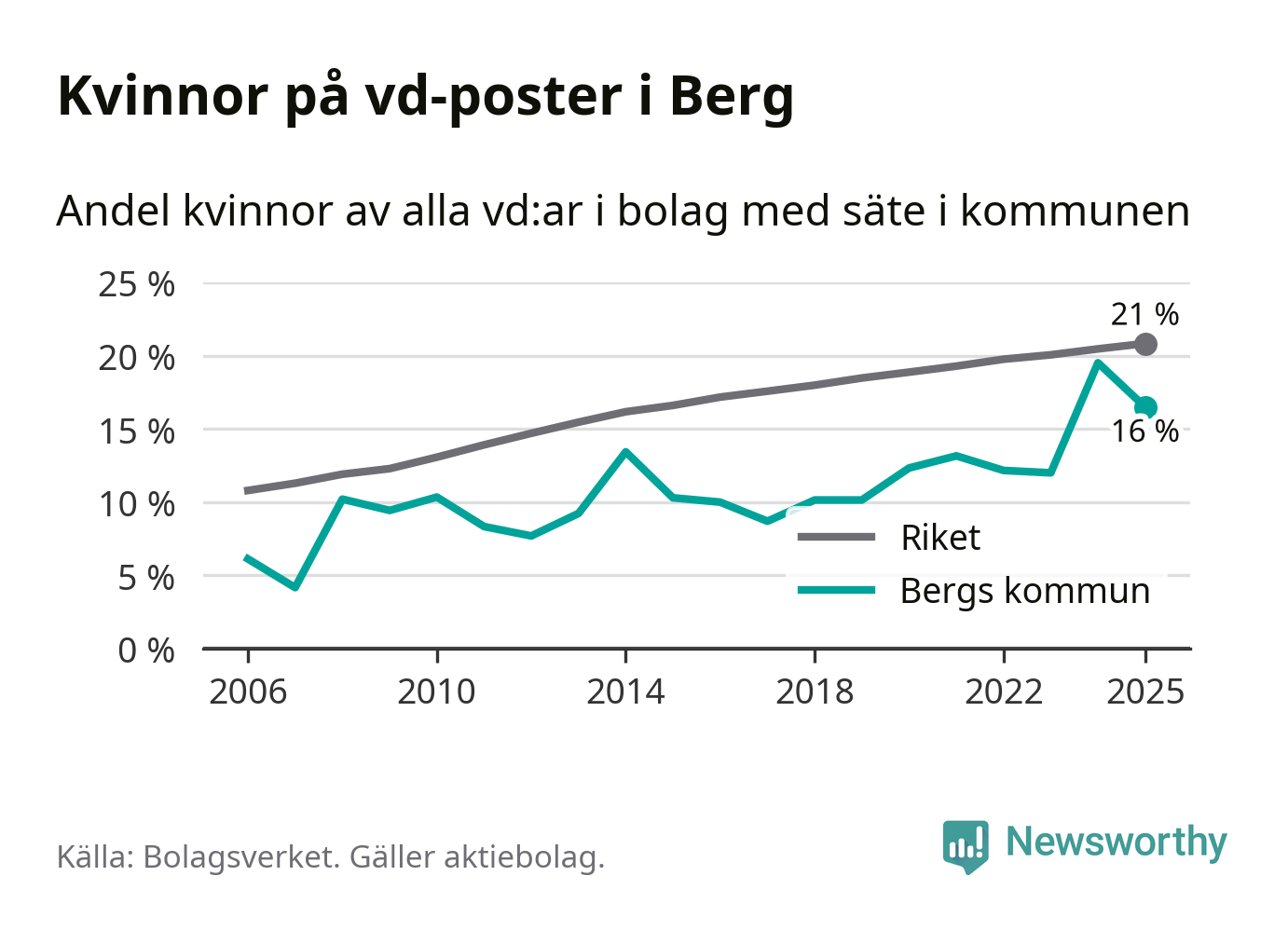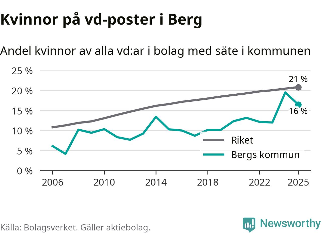 Det är fortfarande män som är vd i nästan fyra av fem bolag i Sverige och i Berg är det alltså en lägre andel kvinnor på vd-posten. 16 procent är den näst lägsta andelen av kommunerna i Jämtland. Högst andel kvinnliga vd:ar i Jämtland har företagen med säte i Ragunda kommun, 26 procent. Lägst är andelen bland företagen med säte i Bräcke kommun, 15 procent. I både Ragunda och Bräcke rör det sig om relativt få företag totalt och även små förändringar får stora utslag i andelen kvinnliga vd:ar.