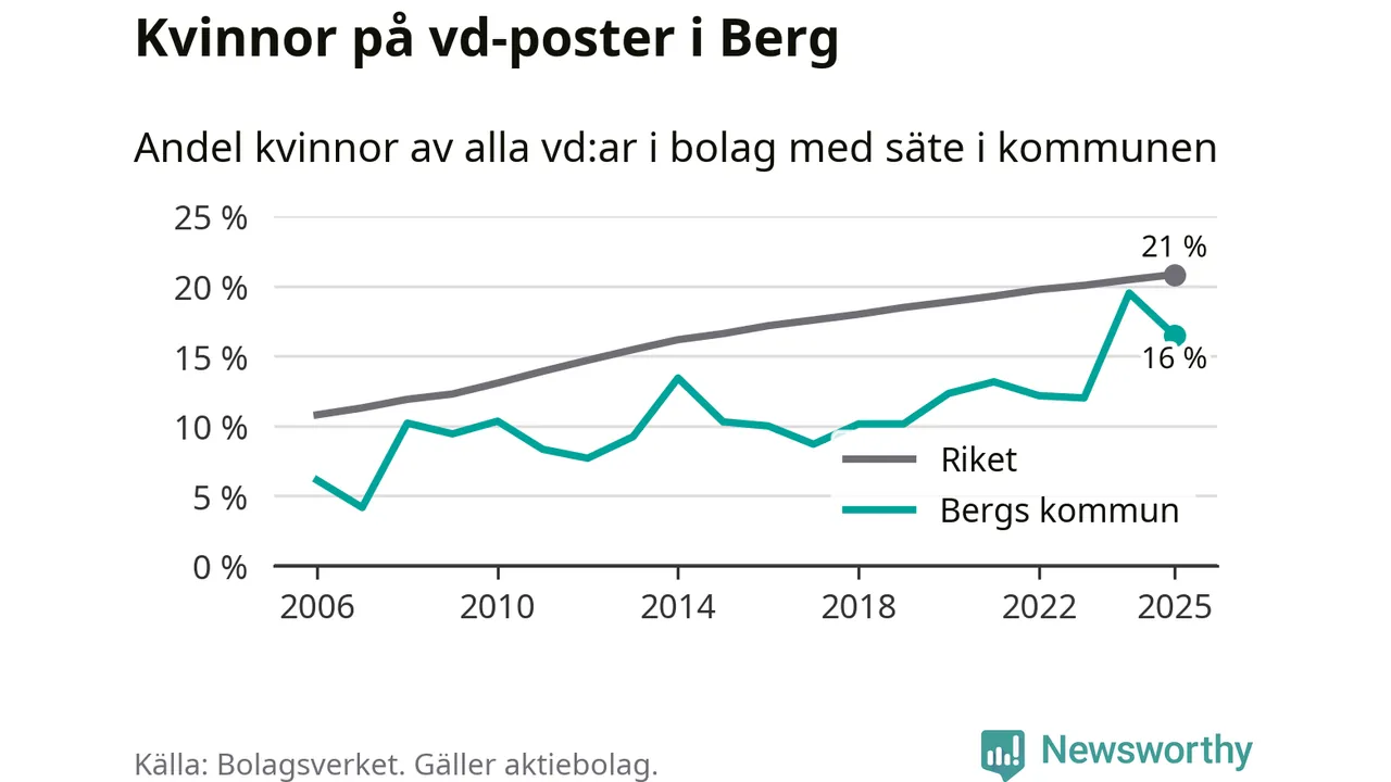 16 procent av aktiebolagen med registrerad vd i Berg hade en kvinna på posten vid årsskiftet. Det innebär att på varje kvinnlig vd går fem män.