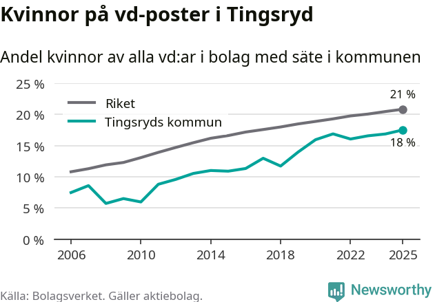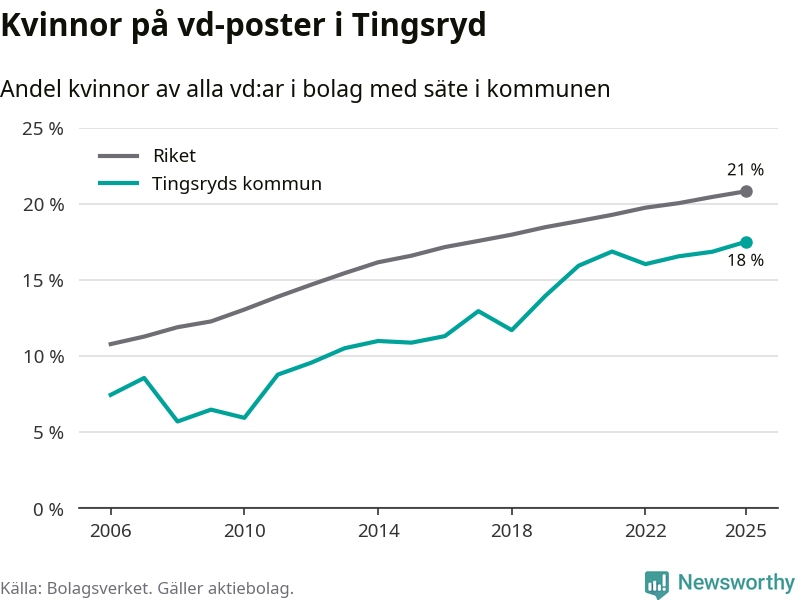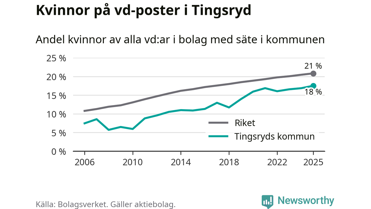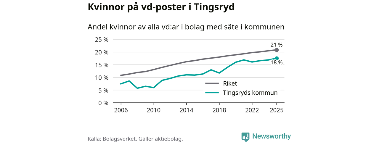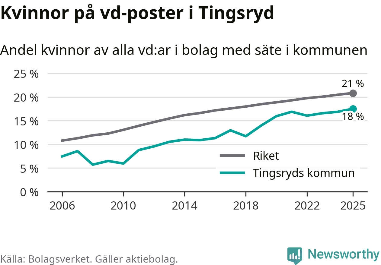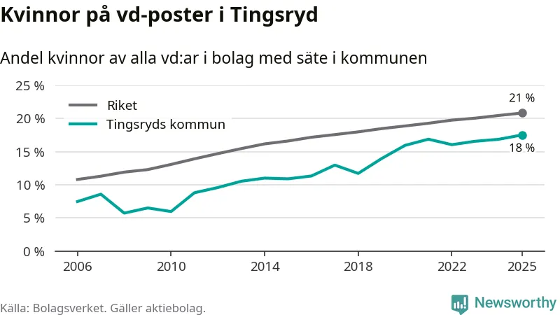 18 procent av aktiebolagen med registrerad vd i Tingsryd hade en kvinna på posten vid årsskiftet. Det innebär att på varje kvinnlig vd går mer än fyra män.