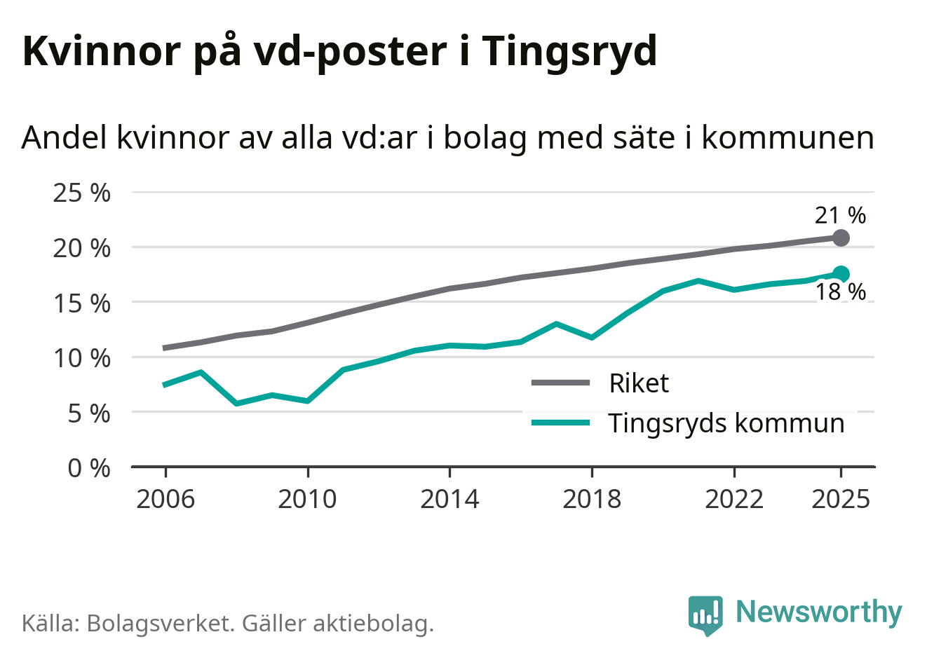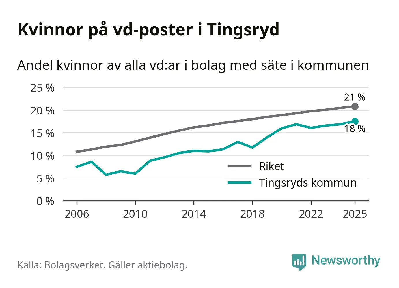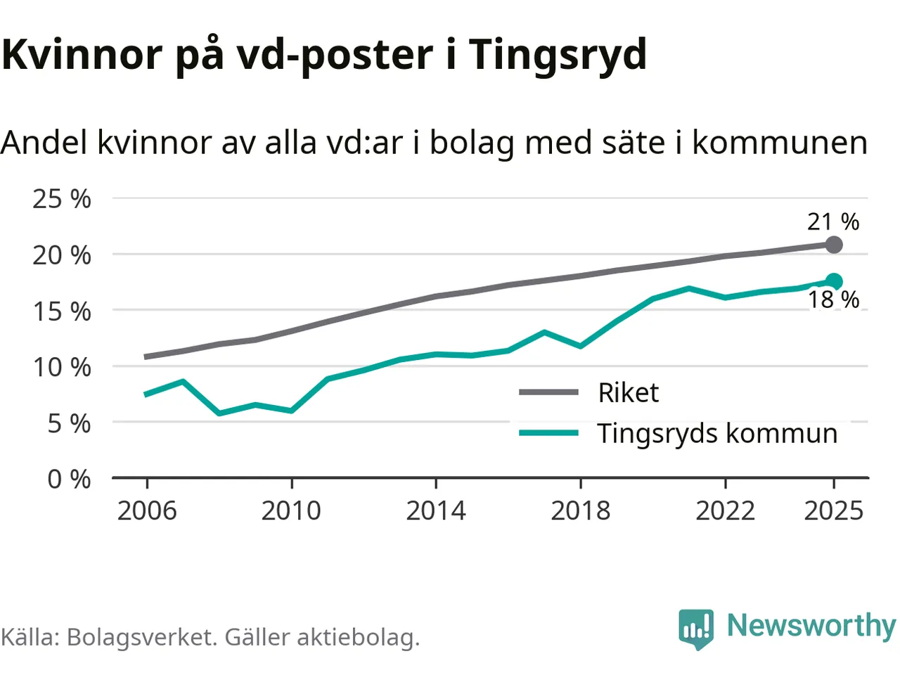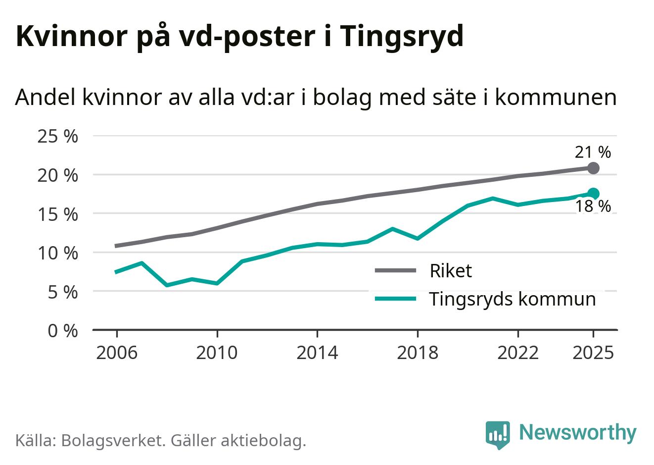 18 procent av aktiebolagen med registrerad vd i Tingsryd hade en kvinna på posten vid årsskiftet. Det innebär att på varje kvinnlig vd går mer än fyra män.