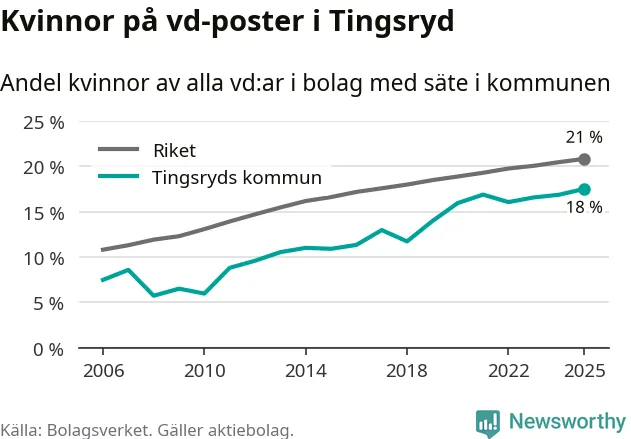 Det är fortfarande män som är vd i nästan fyra av fem bolag i Sverige och i Tingsryd är det alltså en lägre andel kvinnor på vd-posten. Högst andel kvinnliga vd:ar i Kronoberg har företagen med säte i Markaryds kommun, 22 procent. Lägst är andelen bland företagen med säte i Lessebo kommun, 8 procent. I Lessebo rör det sig om 64 företag totalt och även små förändringar får stora utslag i andelen kvinnliga vd:ar.