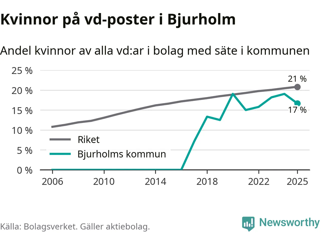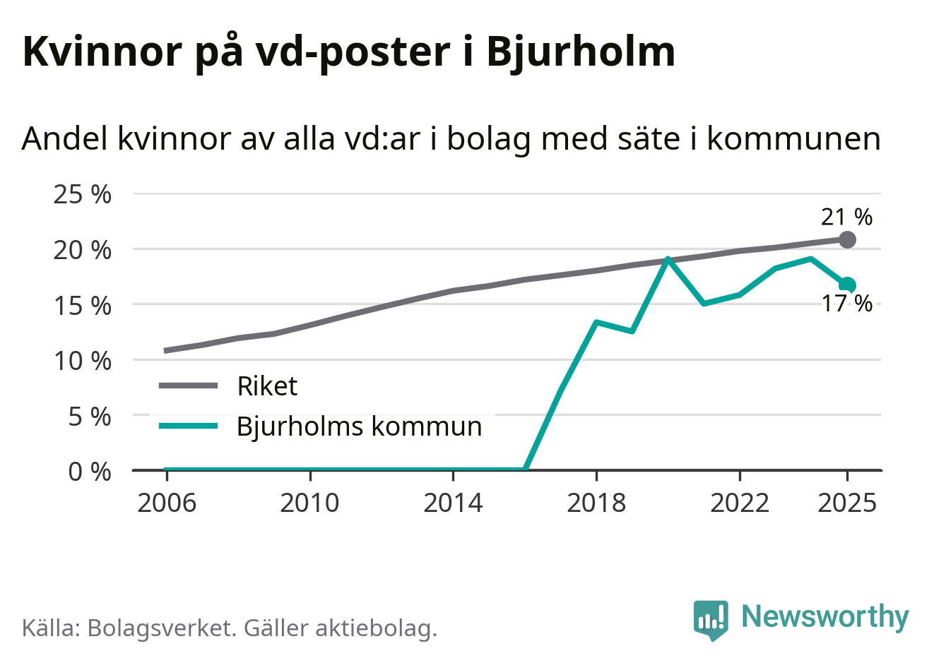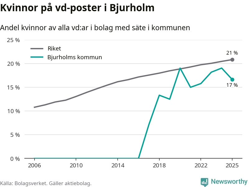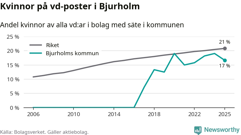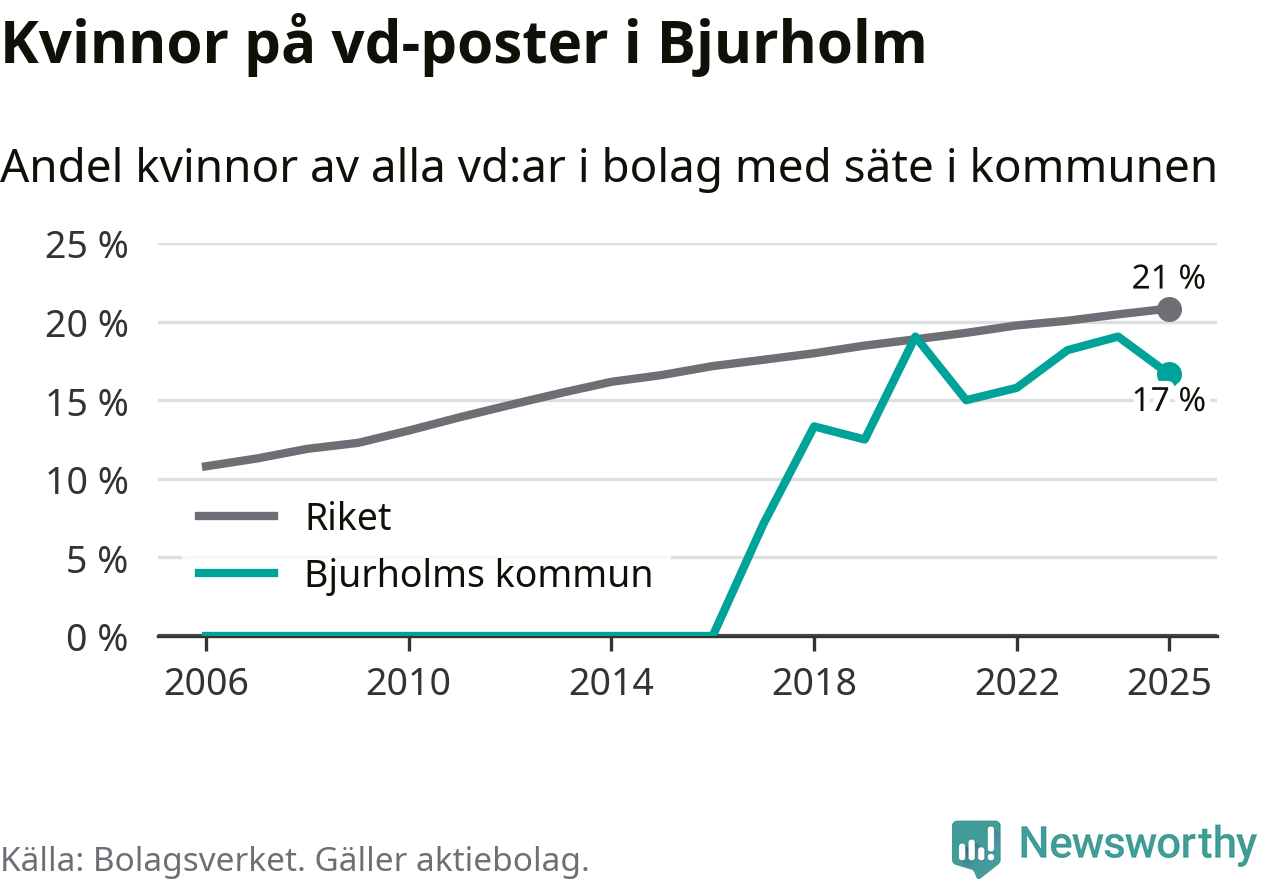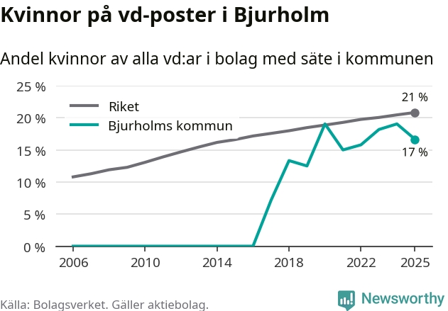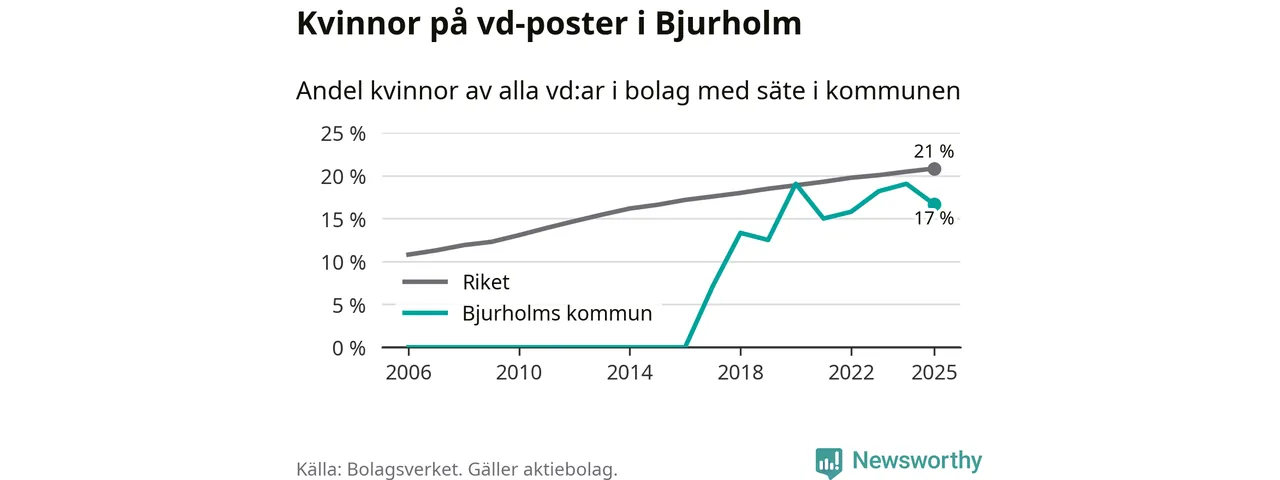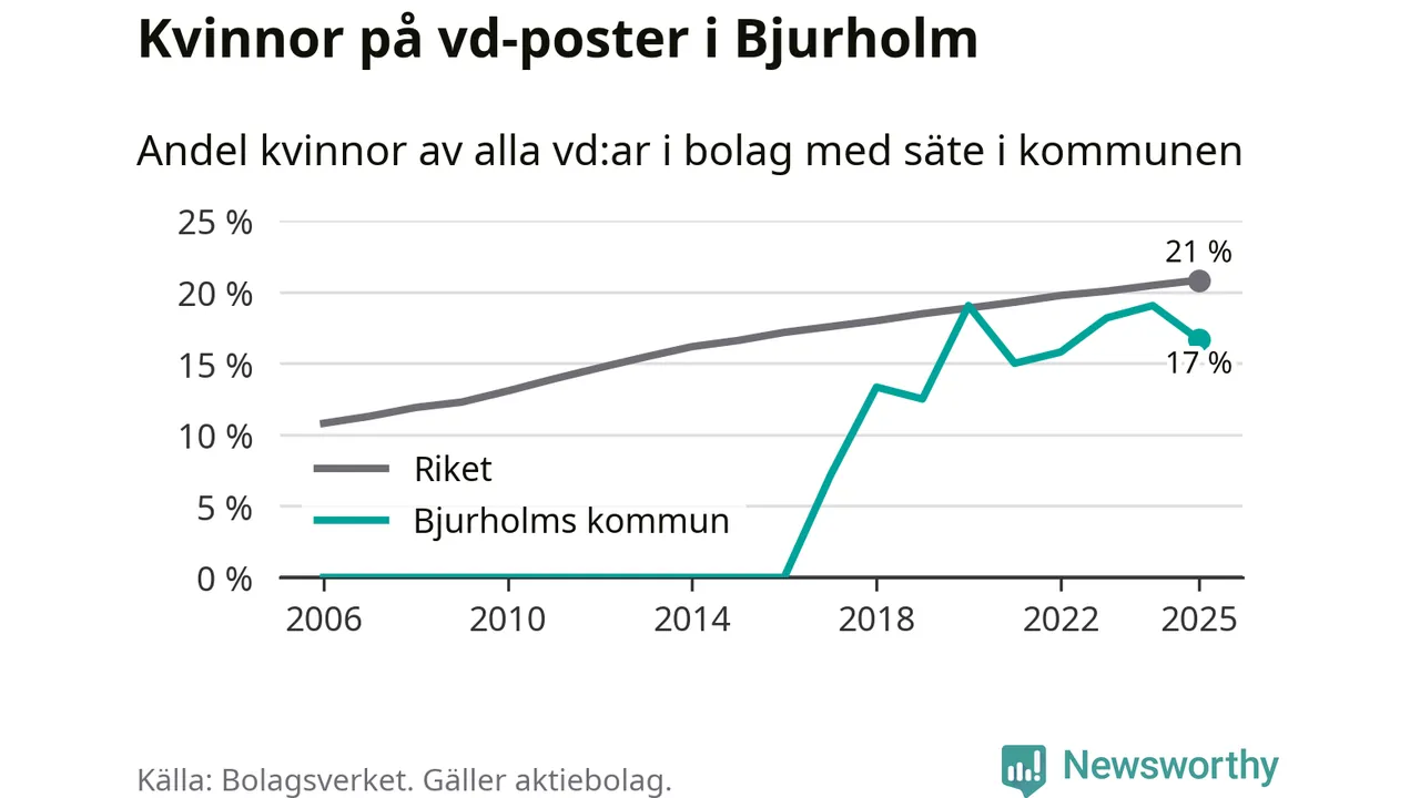 17 procent av aktiebolagen med registrerad vd i Bjurholm hade en kvinna på posten vid årsskiftet. Det innebär att på varje kvinnlig vd går fem män.