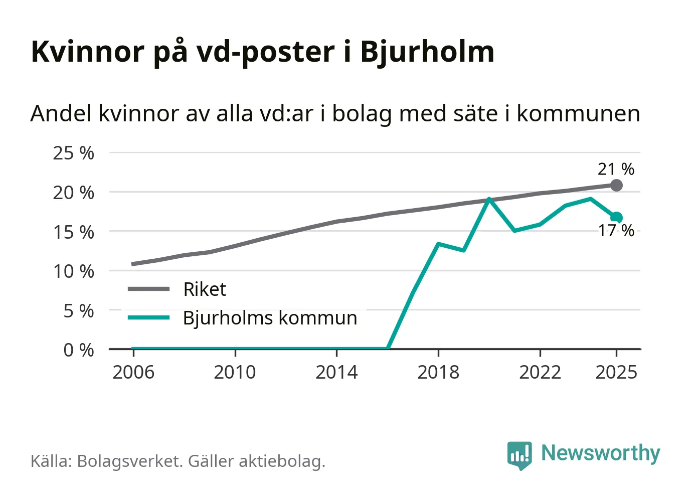 Bara var femte svenskt aktiebolag leds av en kvinna. I Bjurholm är andelen ännu lägre. Det visar siffror från Bolagsverket.
