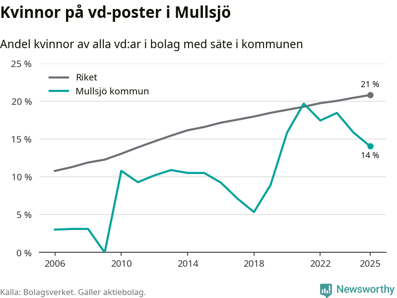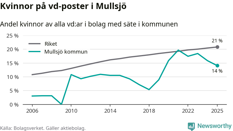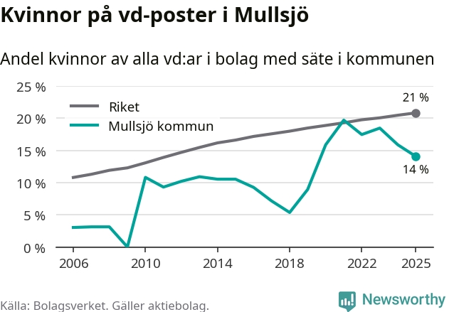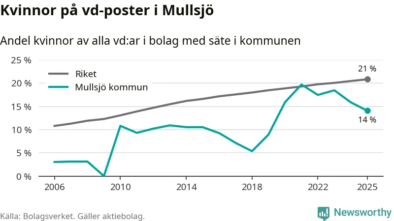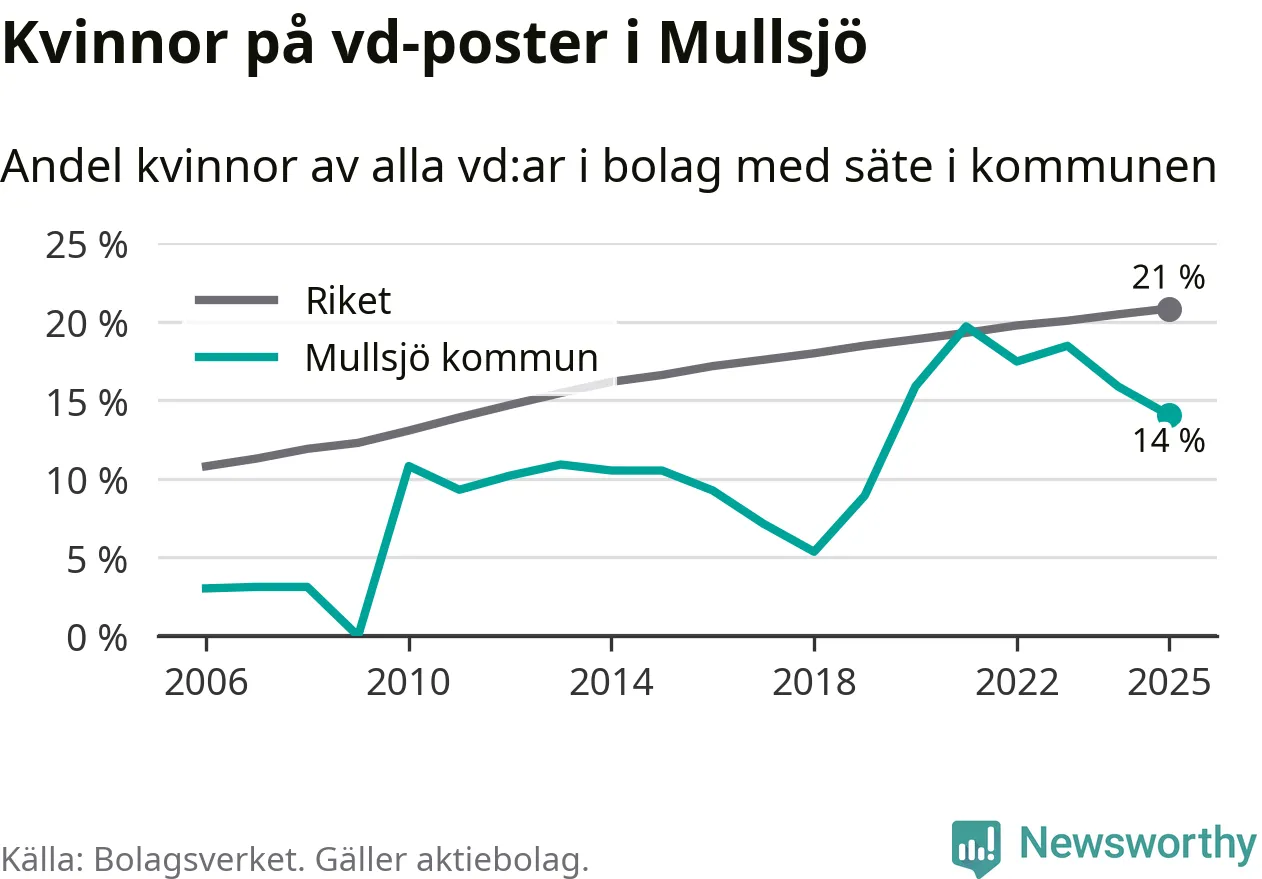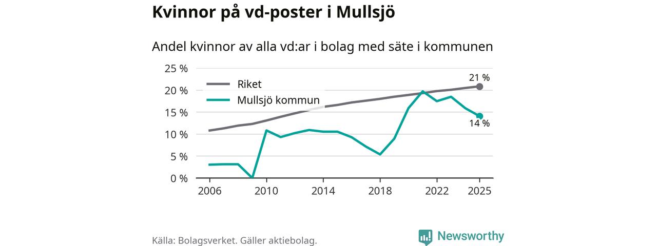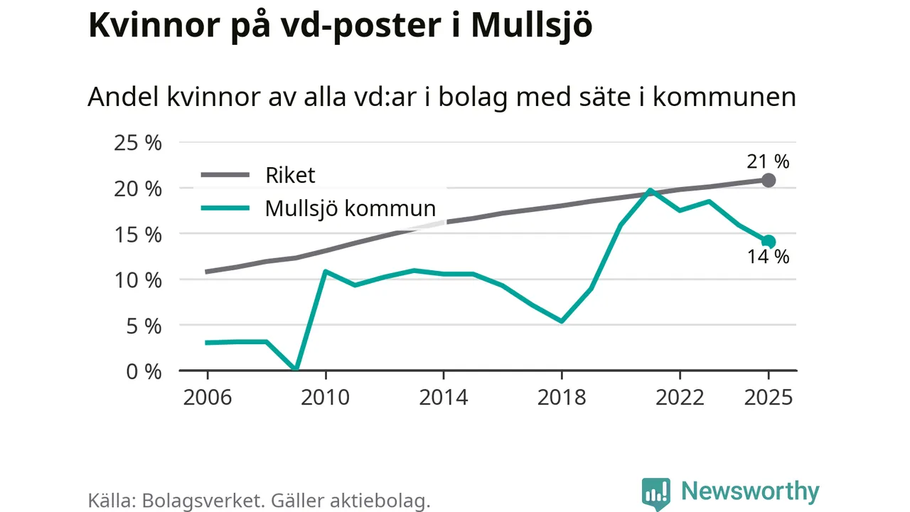 14 procent av aktiebolagen med registrerad vd i Mullsjö hade en kvinna på posten vid årsskiftet. Det innebär att på varje kvinnlig vd går sex män.
