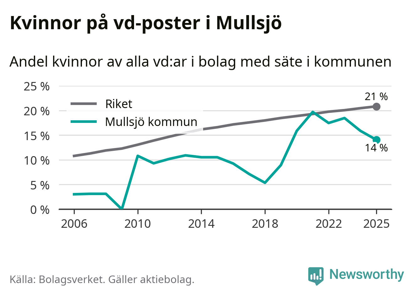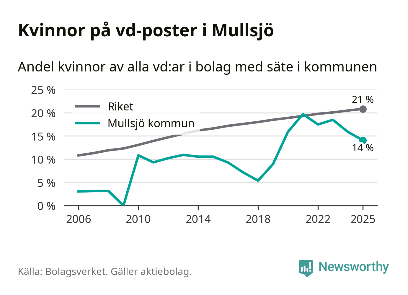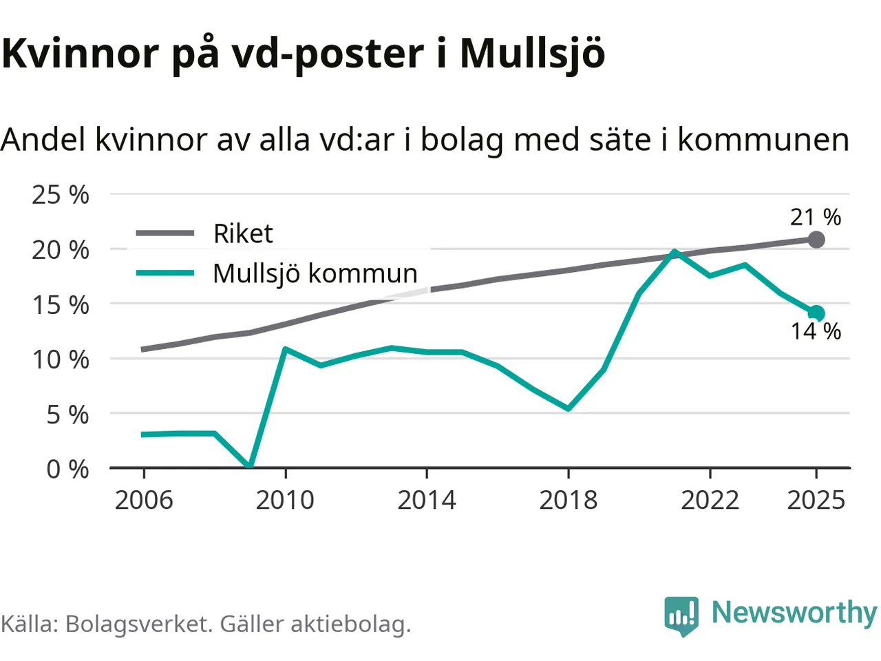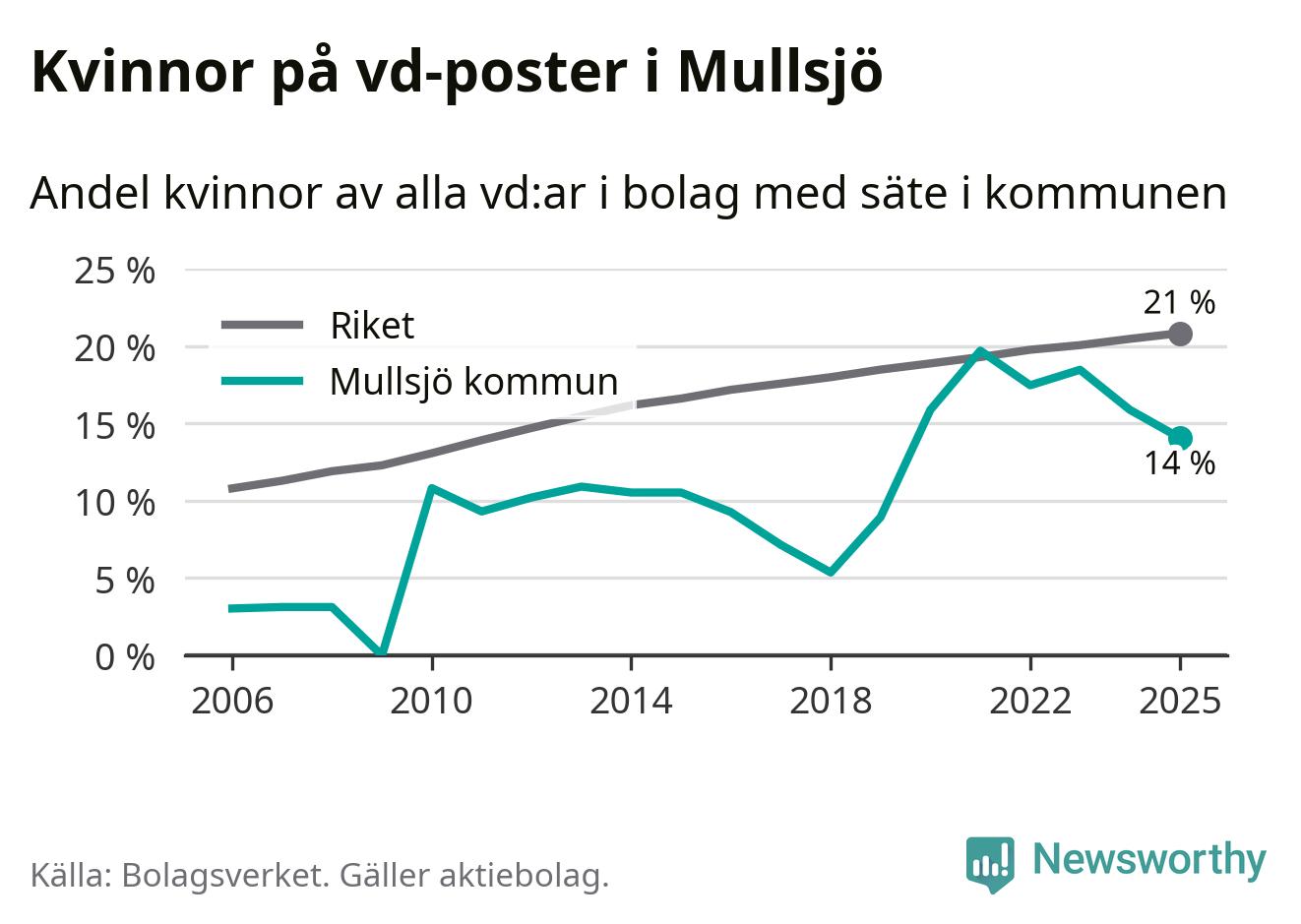 14 procent av aktiebolagen med registrerad vd i Mullsjö hade en kvinna på posten vid årsskiftet. Det innebär att på varje kvinnlig vd går sex män.