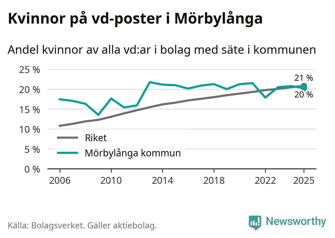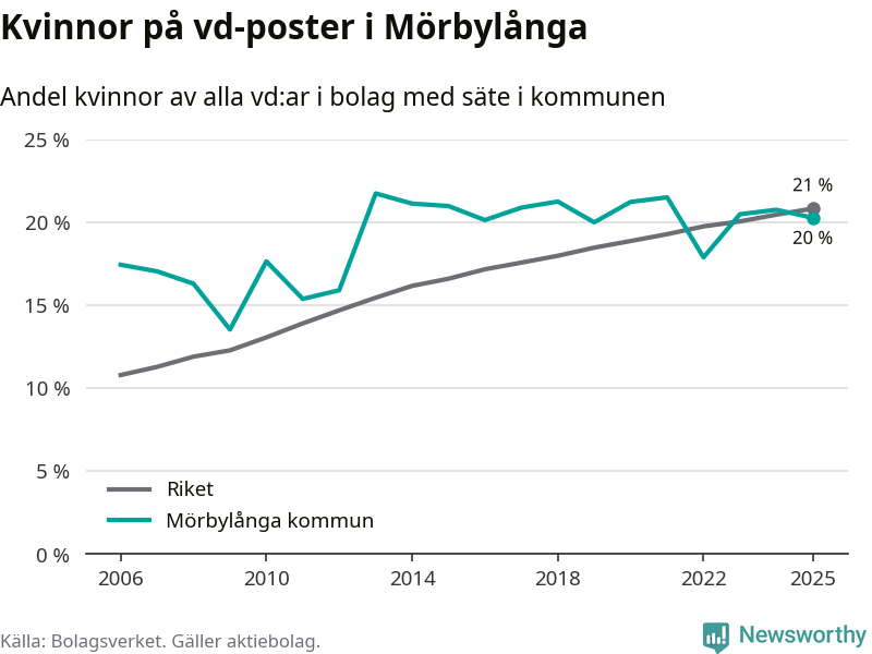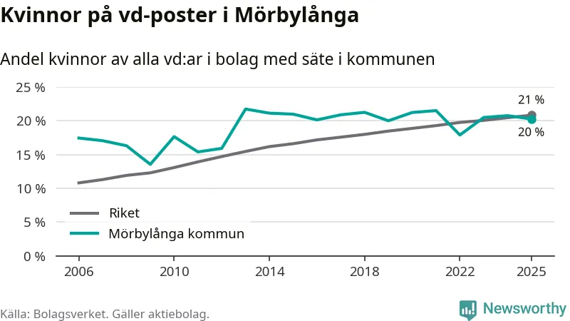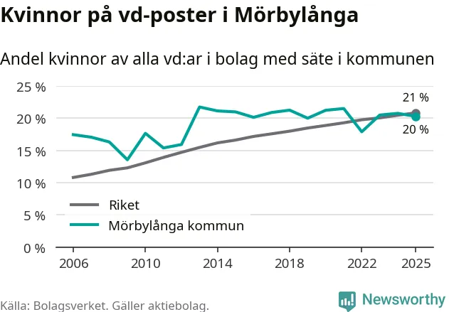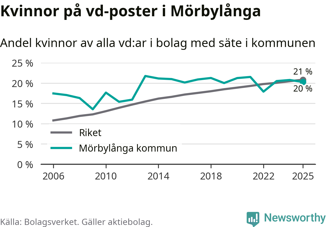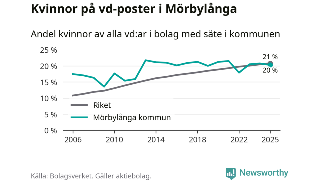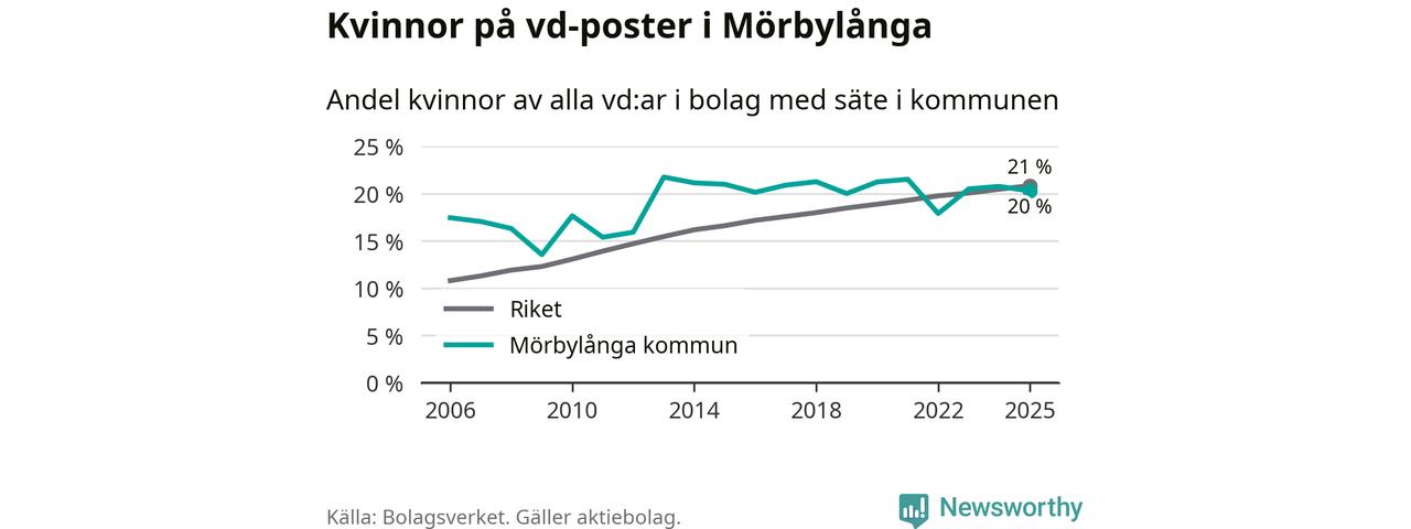 Delar man upp vd:arna i Mörbylånga efter ålder är andelen kvinnor högre bland dem som är 50 år och äldre. Där är 25 procent kvinnor, jämfört med 14 procent i den yngre gruppen. I riket som helhet är 22 procent av vd:arna som är under 50 år kvinnor, medan motsvarande siffra för direktörerna som är äldre är 20 procent.