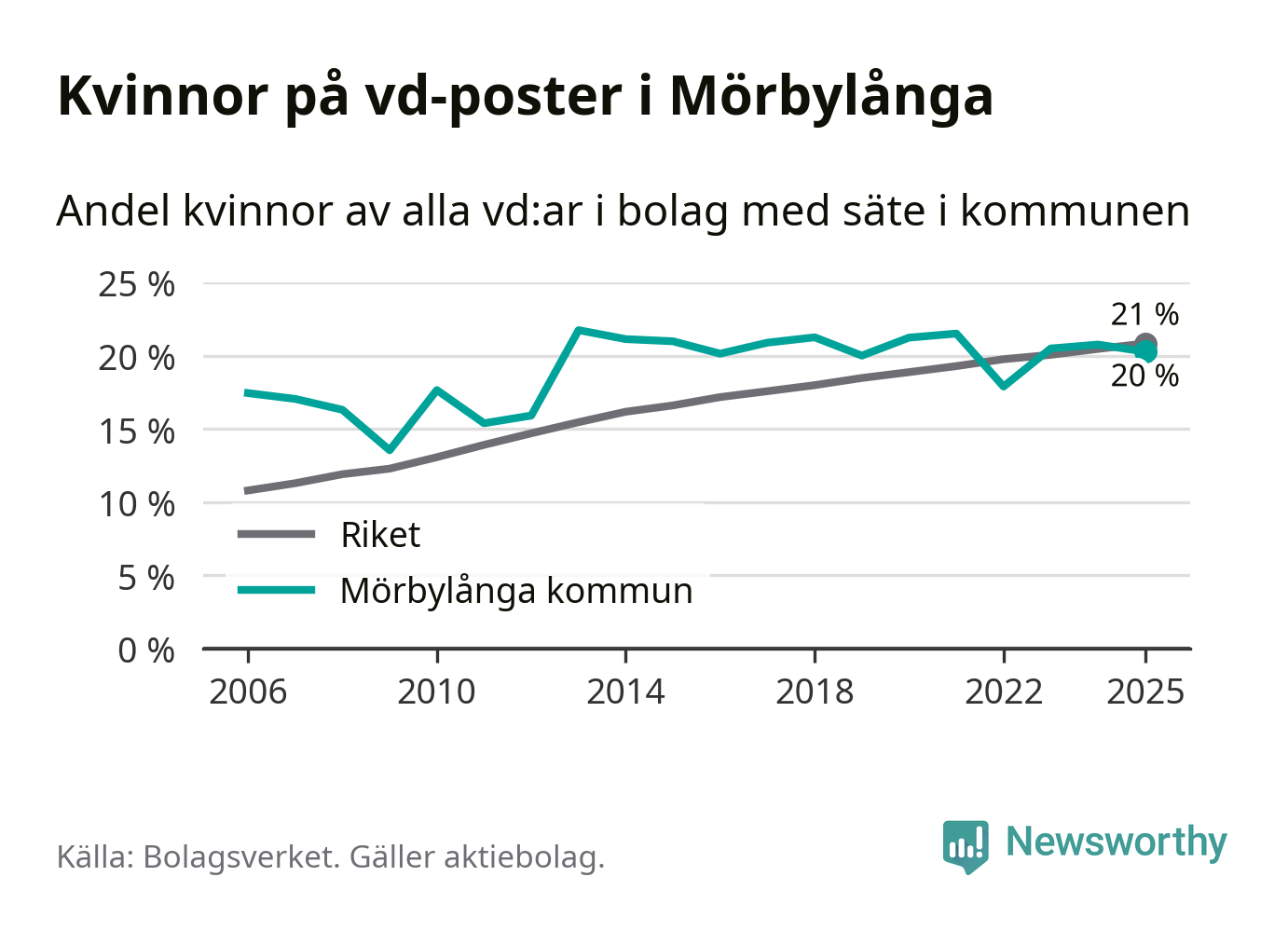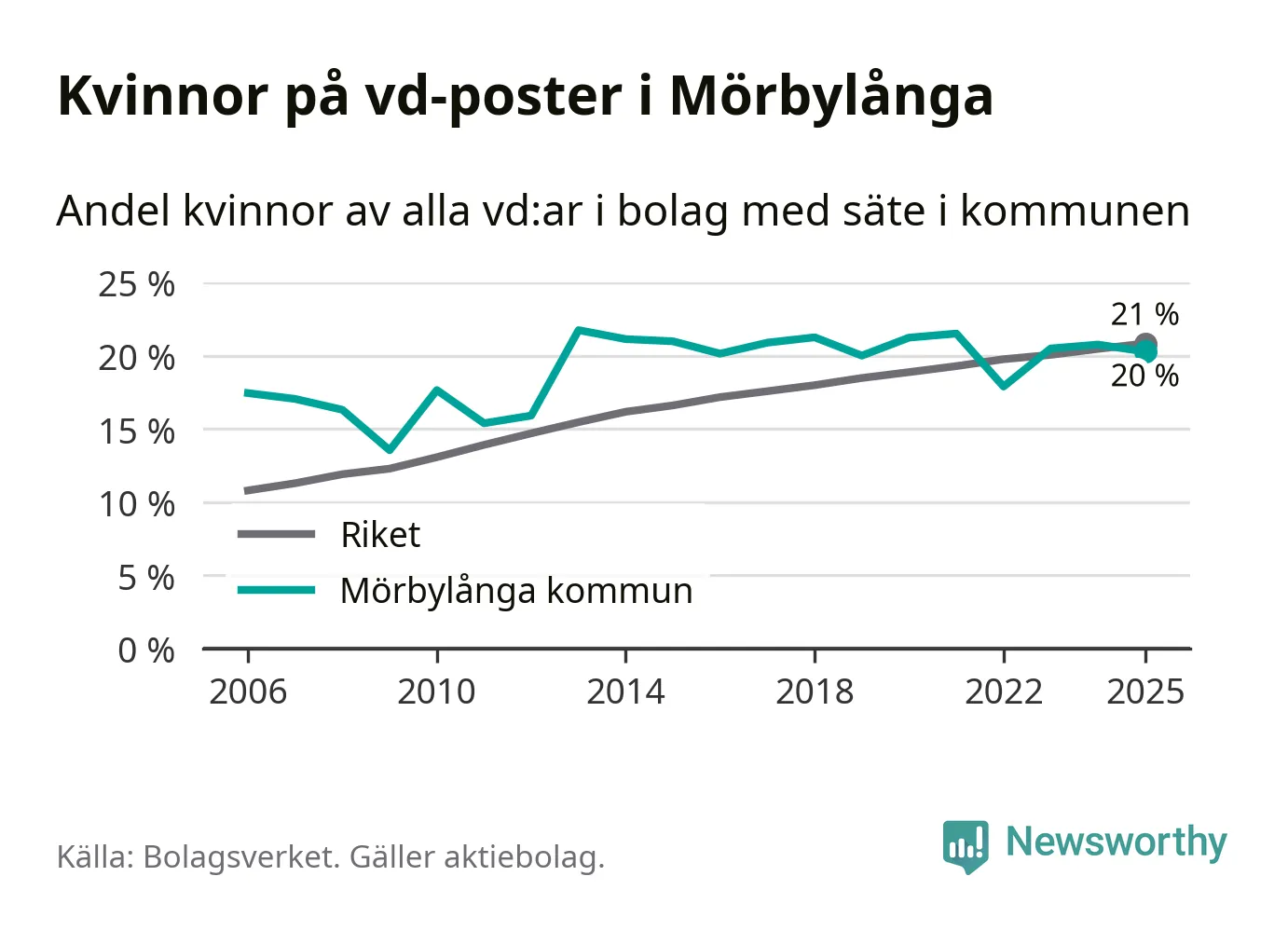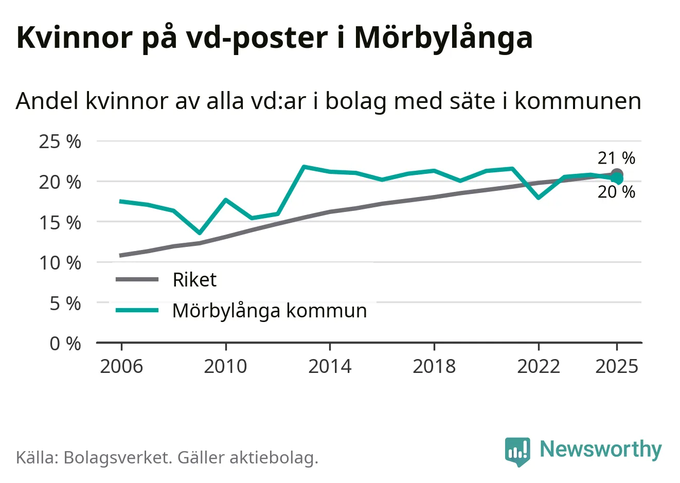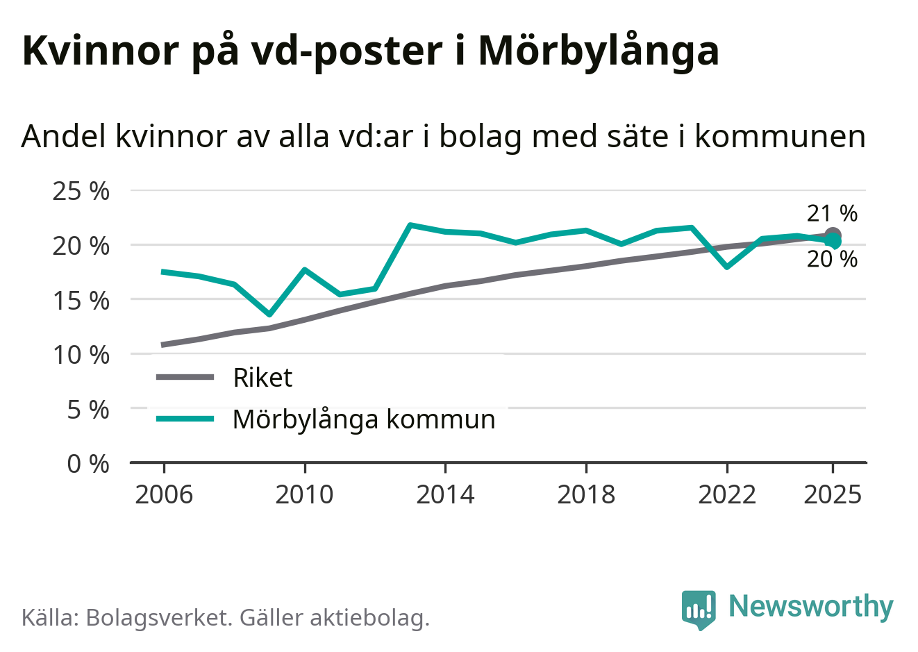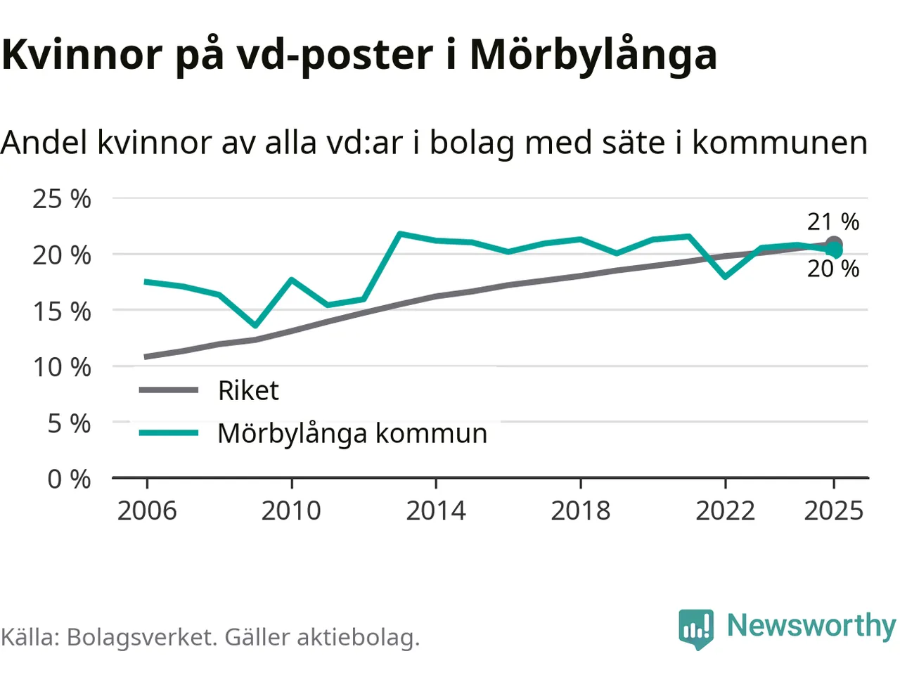 Delar man upp vd:arna i Mörbylånga efter ålder är andelen kvinnor högre bland dem som är 50 år och äldre. Där är 25 procent kvinnor, jämfört med 14 procent i den yngre gruppen. I riket som helhet är 22 procent av vd:arna som är under 50 år kvinnor, medan motsvarande siffra för direktörerna som är äldre är 20 procent.