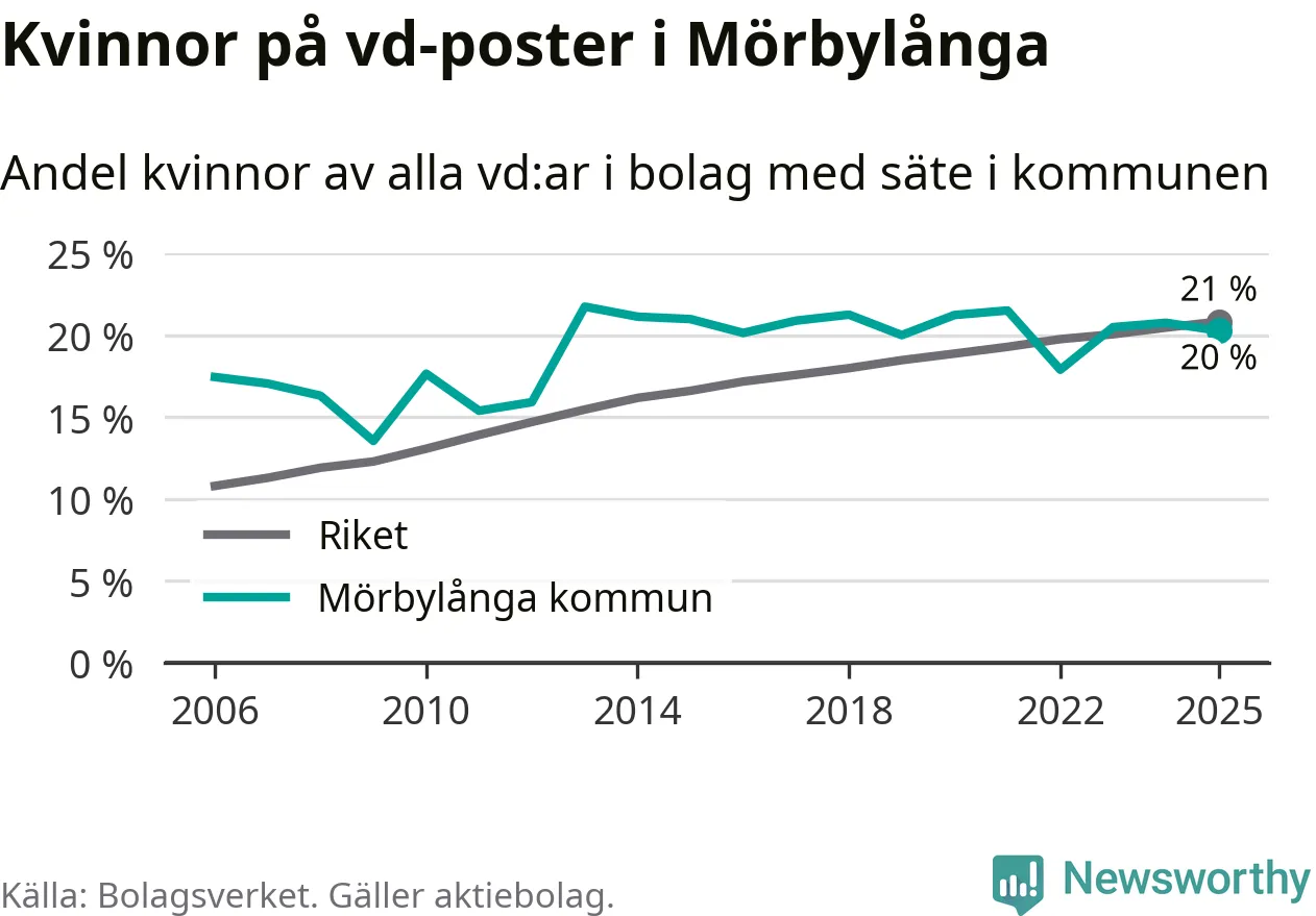 Det är fortfarande män som är vd i nästan fyra av fem bolag i Sverige och könsfördelningen alltså ser ungefär likadan ut i Mörbylånga. Högst andel kvinnliga vd:ar i Kalmar län har företagen med säte i Borgholms kommun, 24 procent. Lägst är andelen bland företagen med säte i Hultsfreds kommun, 13 procent.