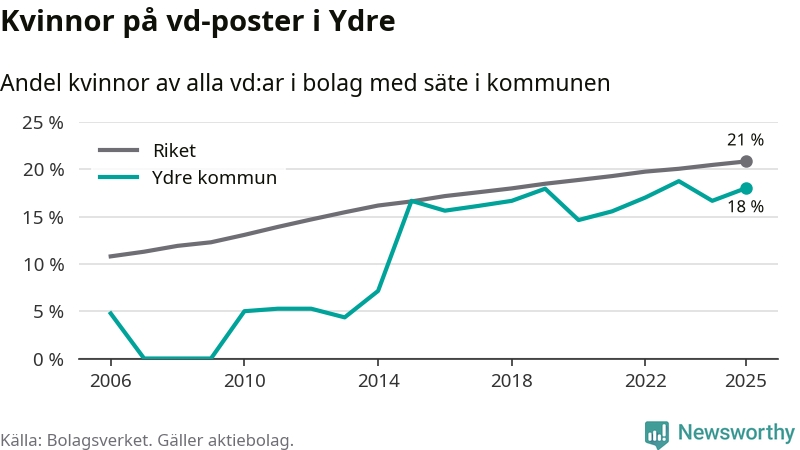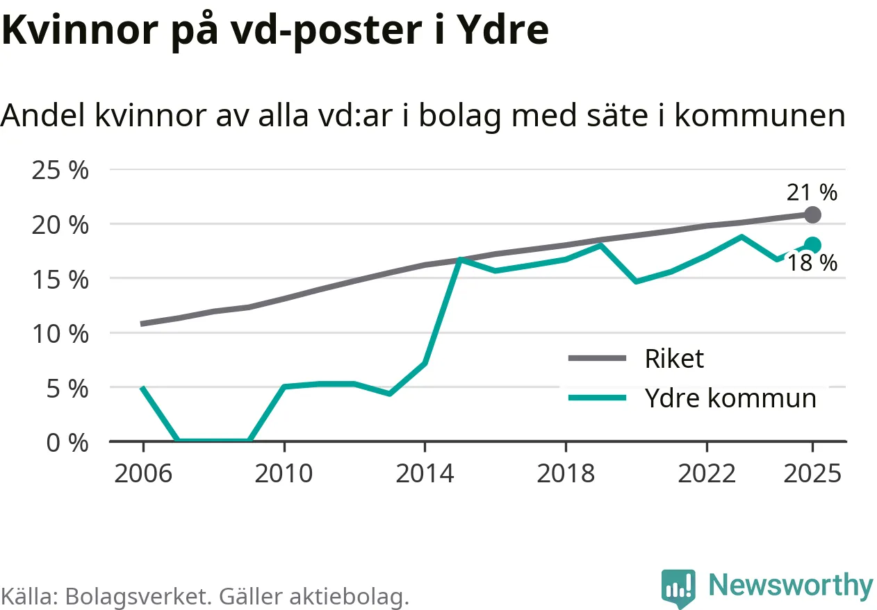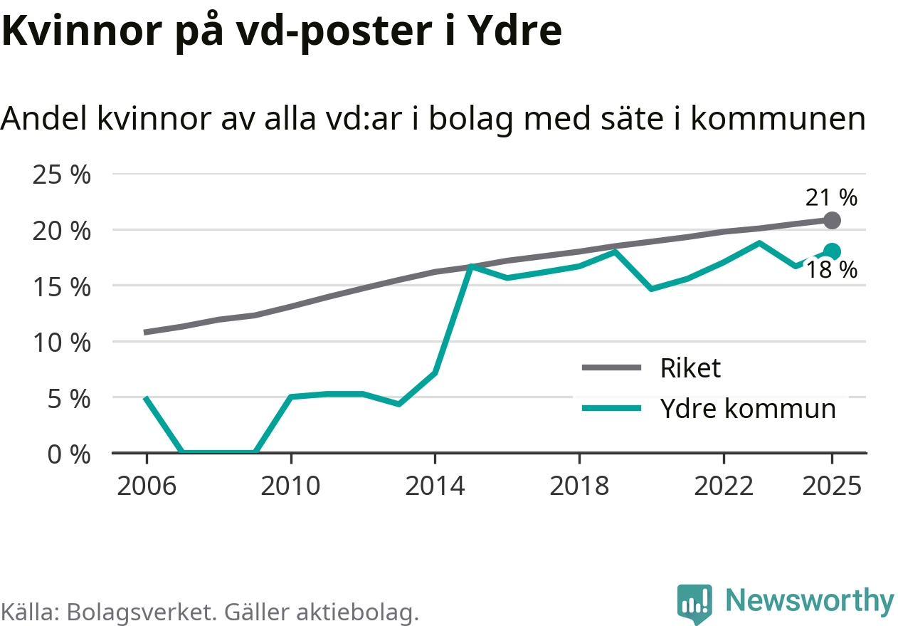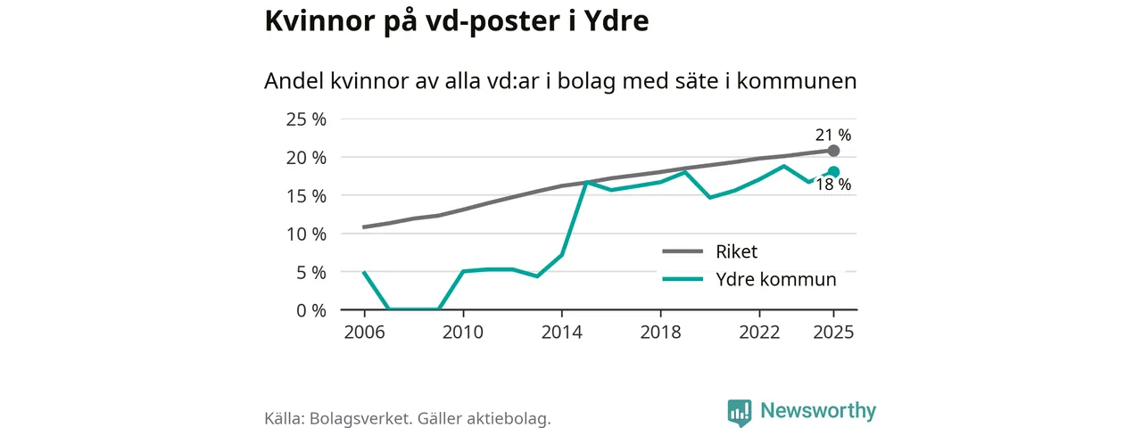 18 procent av aktiebolagen med registrerad vd i Ydre hade en kvinna på posten vid årsskiftet. Det innebär att på varje kvinnlig vd går mer än fyra män.