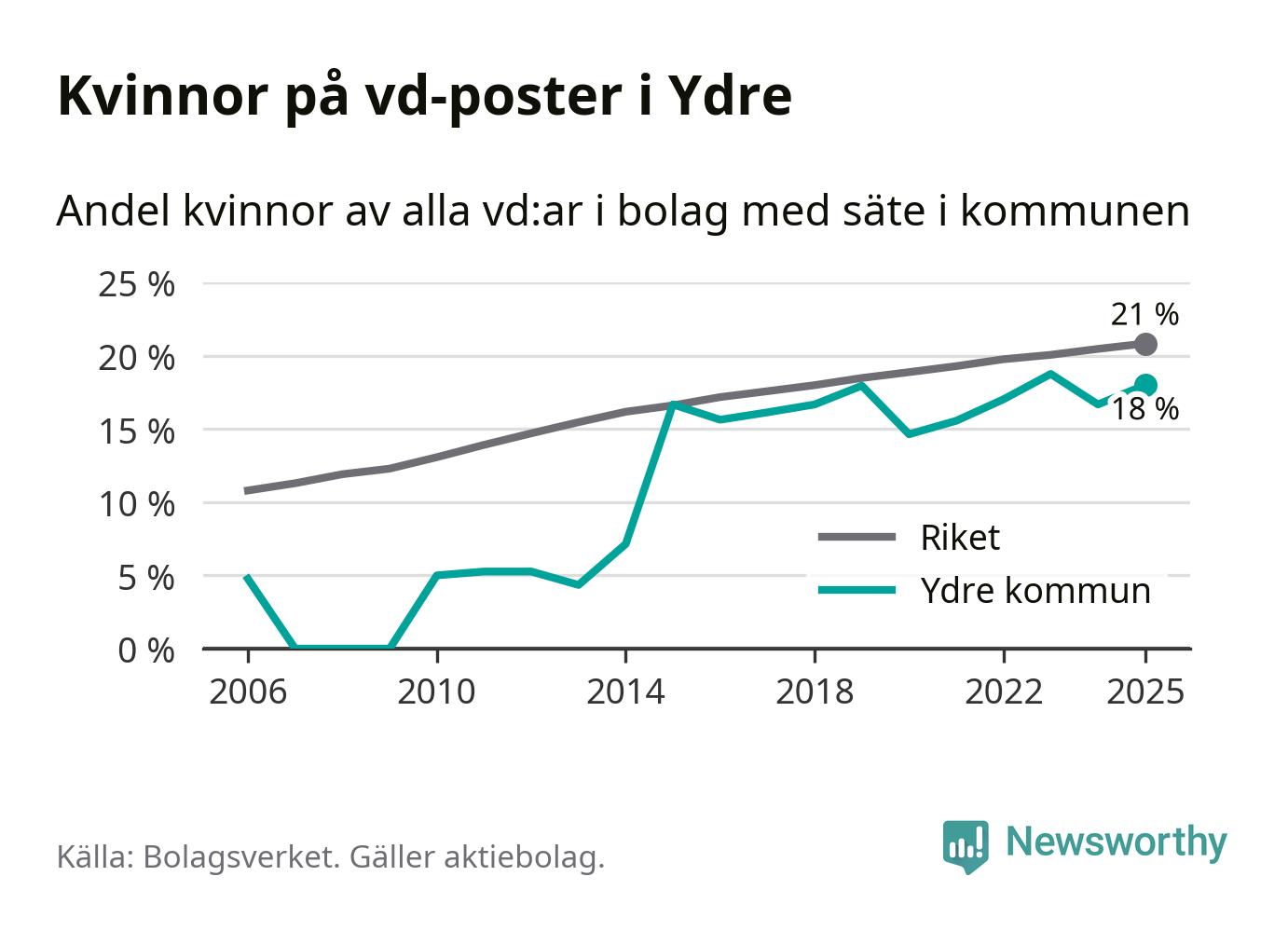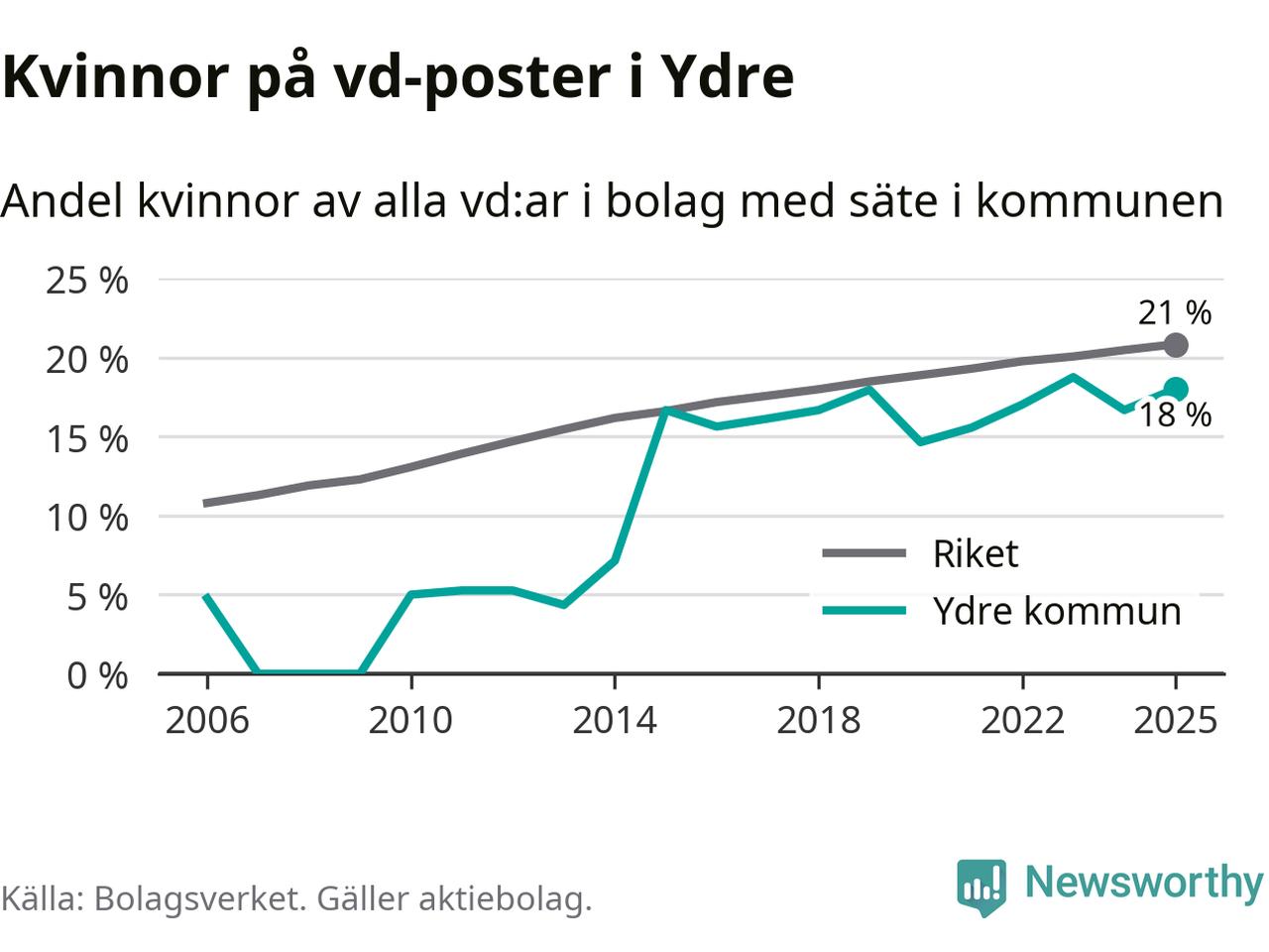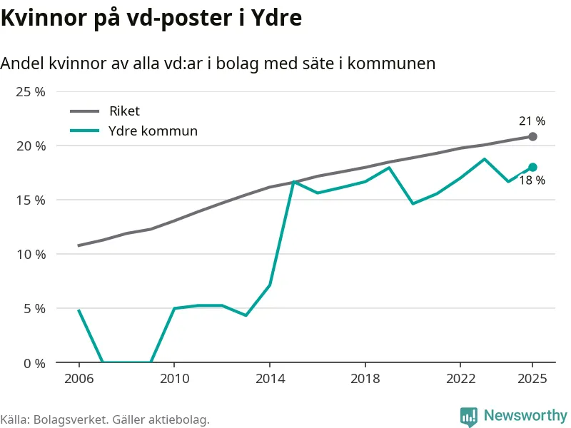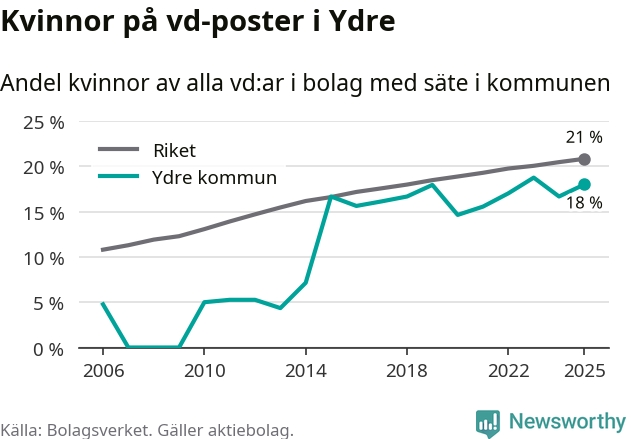 18 procent av aktiebolagen med registrerad vd i Ydre hade en kvinna på posten vid årsskiftet. Det innebär att på varje kvinnlig vd går mer än fyra män.