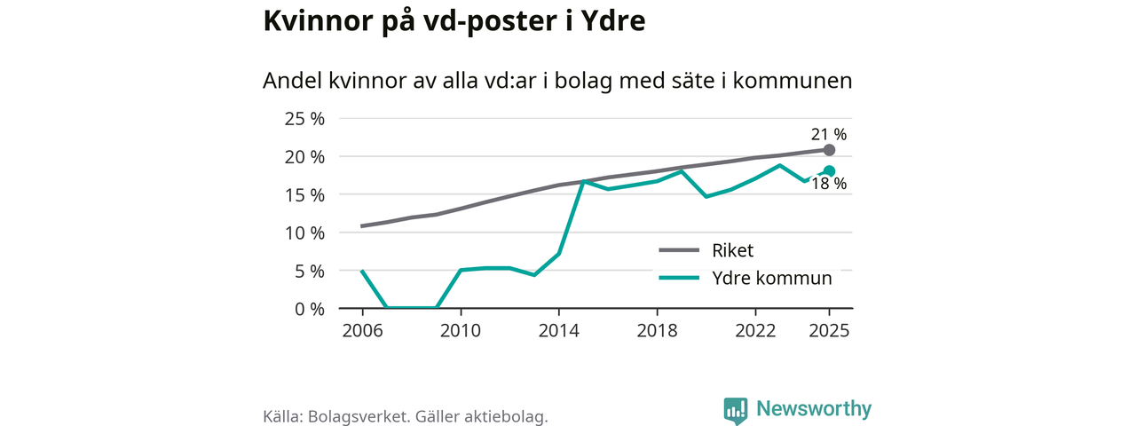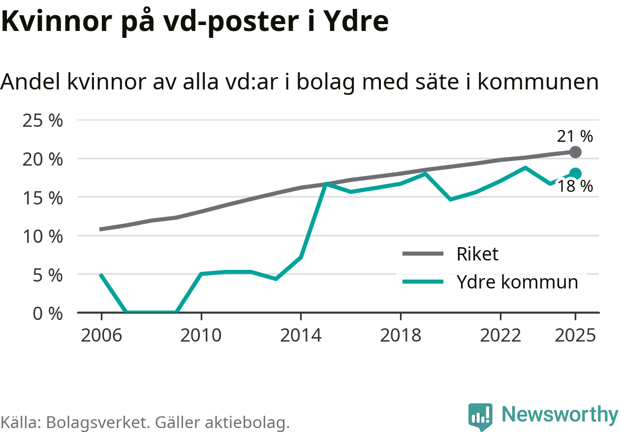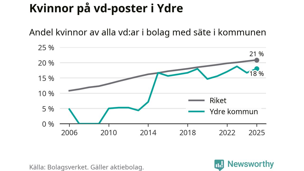 Det är fortfarande män som är vd i nästan fyra av fem bolag i Sverige och i Ydre är det alltså en lägre andel kvinnor på vd-posten. Högst andel kvinnliga vd:ar i Östergötland har företagen med säte i Vadstena kommun, 26 procent. Lägst är andelen bland företagen med säte i Boxholms kommun, 13 procent. I Boxholm rör det sig om 53 företag totalt och även små förändringar får stora utslag i andelen kvinnliga vd:ar.