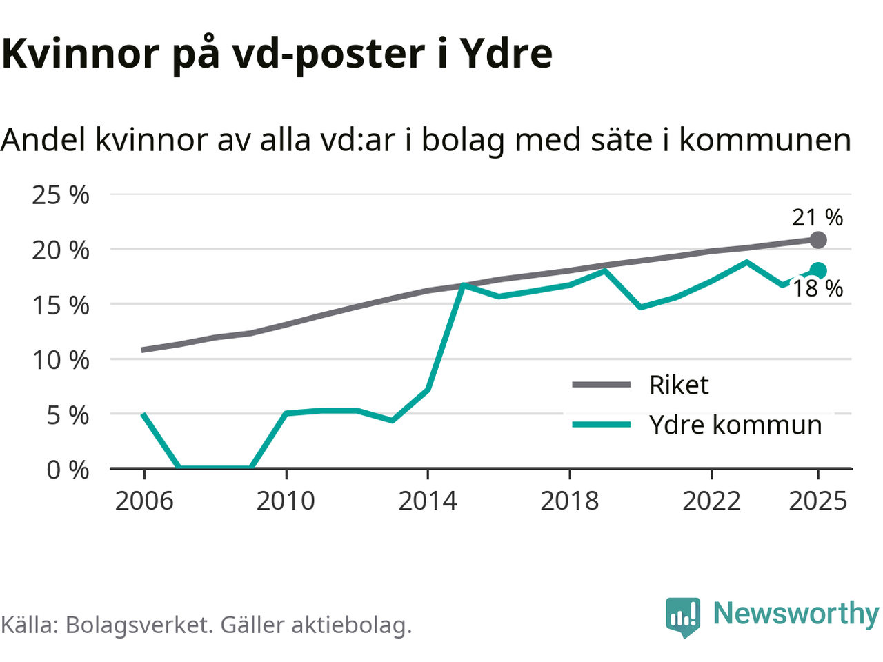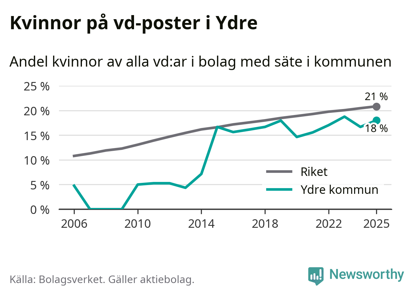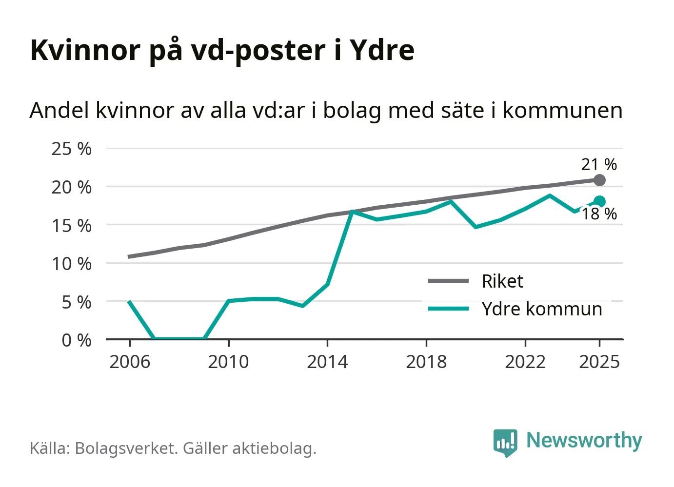 Det är fortfarande män som är vd i nästan fyra av fem bolag i Sverige och i Ydre är det alltså en lägre andel kvinnor på vd-posten. Högst andel kvinnliga vd:ar i Östergötland har företagen med säte i Vadstena kommun, 26 procent. Lägst är andelen bland företagen med säte i Boxholms kommun, 13 procent. I Boxholm rör det sig om 53 företag totalt och även små förändringar får stora utslag i andelen kvinnliga vd:ar.