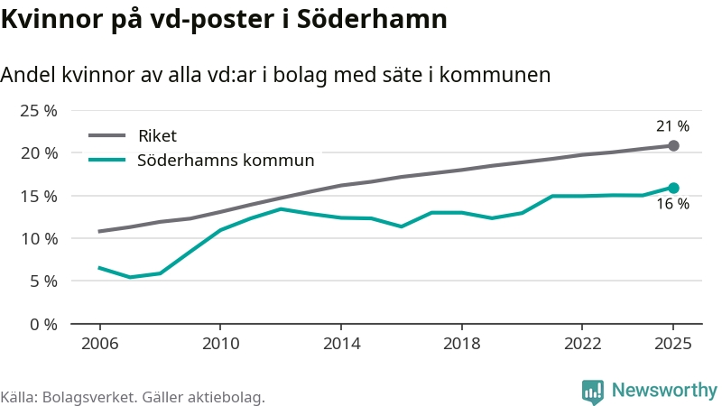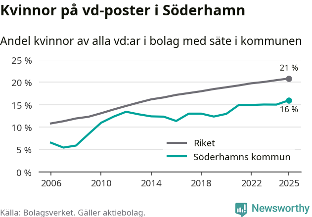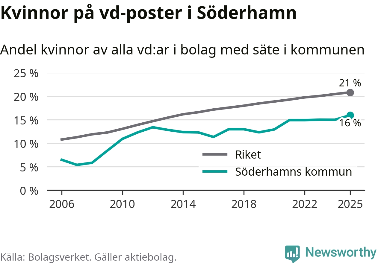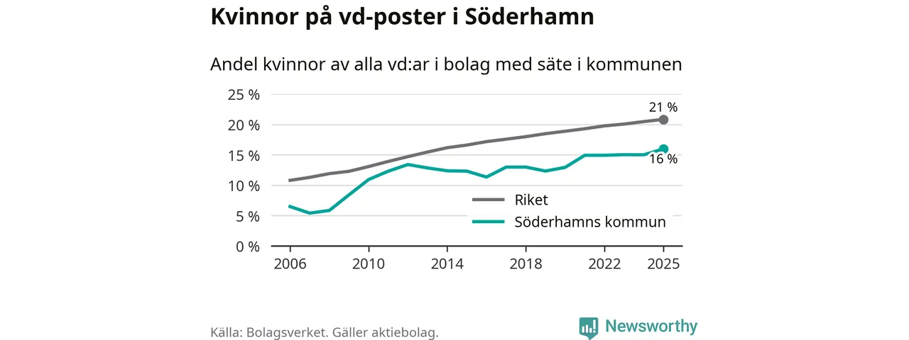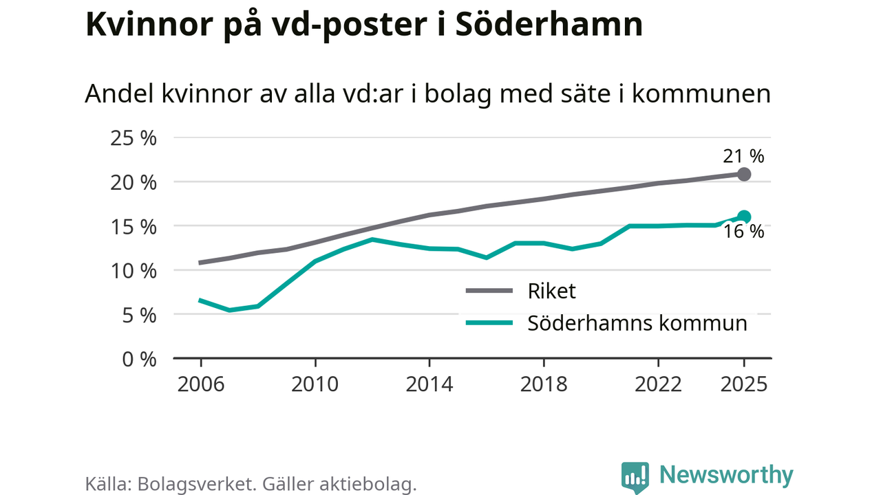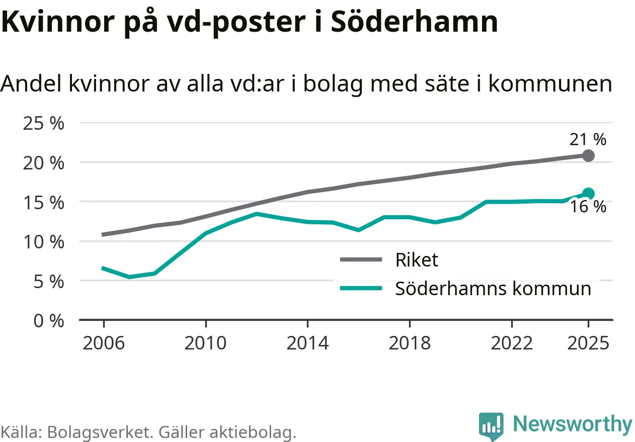 16 procent av aktiebolagen med registrerad vd i Söderhamn hade en kvinna på posten vid årsskiftet. Det innebär att på varje kvinnlig vd går fem män.