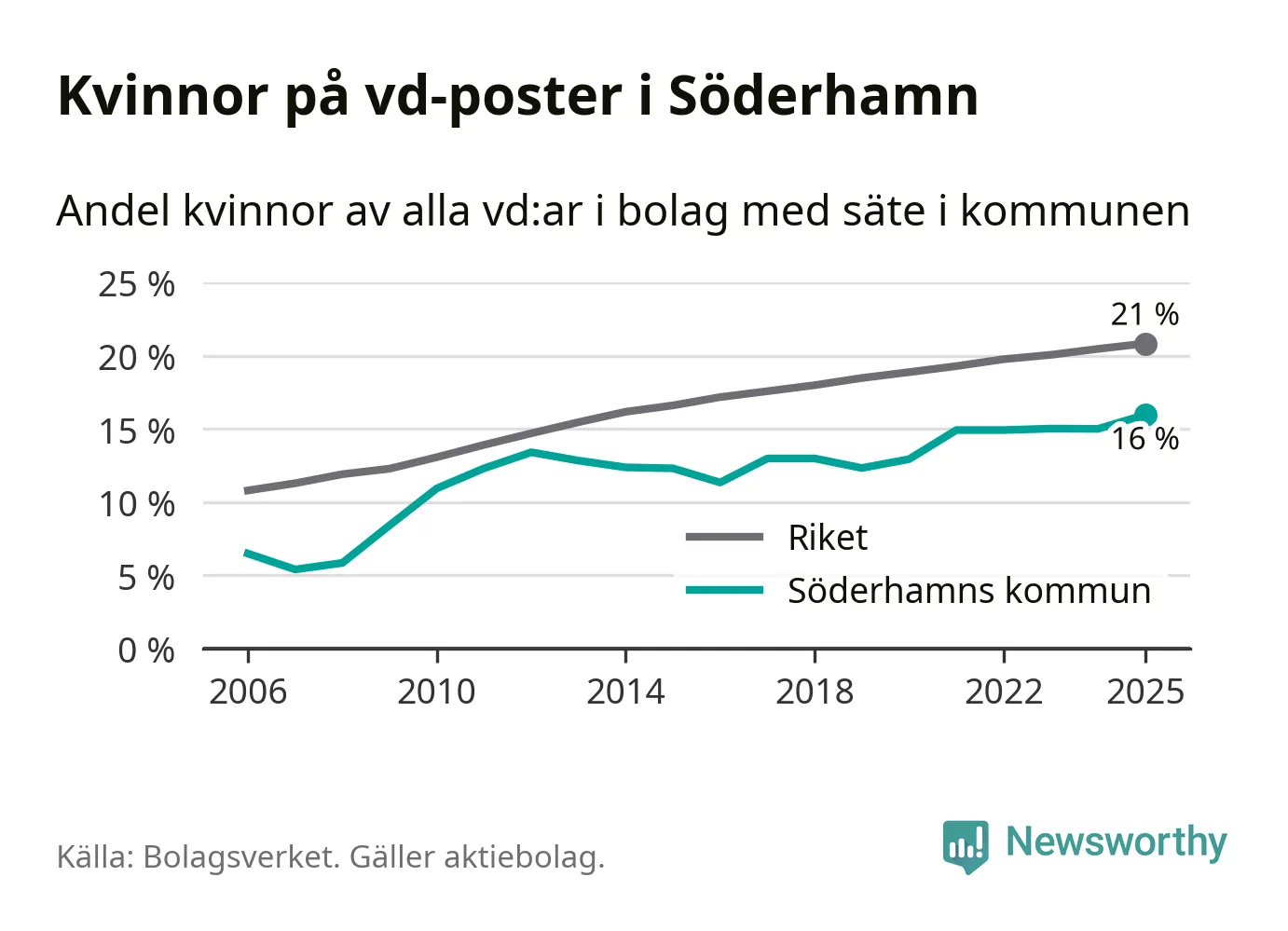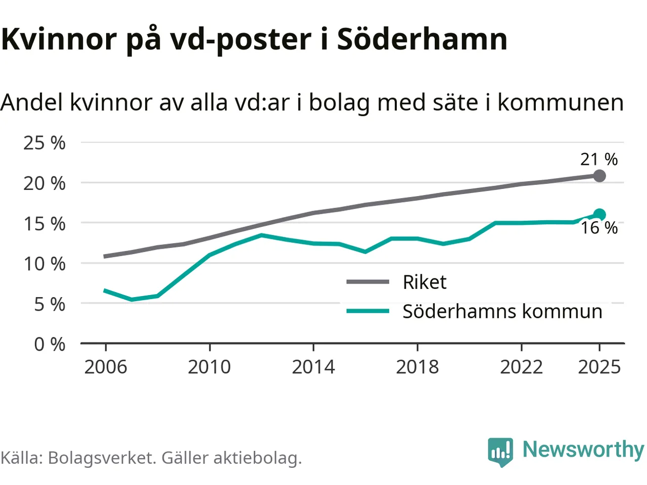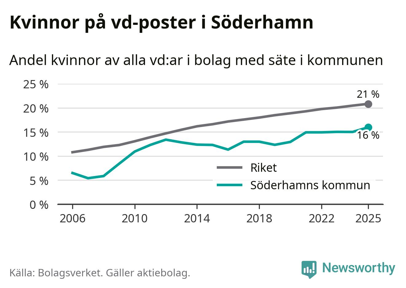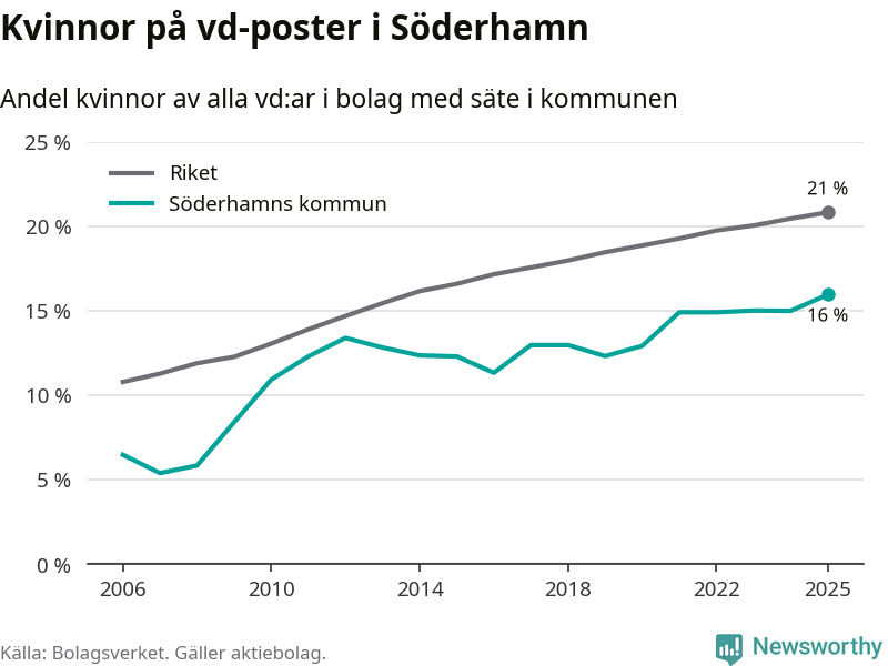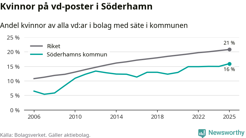 16 procent av aktiebolagen med registrerad vd i Söderhamn hade en kvinna på posten vid årsskiftet. Det innebär att på varje kvinnlig vd går fem män.