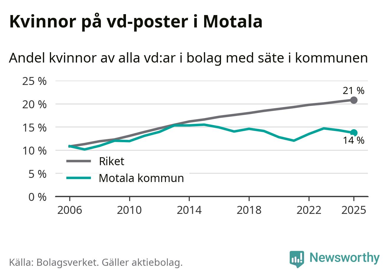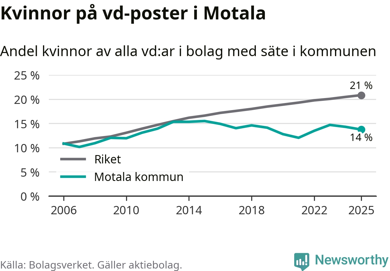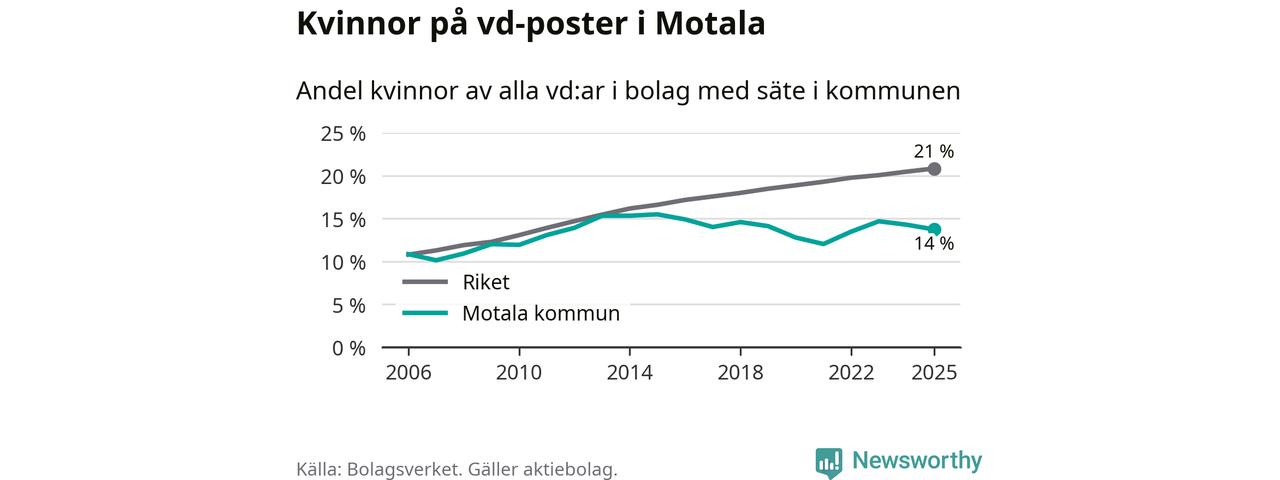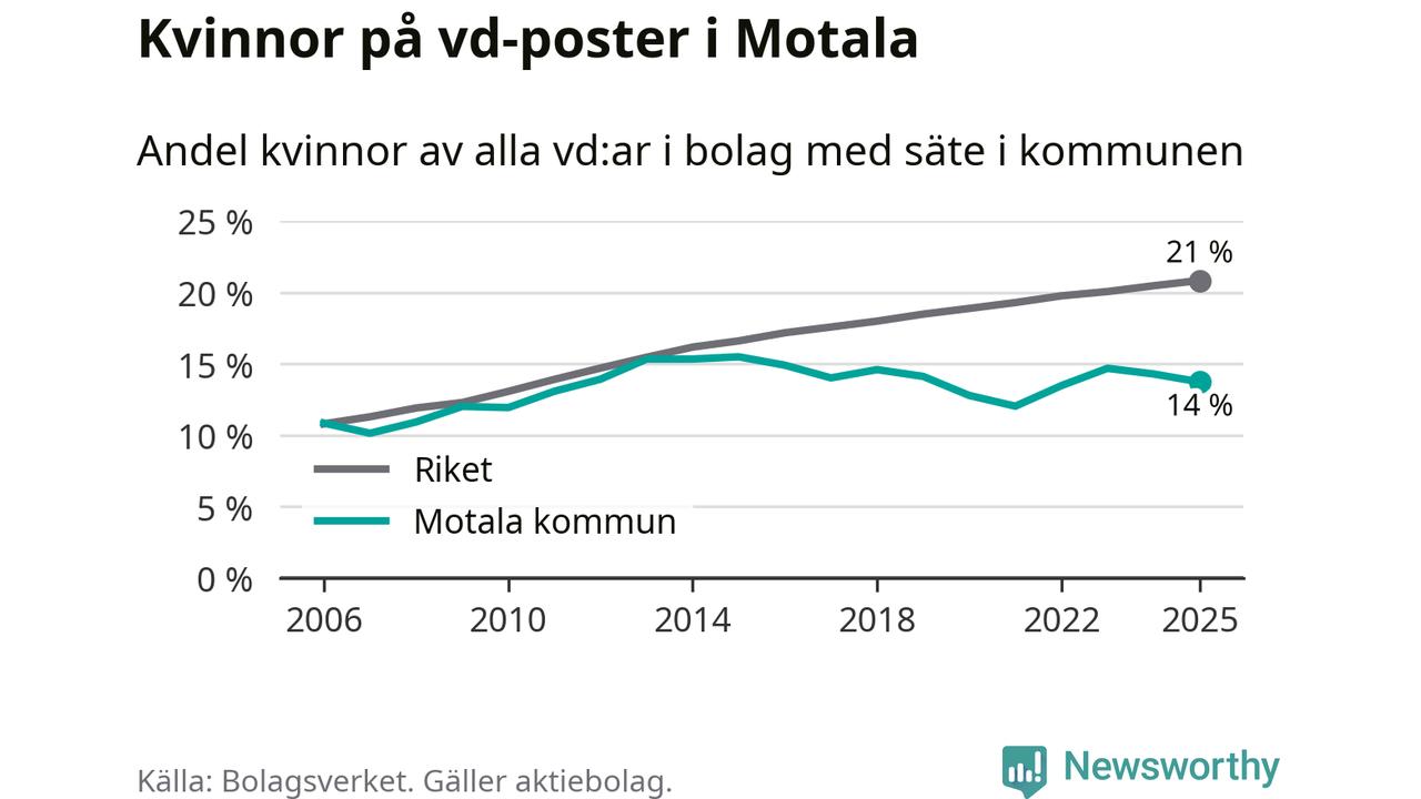 Det är fortfarande män som är vd i nästan fyra av fem bolag i Sverige och i Motala är det alltså en lägre andel kvinnor på vd-posten. 14 procent är den näst lägsta andelen av kommunerna i Östergötland. Högst andel kvinnliga vd:ar i Östergötland har företagen med säte i Vadstena kommun, 26 procent. Lägst är andelen bland företagen med säte i Boxholms kommun, 13 procent. I Boxholm rör det sig om 53 företag totalt och även små förändringar får stora utslag i andelen kvinnliga vd:ar.