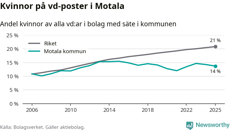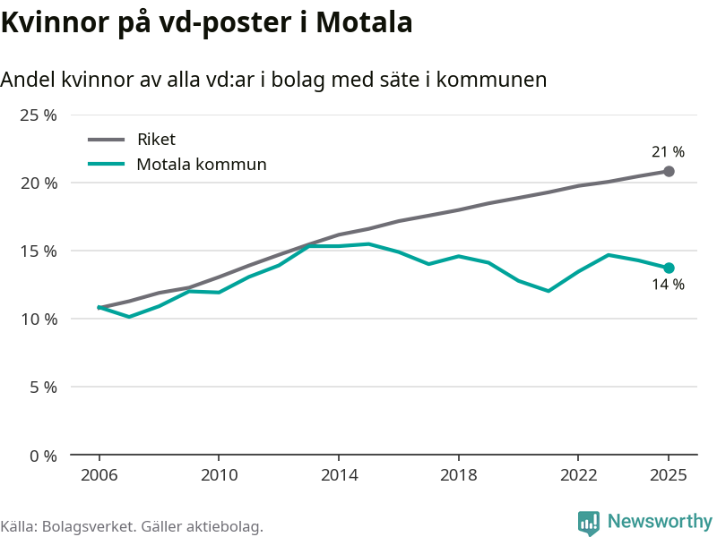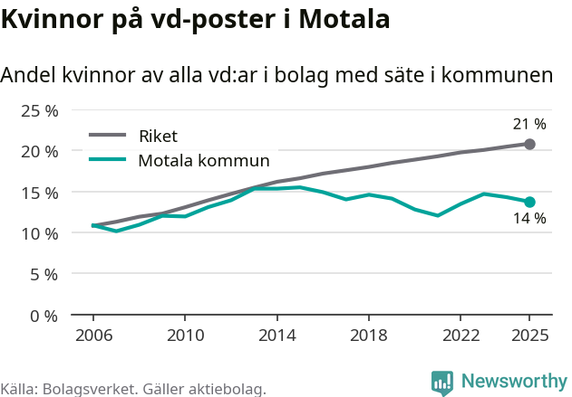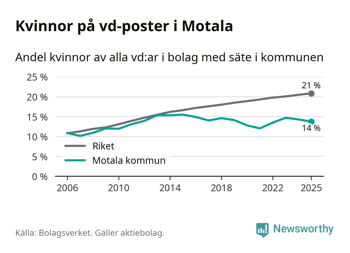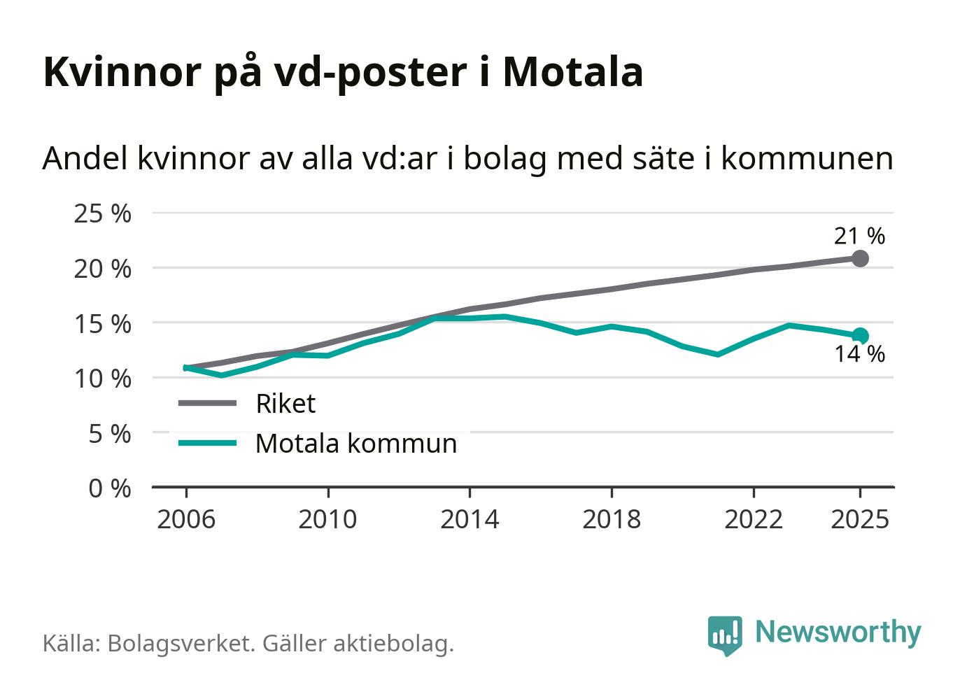 Det är fortfarande män som är vd i nästan fyra av fem bolag i Sverige och i Motala är det alltså en lägre andel kvinnor på vd-posten. 14 procent är den näst lägsta andelen av kommunerna i Östergötland. Högst andel kvinnliga vd:ar i Östergötland har företagen med säte i Vadstena kommun, 26 procent. Lägst är andelen bland företagen med säte i Boxholms kommun, 13 procent. I Boxholm rör det sig om 53 företag totalt och även små förändringar får stora utslag i andelen kvinnliga vd:ar.