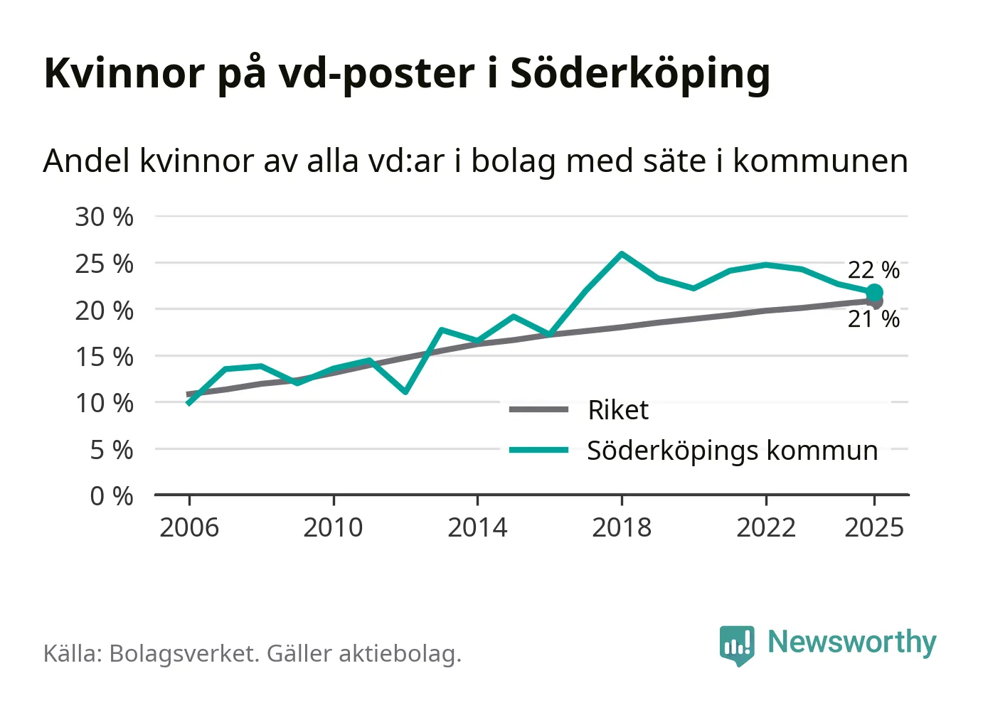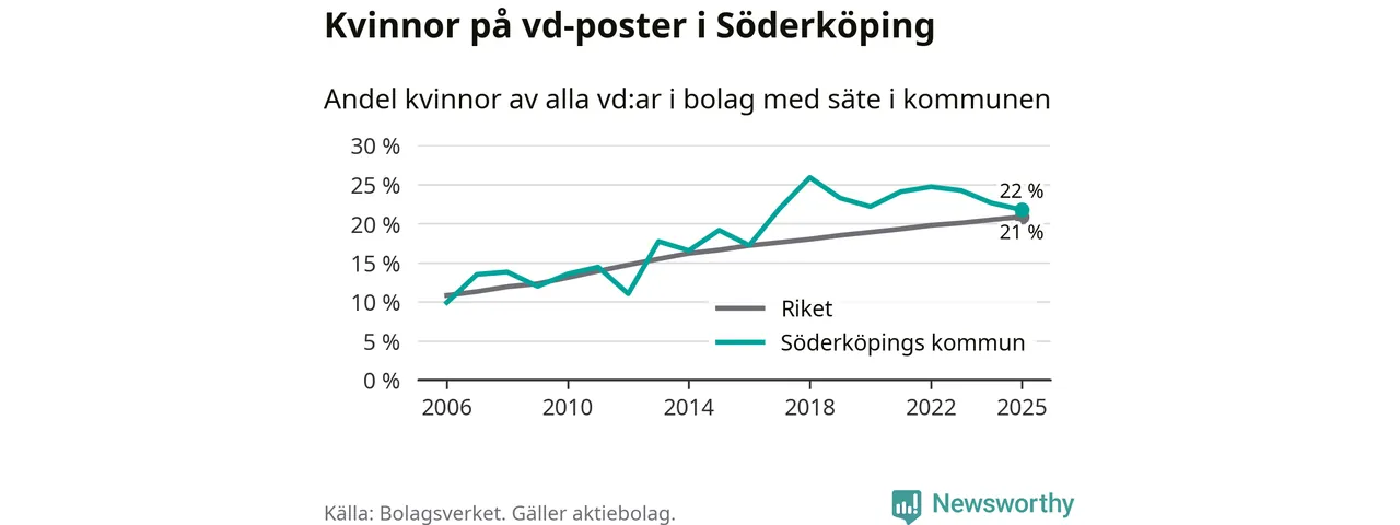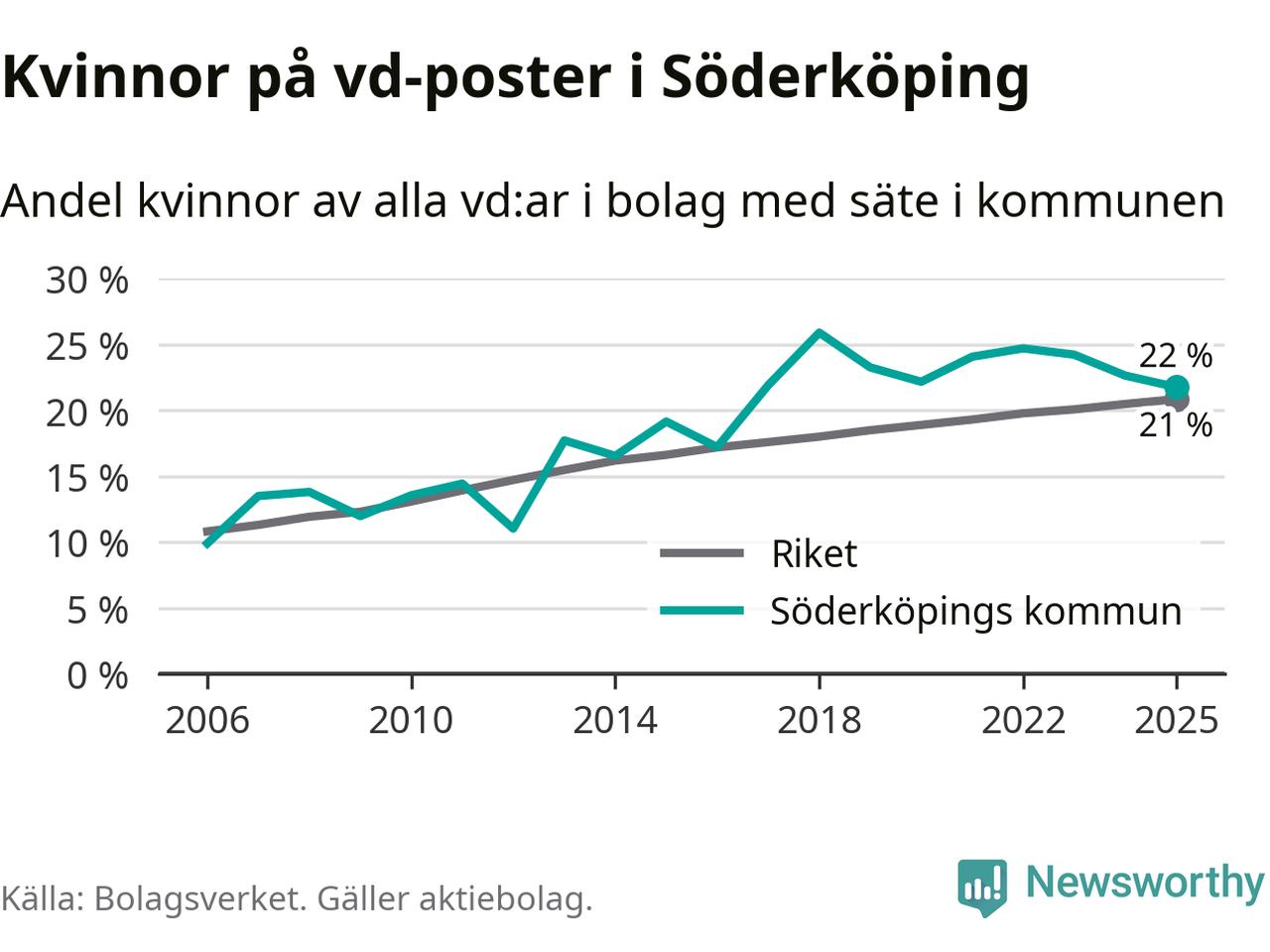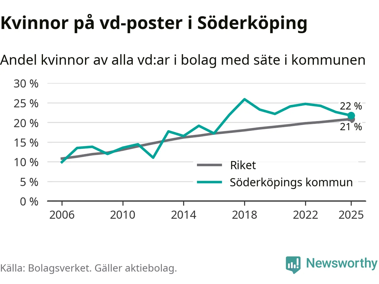 Det är fortfarande män som är vd i nästan fyra av fem bolag i Sverige och könsfördelningen alltså ser ungefär likadan ut i Söderköping. 22 procent är den näst högsta andelen av kommunerna i Östergötland. Högst andel kvinnliga vd:ar i Östergötland har företagen med säte i Vadstena kommun, 26 procent. Lägst är andelen bland företagen med säte i Boxholms kommun, 13 procent. I Boxholm rör det sig om 53 företag totalt och även små förändringar får stora utslag i andelen kvinnliga vd:ar.