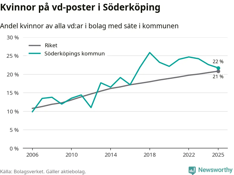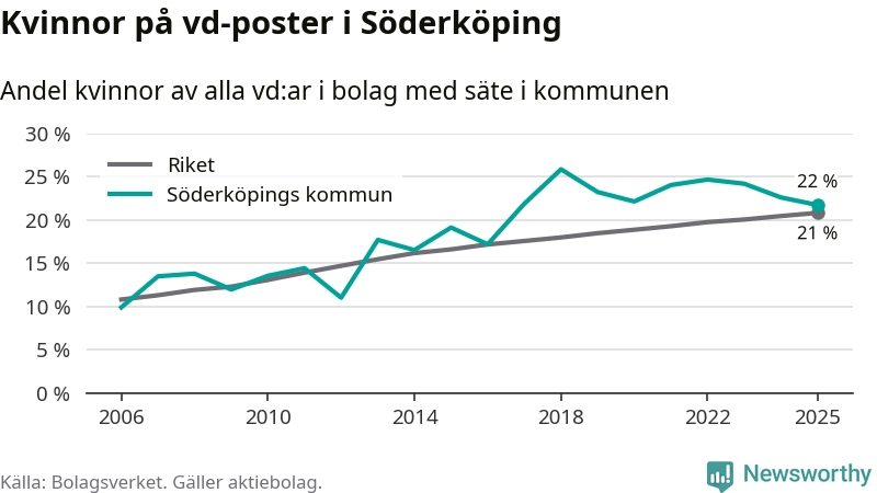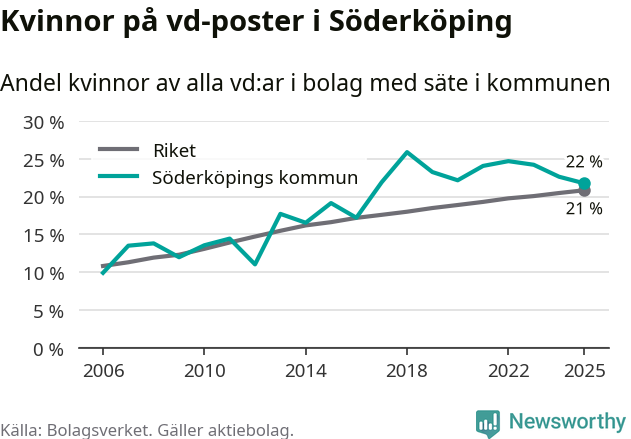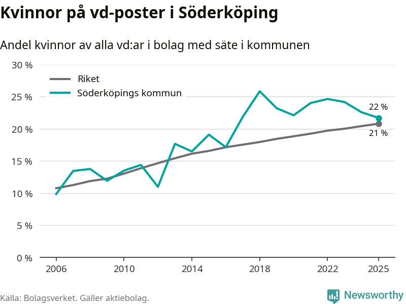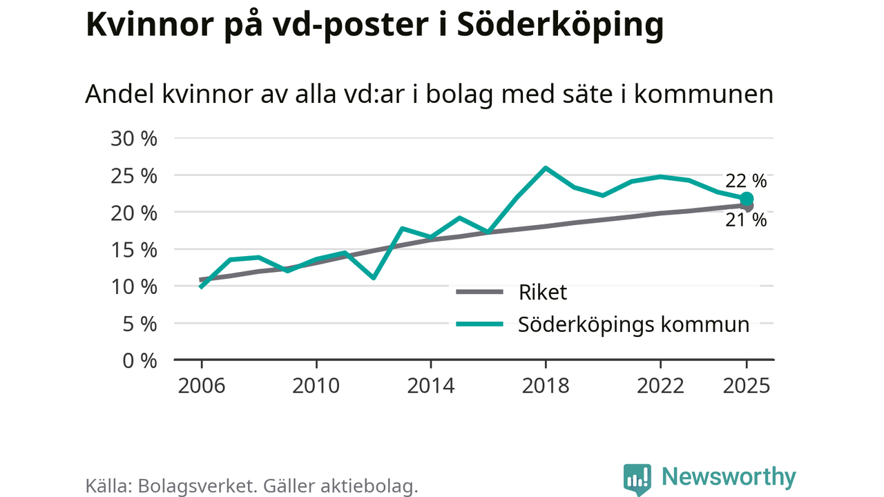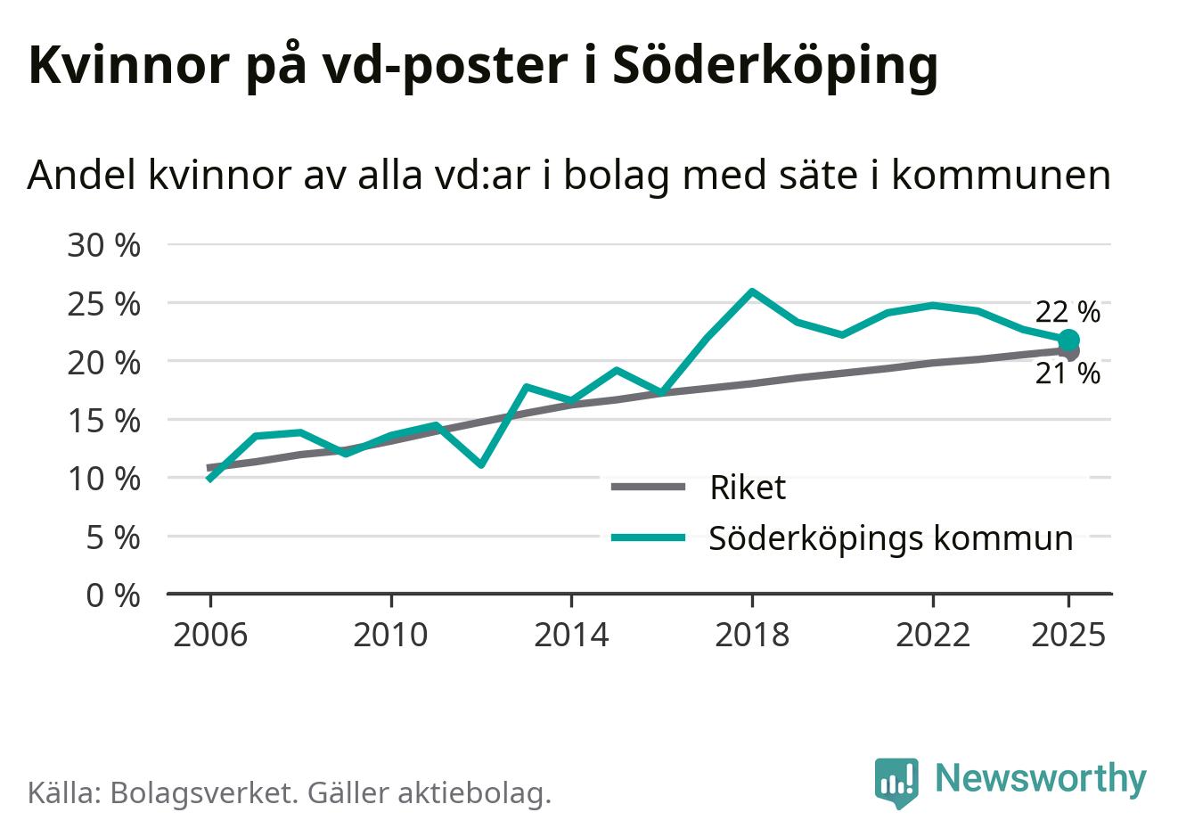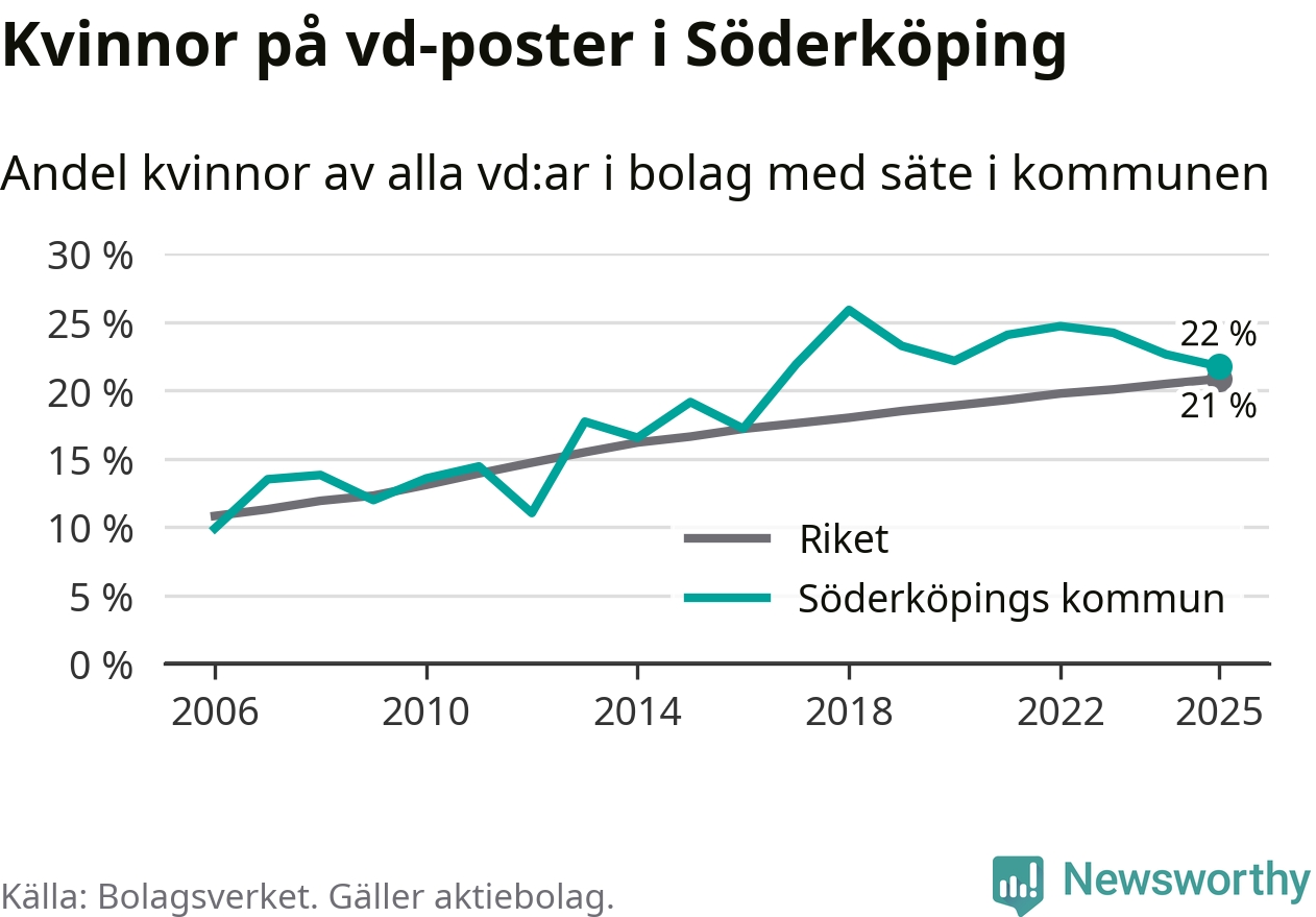 Det är fortfarande män som är vd i nästan fyra av fem bolag i Sverige och könsfördelningen alltså ser ungefär likadan ut i Söderköping. 22 procent är den näst högsta andelen av kommunerna i Östergötland. Högst andel kvinnliga vd:ar i Östergötland har företagen med säte i Vadstena kommun, 26 procent. Lägst är andelen bland företagen med säte i Boxholms kommun, 13 procent. I Boxholm rör det sig om 53 företag totalt och även små förändringar får stora utslag i andelen kvinnliga vd:ar.