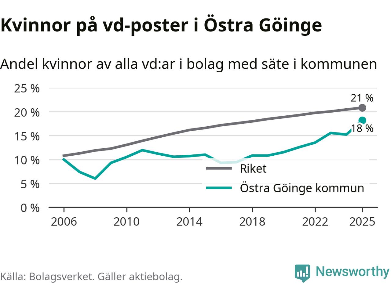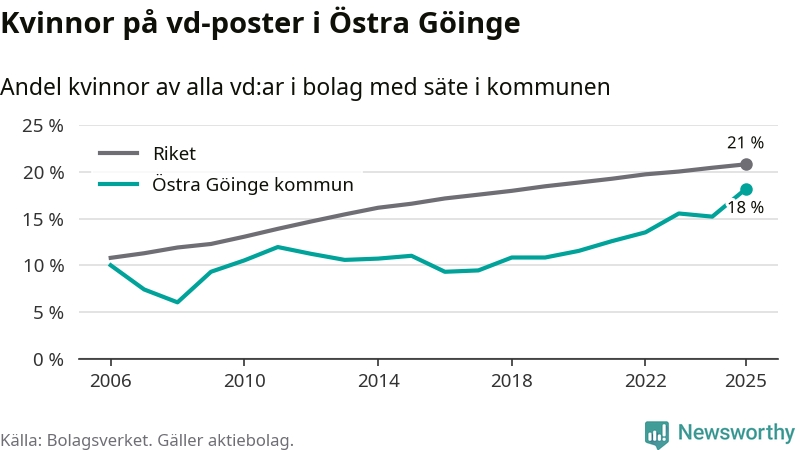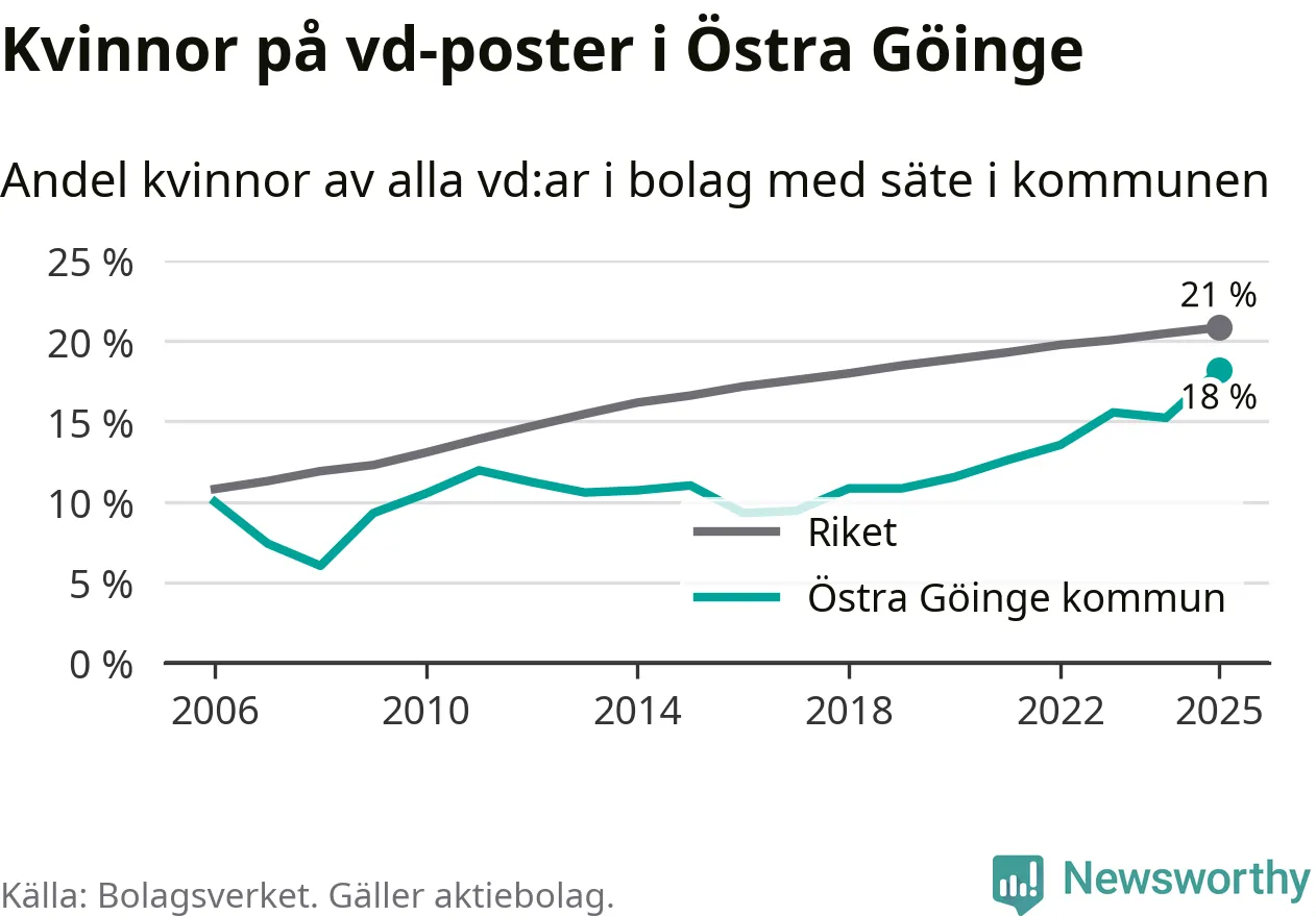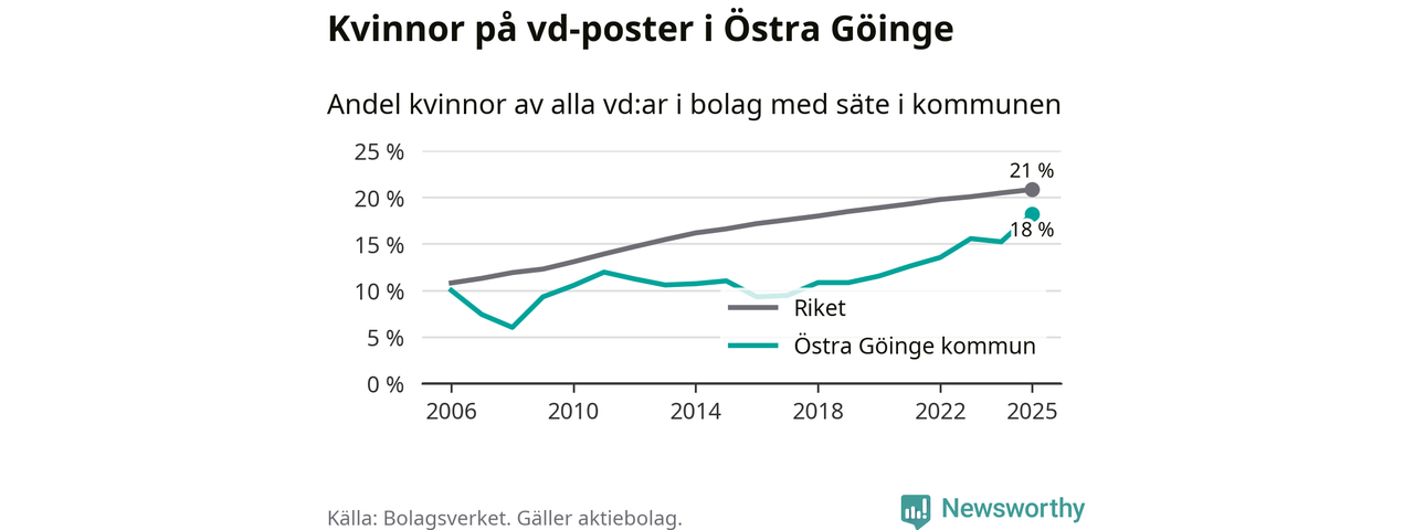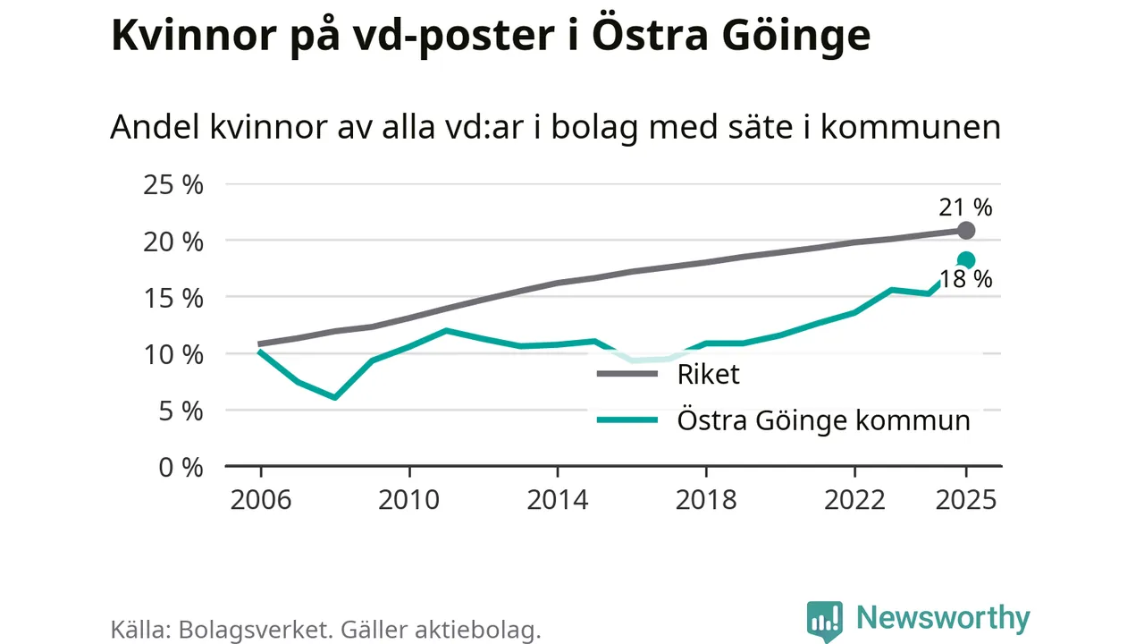 18 procent av aktiebolagen med registrerad vd i Östra Göinge hade en kvinna på posten vid årsskiftet. Det innebär att på varje kvinnlig vd går fyra män.