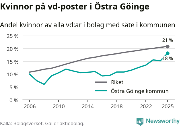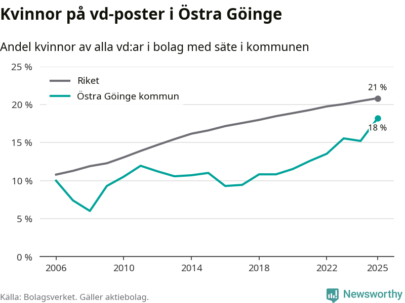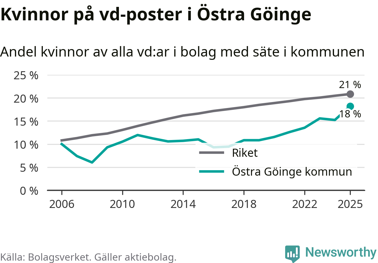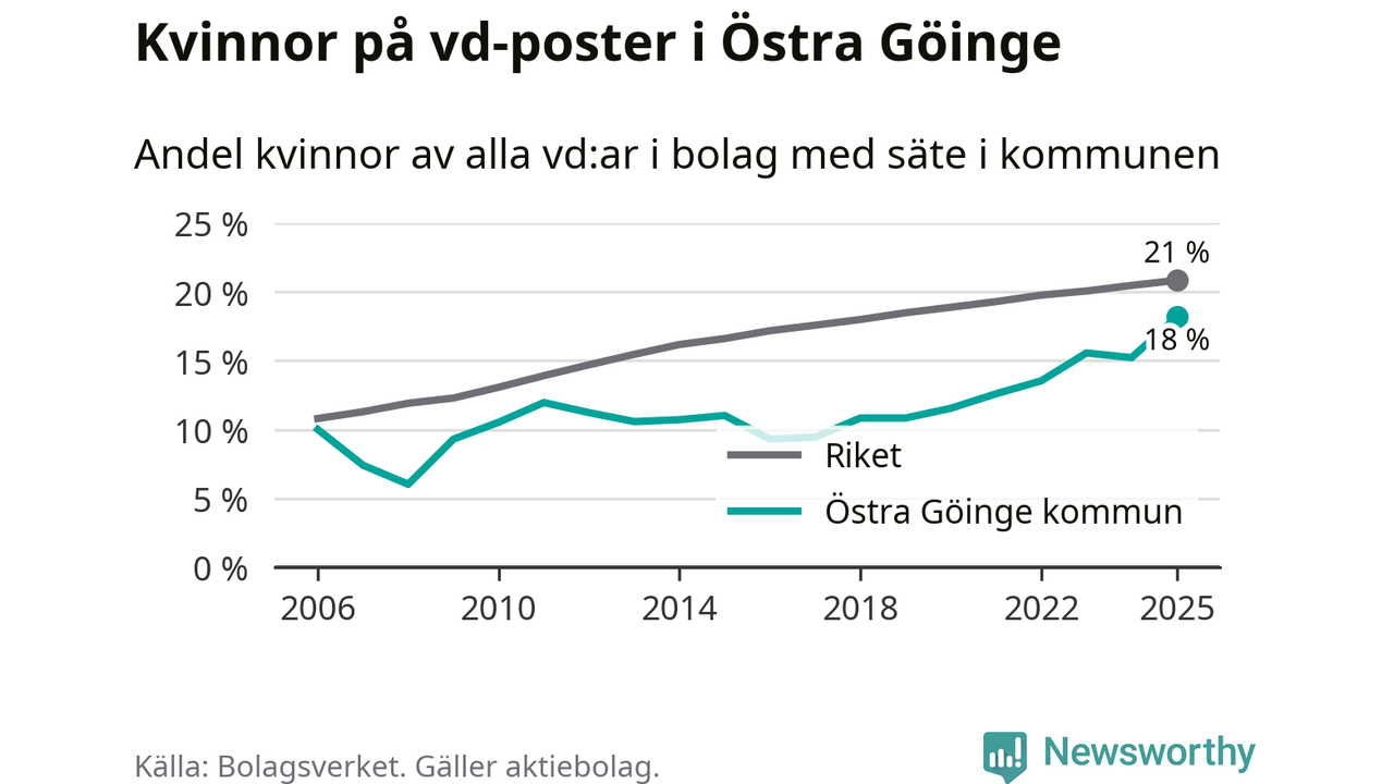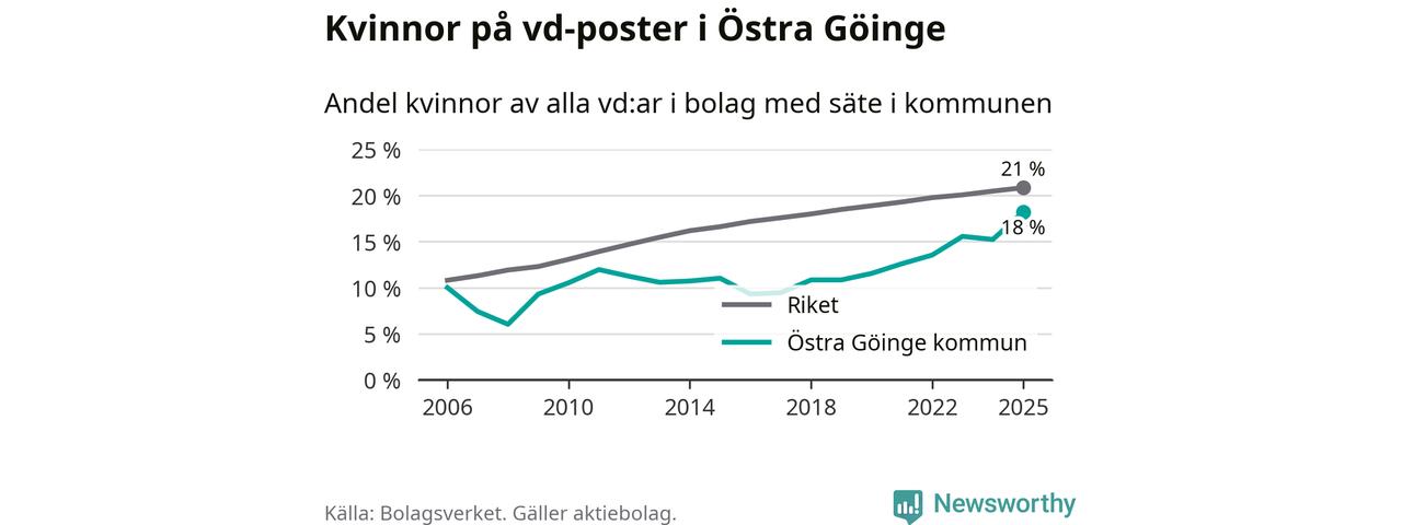 Det är fortfarande män som är vd i nästan fyra av fem bolag i Sverige och i Östra Göinge är det alltså en lägre andel kvinnor på vd-posten. Högst andel kvinnliga vd:ar i Skåne har företagen med säte i Tomelilla kommun, 30 procent. Lägst är andelen bland företagen med säte i Perstorps kommun, 13 procent. I Perstorp rör det sig om 62 företag totalt och även små förändringar får stora utslag i andelen kvinnliga vd:ar.