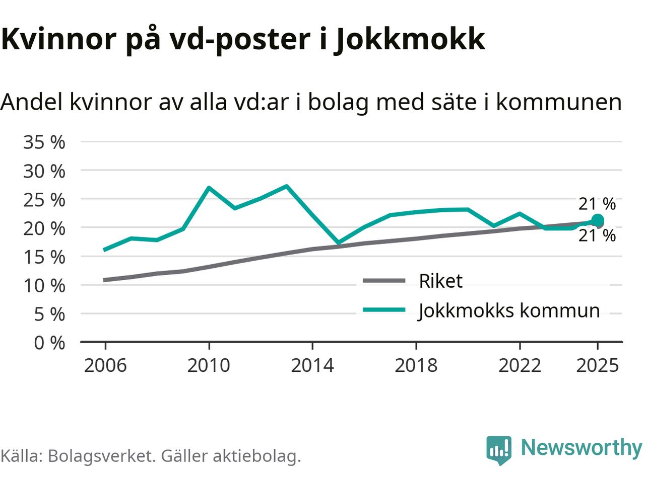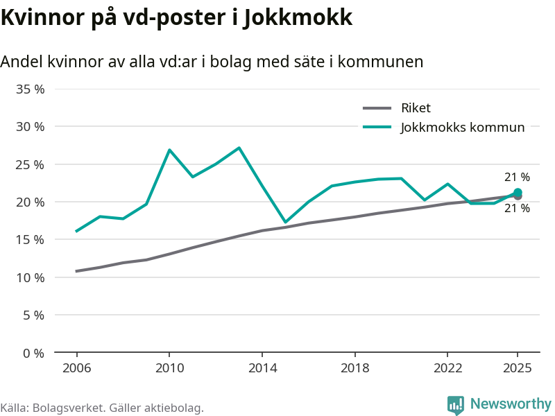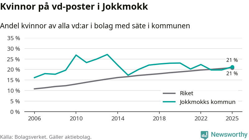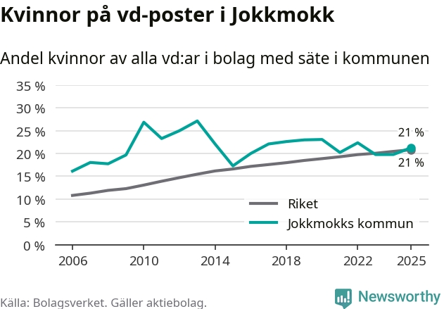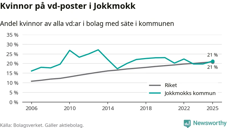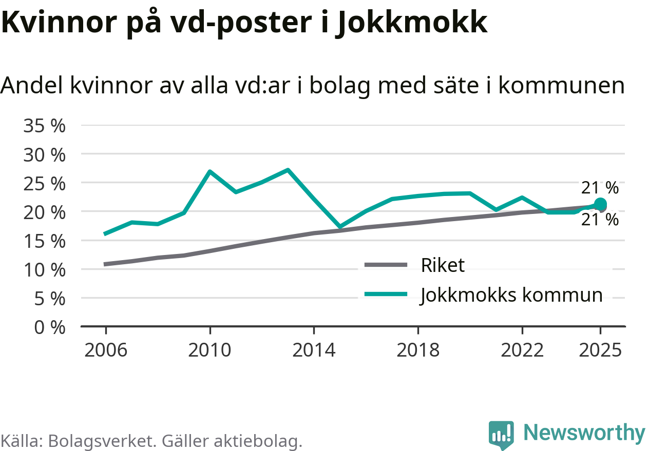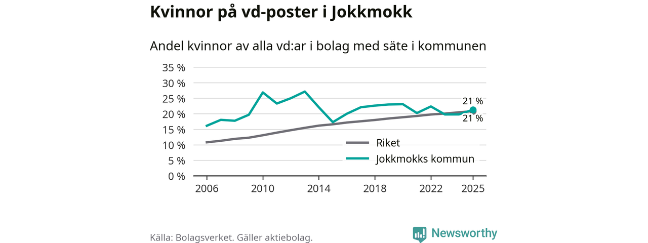 Det är fortfarande män som är vd i nästan fyra av fem bolag i Sverige och könsfördelningen alltså ser ungefär likadan ut i Jokkmokk. Högst andel kvinnliga vd:ar i Norrbotten har företagen med säte i Bodens kommun, 25 procent. Lägst är andelen bland företagen med säte i Övertorneå kommun, 6 procent. I Övertorneå rör det sig om 63 företag totalt och även små förändringar får stora utslag i andelen kvinnliga vd:ar.