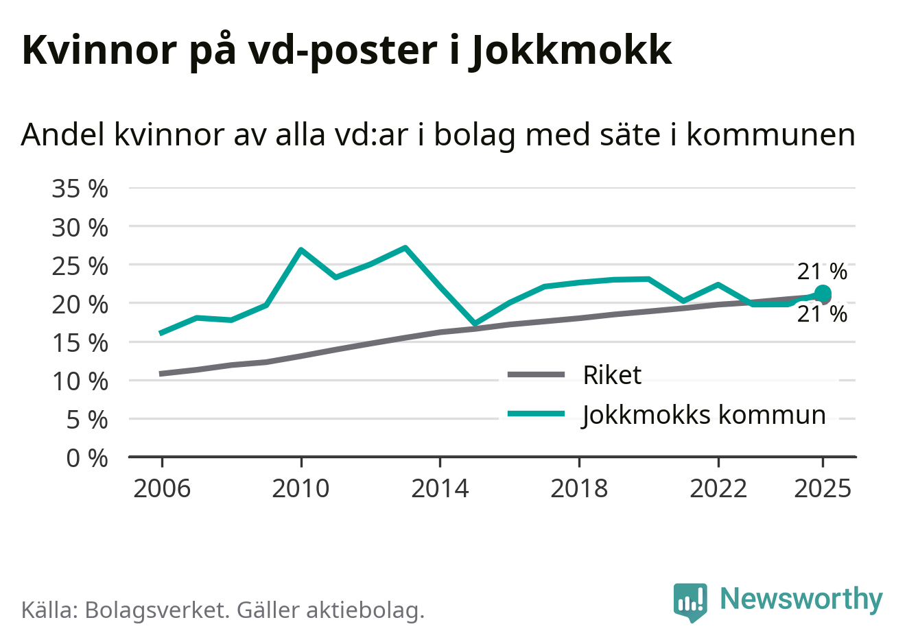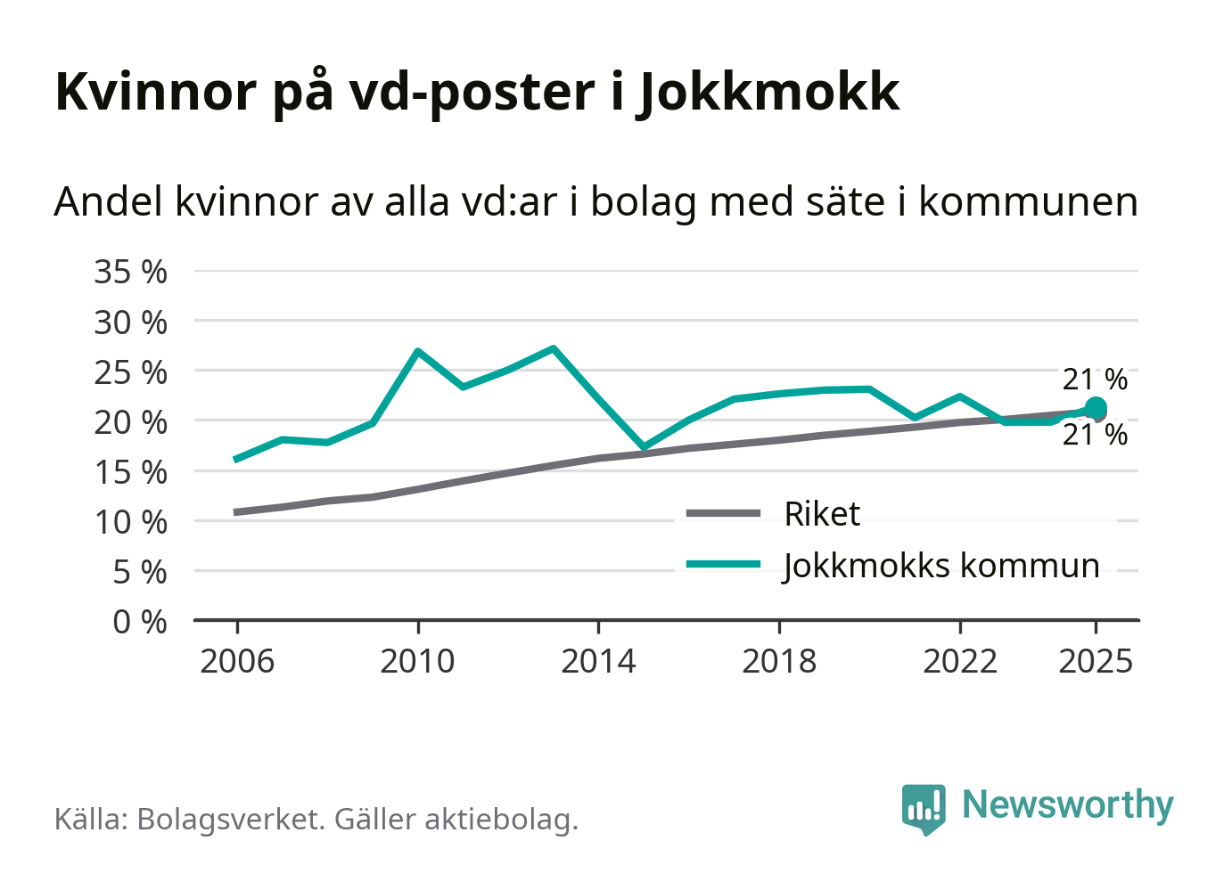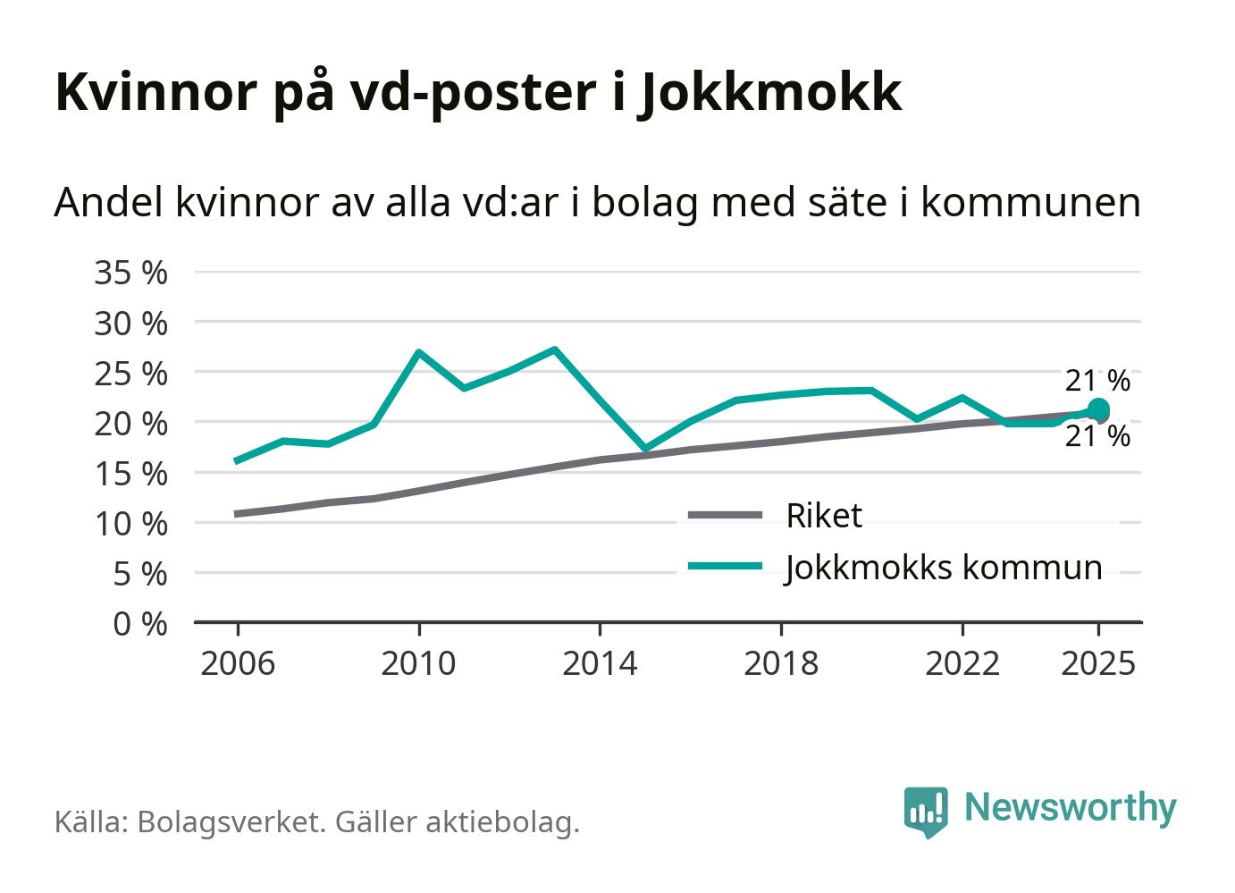 Det är fortfarande män som är vd i nästan fyra av fem bolag i Sverige och könsfördelningen alltså ser ungefär likadan ut i Jokkmokk. Högst andel kvinnliga vd:ar i Norrbotten har företagen med säte i Bodens kommun, 25 procent. Lägst är andelen bland företagen med säte i Övertorneå kommun, 6 procent. I Övertorneå rör det sig om 63 företag totalt och även små förändringar får stora utslag i andelen kvinnliga vd:ar.