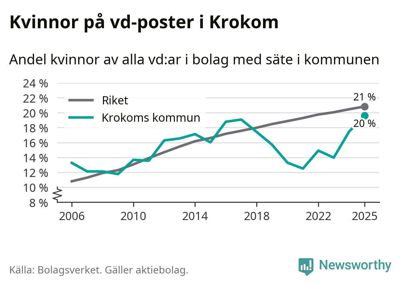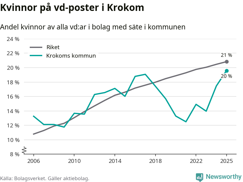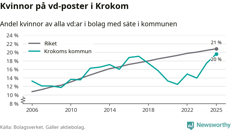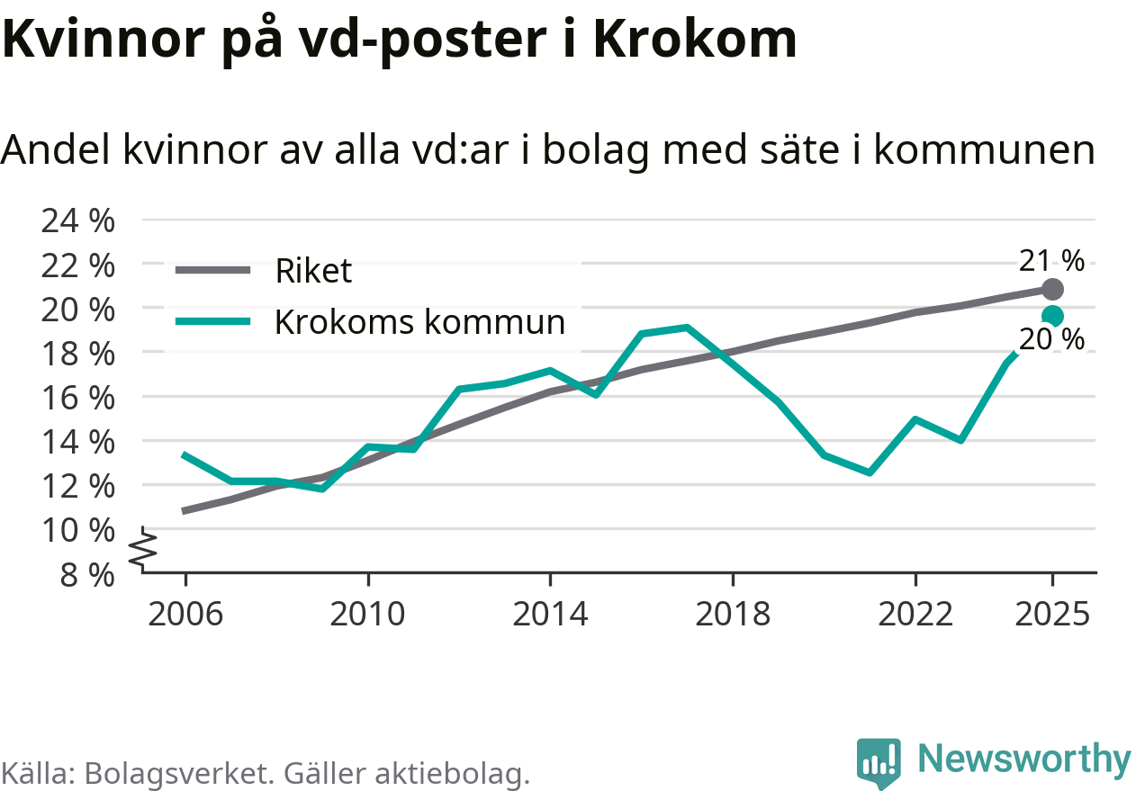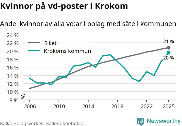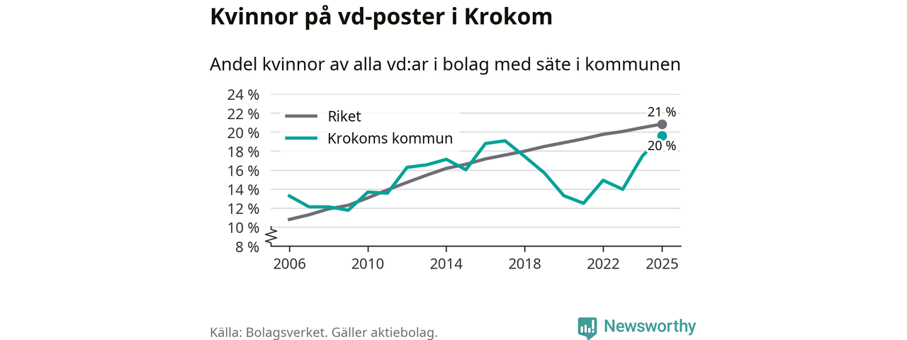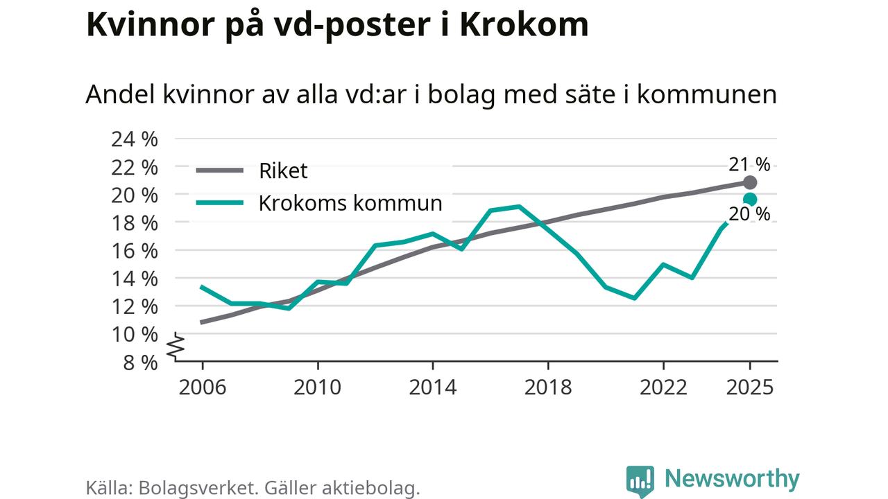 Det är fortfarande män som är vd i nästan fyra av fem bolag i Sverige och könsfördelningen alltså ser ungefär likadan ut i Krokom. Högst andel kvinnliga vd:ar i Jämtland har företagen med säte i Ragunda kommun, 26 procent. Lägst är andelen bland företagen med säte i Bräcke kommun, 15 procent. I både Ragunda och Bräcke rör det sig om relativt få företag totalt och även små förändringar får stora utslag i andelen kvinnliga vd:ar.