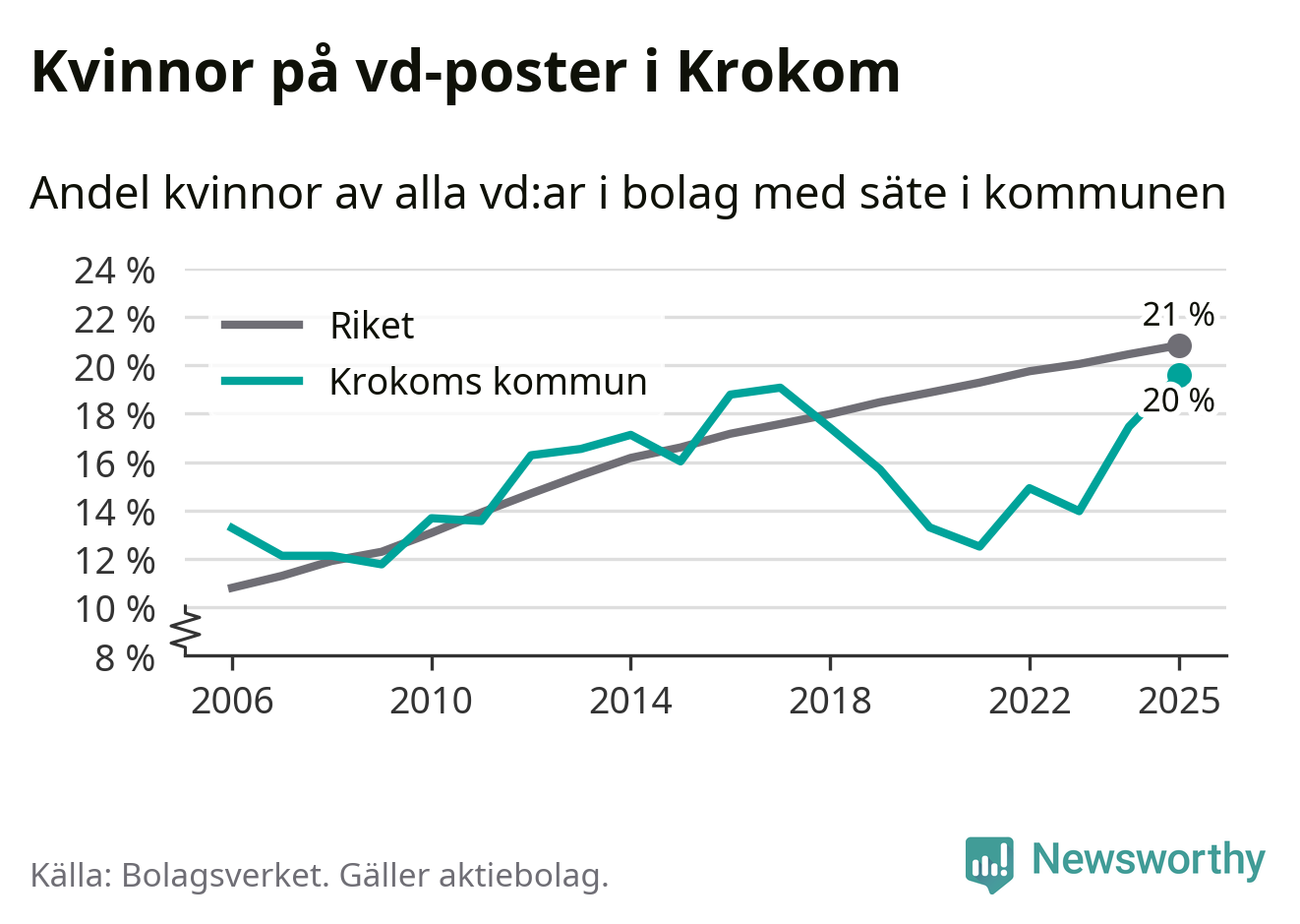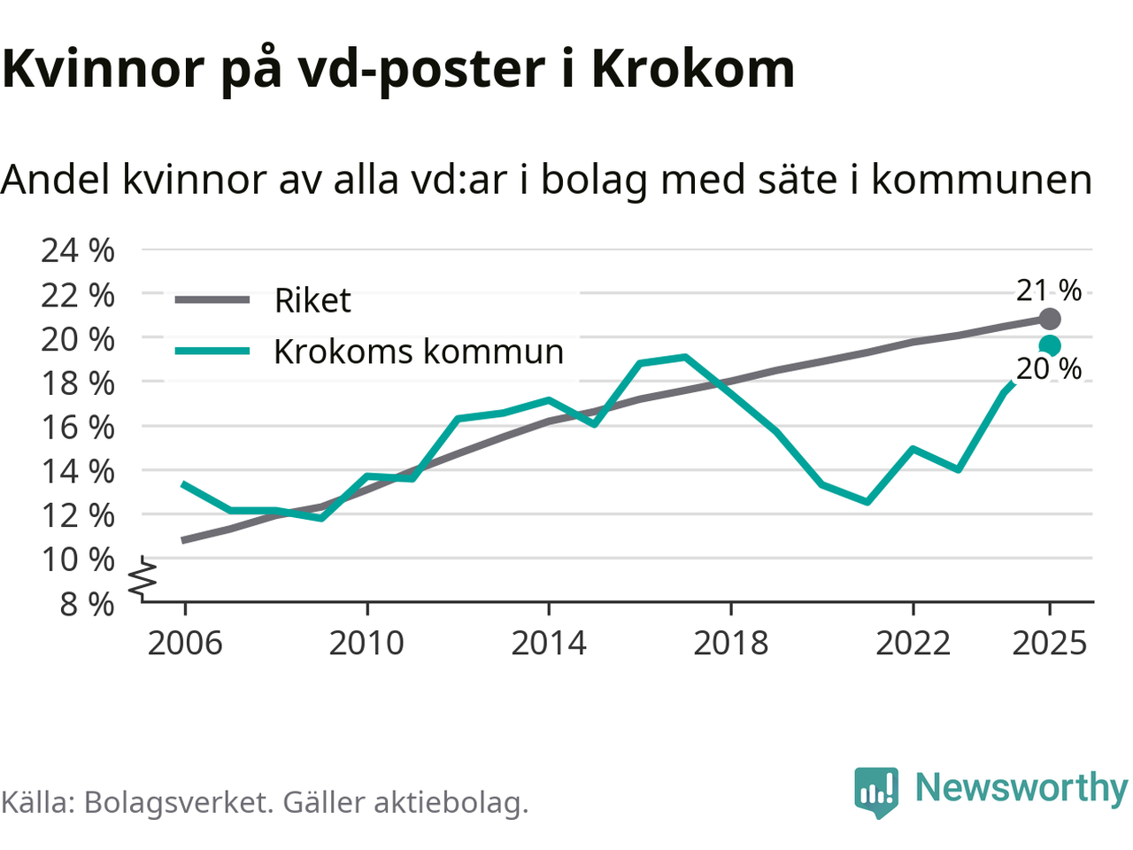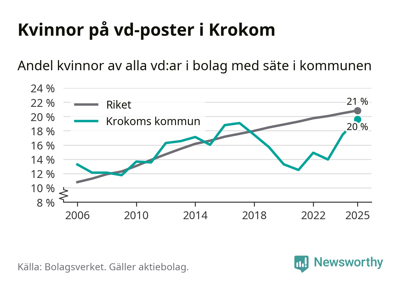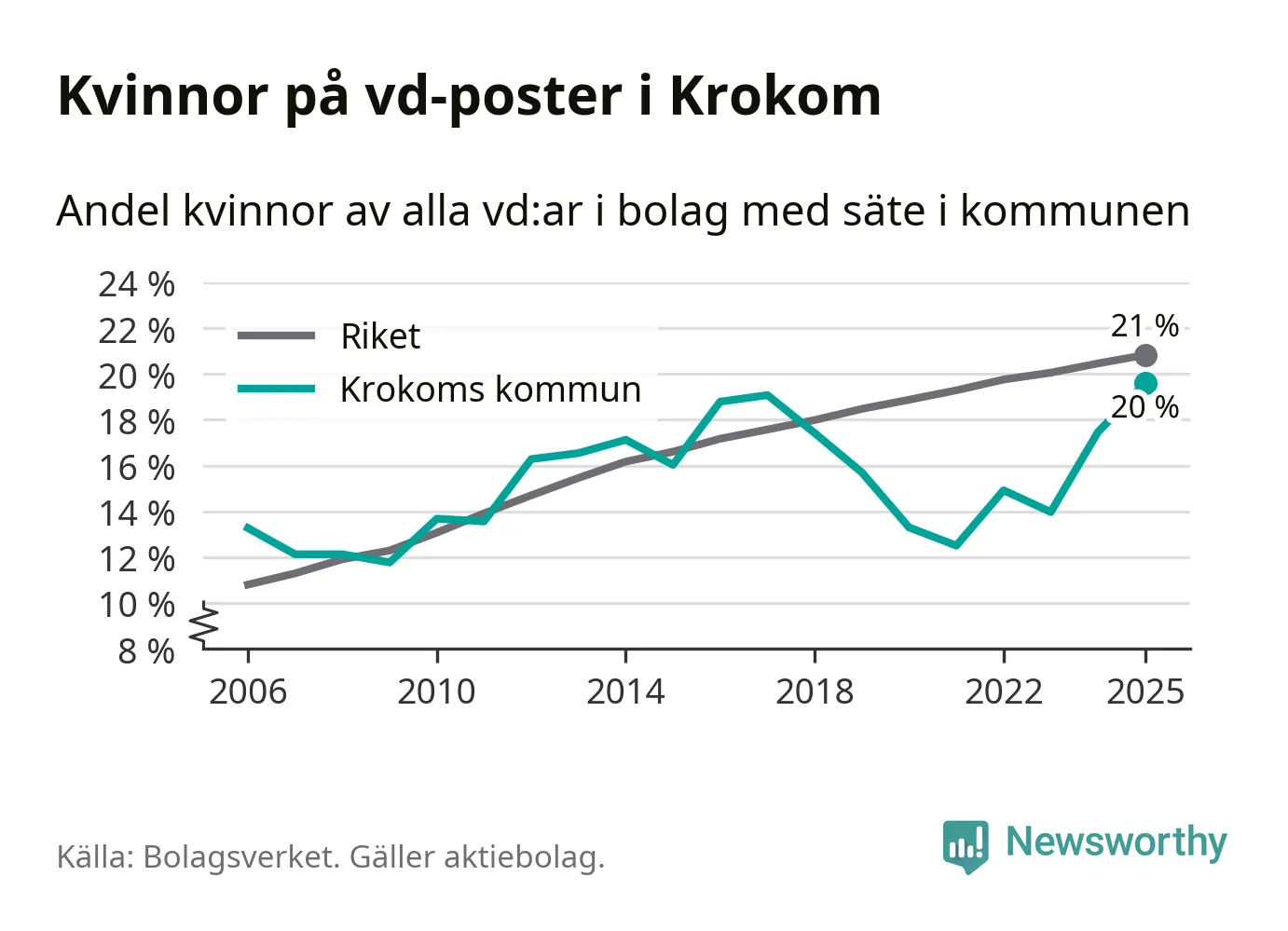 Det är fortfarande män som är vd i nästan fyra av fem bolag i Sverige och könsfördelningen alltså ser ungefär likadan ut i Krokom. Högst andel kvinnliga vd:ar i Jämtland har företagen med säte i Ragunda kommun, 26 procent. Lägst är andelen bland företagen med säte i Bräcke kommun, 15 procent. I både Ragunda och Bräcke rör det sig om relativt få företag totalt och även små förändringar får stora utslag i andelen kvinnliga vd:ar.