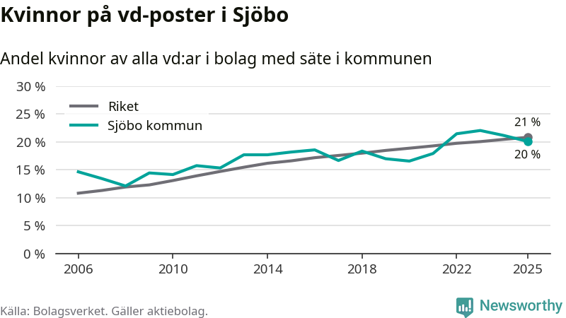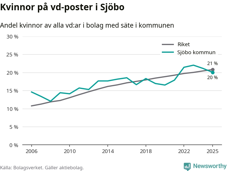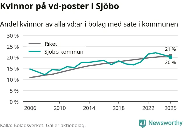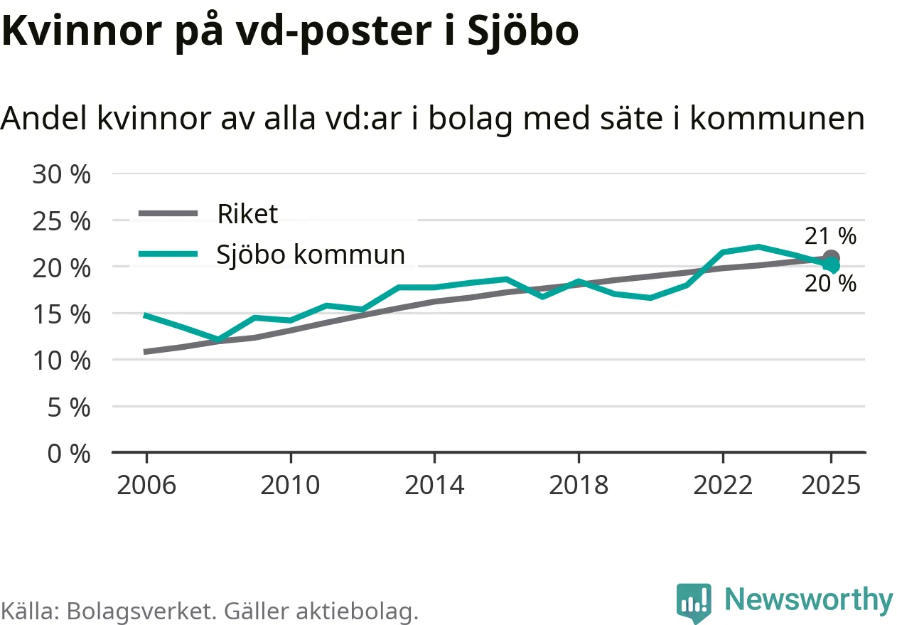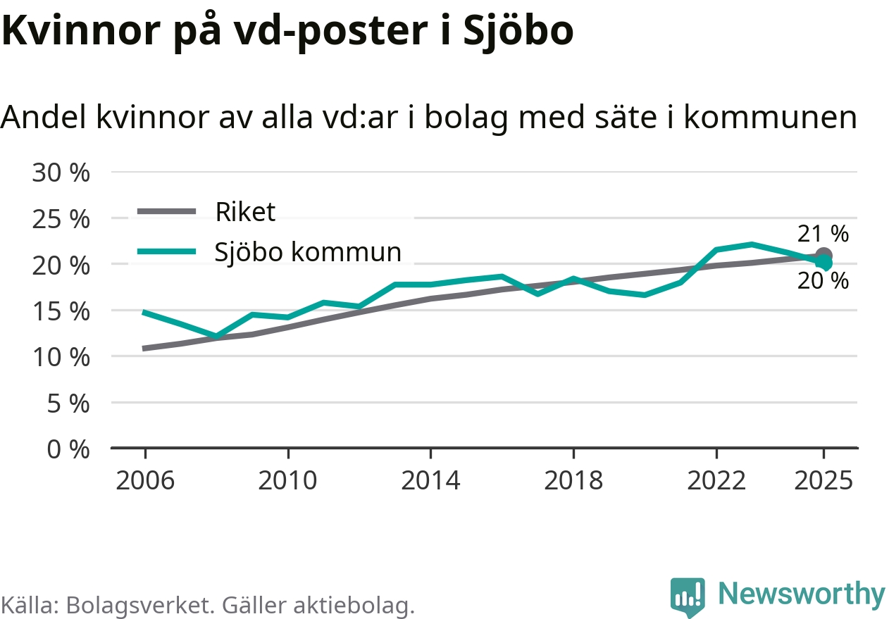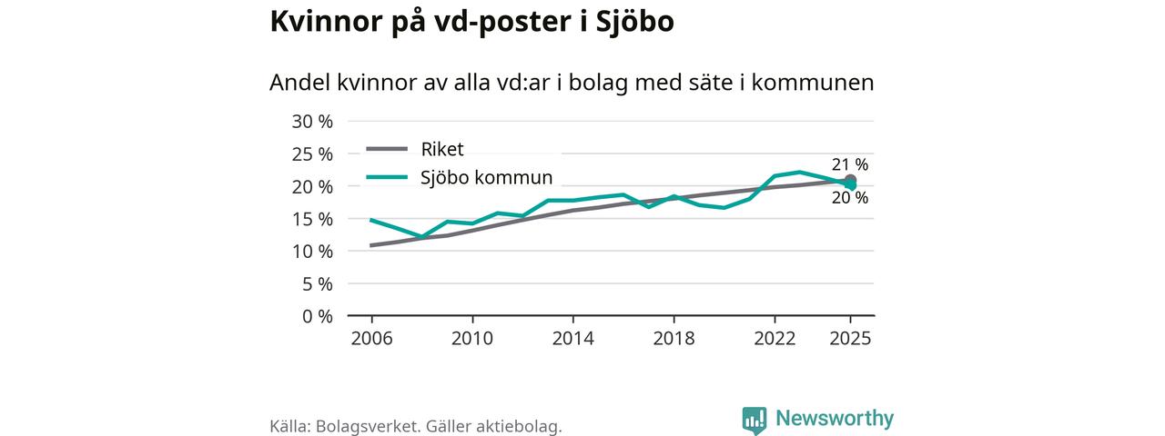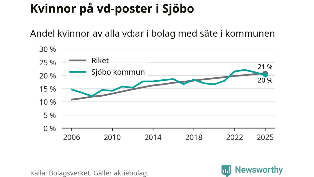 Det är fortfarande män som är vd i nästan fyra av fem bolag i Sverige och könsfördelningen alltså ser ungefär likadan ut i Sjöbo. Högst andel kvinnliga vd:ar i Skåne har företagen med säte i Tomelilla kommun, 30 procent. Lägst är andelen bland företagen med säte i Perstorps kommun, 13 procent. I Perstorp rör det sig om 62 företag totalt och även små förändringar får stora utslag i andelen kvinnliga vd:ar.
